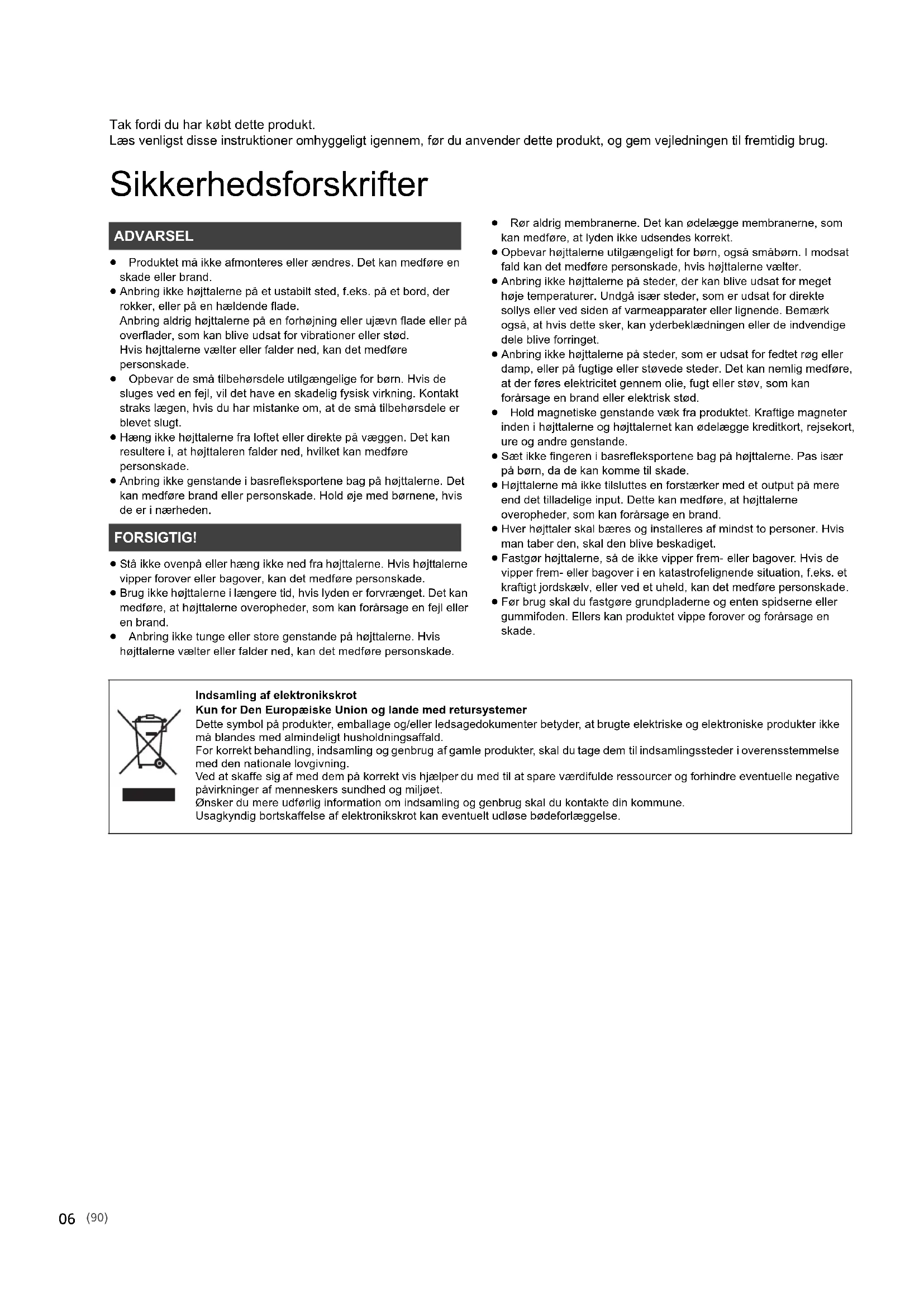 SB-G90_TQBM0081_PPCEBEGGN_mst.book 19 ページ 2017年2月10日 金曜日 午前10時39分Tak fordi du har købt dette produkt. Læs venligst disse instruktioner omhyggeligt igennem, før du anvender dette produkt, og gem vejledningen til fremtidig brug. Sikkerhedsforskrifter ≥ Produktet må ikke afmonteres eller ændres. Det kan medføre en skade eller brand. ≥ Anbring ikke højttalerne på et ustabilt sted, f.eks. på et bord, der rokker, eller på en hældende flade. Anbring aldrig højttalerne på en forhøjning eller ujævn flade eller på overflader, som kan blive udsat for vibrationer eller stød. Hvis højttalerne vælter eller falder ned, kan det medføre personskade. ≥ Opbevar de små tilbehørsdele utilgængelige for børn. Hvis de sluges ved en fejl, vil det have en skadelig fysisk virkning. Kontakt straks lægen, hvis du har mistanke om, at de små tilbehørsdele er blevet slugt. ≥ Hæng ikke højttalerne fra loftet eller direkte på væggen. Det kan resultere i, at højttaleren falder ned, hvilket kan medføre personskade. ≥ Anbring ikke genstande i basrefleksportene bag på højttalerne. Det kan medføre brand eller personskade. Hold øje med børnene, hvis de er i nærheden. ≥ Stå ikke ovenpå eller hæng ikke ned fra højttalerne. Hvis højttalerne vipper forover eller bagover, kan det medføre personskade. ≥ Brug ikke højttalerne i længere tid, hvis lyden er forvrænget. Det kan medføre, at højttalerne overopheder, som kan forårsage en fejl eller en brand. ≥ Anbring ikke tunge eller store genstande på højttalerne. Hvis højttalerne vælter eller falder ned, kan det medføre personskade. ≥ Rør aldrig membranerne. Det kan ødelægge membranerne, som kan medføre, at lyden ikke udsendes korrekt. ≥ Opbevar højttalerne utilgængeligt for børn, også småbørn. I modsat fald kan det medføre personskade, hvis højttalerne vælter. ≥ Anbring ikke højttalerne på steder, der kan blive udsat for meget høje temperaturer. Undgå især steder, som er udsat for direkte sollys eller ved siden af varmeapparater eller lignende. Bemærk også, at hvis dette sker, kan yderbeklædningen eller de indvendige dele blive forringet. ≥ Anbring ikke højttalerne på steder, som er udsat for fedtet røg eller damp, eller på fugtige eller støvede steder. Det kan nemlig medføre, at der føres elektricitet gennem olie, fugt eller støv, som kan forårsage en brand eller elektrisk stød. ≥ Hold magnetiske genstande væk fra produktet. Kraftige magneter inden i højttalerne og højttalernet kan ødelægge kreditkort, rejsekort, ure og andre genstande. ≥ Sæt ikke fingeren i basrefleksportene bag på højttalerne. Pas især på børn, da de kan komme til skade. ≥ Højttalerne må ikke tilsluttes en forstærker med et output på mere end det tilladelige input. Dette kan medføre, at højttalerne overopheder, som kan forårsage en brand. ≥ Hver højttaler skal bæres og installeres af mindst to personer. Hvis man taber den, skal den blive beskadiget. ≥ Fastgør højttalerne, så de ikke vipper frem- eller bagover. Hvis de vipper frem- eller bagover i en katastrofelignende situation, f.eks. et kraftigt jordskælv, eller ved et uheld, kan det medføre personskade. ≥ Før brug skal du fastgøre grundpladerne og enten spidserne eller gummifoden. Ellers kan produktet vippe forover og forårsage en skade. ADVARSEL FORSIGTIG! Indsamling af elektronikskrot Kun for Den Europæiske Union og lande med retursystemer Dette symbol på produkter, emballage og/eller ledsagedokumenter betyder, at brugte elektriske og elektroniske produkter ikke må blandes med almindeligt husholdningsaffald. For korrekt behandling, indsamling og genbrug af gamle produkter, skal du tage dem til indsamlingssteder i overensstemmelse med den nationale lovgivning. Ved at skaffe sig af med dem på korrekt vis hjælper du med til at spare værdifulde ressourcer og forhindre eventuelle negative påvirkninger af menneskers sundhed og miljøet. Ønsker du mere udførlig information om indsamling og genbrug skal du kontakte din kommune. Usagkyndig bortskaffelse af elektronikskrot kan eventuelt udløse bødeforlæggelse.