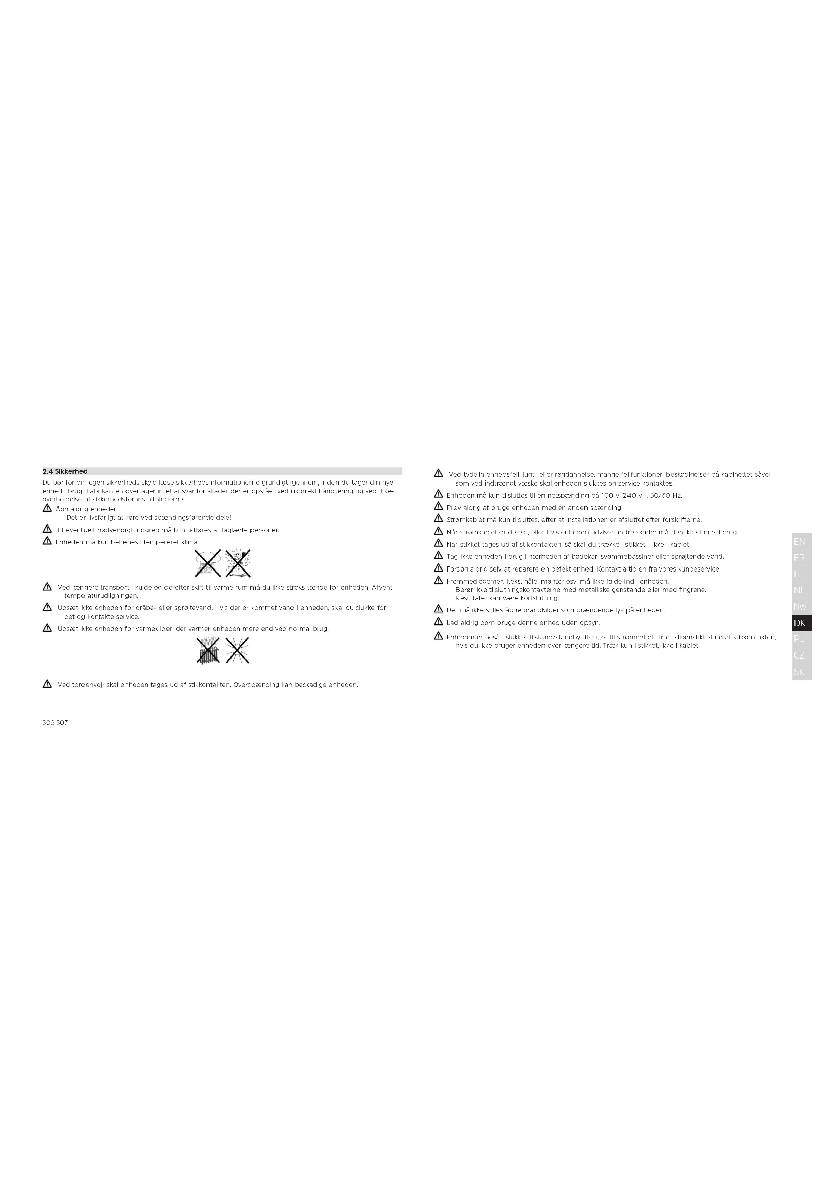 Du bør for din egen sikkerheds skyld læse sikkerhedsinformationerne grundigt igennem, inden du tager din nye enhed i brug. Fabrikanten overtager intet ansvar for skader der er opstået ved ukorrekt håndtering og ved ikke- overholdelse af sikkerhedsforanstaltningerne. Åbn aldrig enheden! Det er livsfarligt at røre ved spændingsførende dele! Et eventuelt nødvendigt indgreb må kun udføres af faglærte personer. Enheden må kun betjenes i tempereret klima. Ved længere transport i kulde og dereer ski til varme rum må du ikke straks tænde for enheden. Afvent temperaturudligningen. Udsæt ikke enheden for dråbe- eller sprøjtevand. Hvis der er kommet vand i enheden, skal du slukke for det og kontakte service. Udsæt ikke enheden for varmekilder, der varmer enheden mere end ved normal brug. Ved tordenvejr skal enheden tages ud af stikkontakten. Overspænding kan beskadige enheden. BDA_DIGITRADIO_600_630.indd 306-307 22/06/2018 09:32308 309