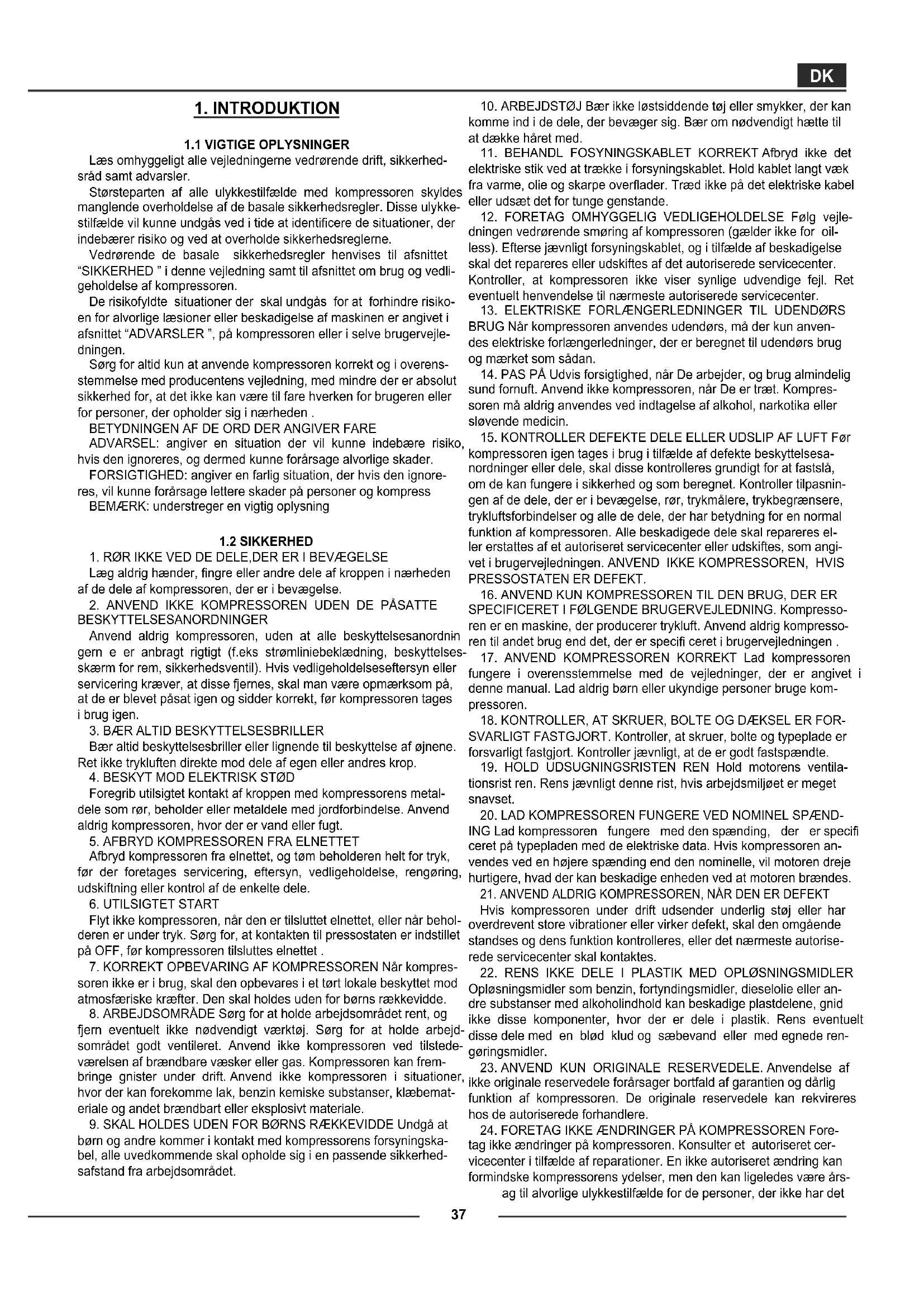 Læs omhyggeligt alle vejledningerne vedrørende drift, sikkerhed- sråd samt advarsler. Størsteparten af alle ulykkestilfælde med kompressoren skyldes manglende overholdelse af de basale sikkerhedsregler. Disse ulykke- VWLOIOGHYLONXQQHXQGJnVYHGLWLGHDWLGHQWL¿FHUHGHVLWXDWLRQHUGHU indebærer risiko og ved at overholde sikkerhedsreglerne. Vedrørende de basale sikkerhedsregler henvises til afsnittet “SIKKERHED ” i denne vejledning samt til afsnittet om brug og vedli- geholdelse af kompressoren. De risikofyldte situationer der skal undgås for at forhindre risiko- en for alvorlige læsioner eller beskadigelse af maskinen er angivet i afsnittet “ADVARSLER ”, på kompressoren eller i selve brugervejle- dningen. Sørg for altid kun at anvende kompressoren korrekt og i overens- stemmelse med producentens vejledning, med mindre der er absolut sikkerhed for, at det ikke kan være til fare hverken for brugeren eller for personer, der opholder sig i nærheden . BETYDNINGEN AF DE ORD DER ANGIVER FARE ADVARSEL: angiver en situation der vil kunne indebære risiko, hvis den ignoreres, og dermed kunne forårsage alvorlige skader. FORSIGTIGHED: angiver en farlig situation, der hvis den ignore- res, vil kunne forårsage lettere skader på personer og kompress BEMÆRK: understreger en vigtig oplysning