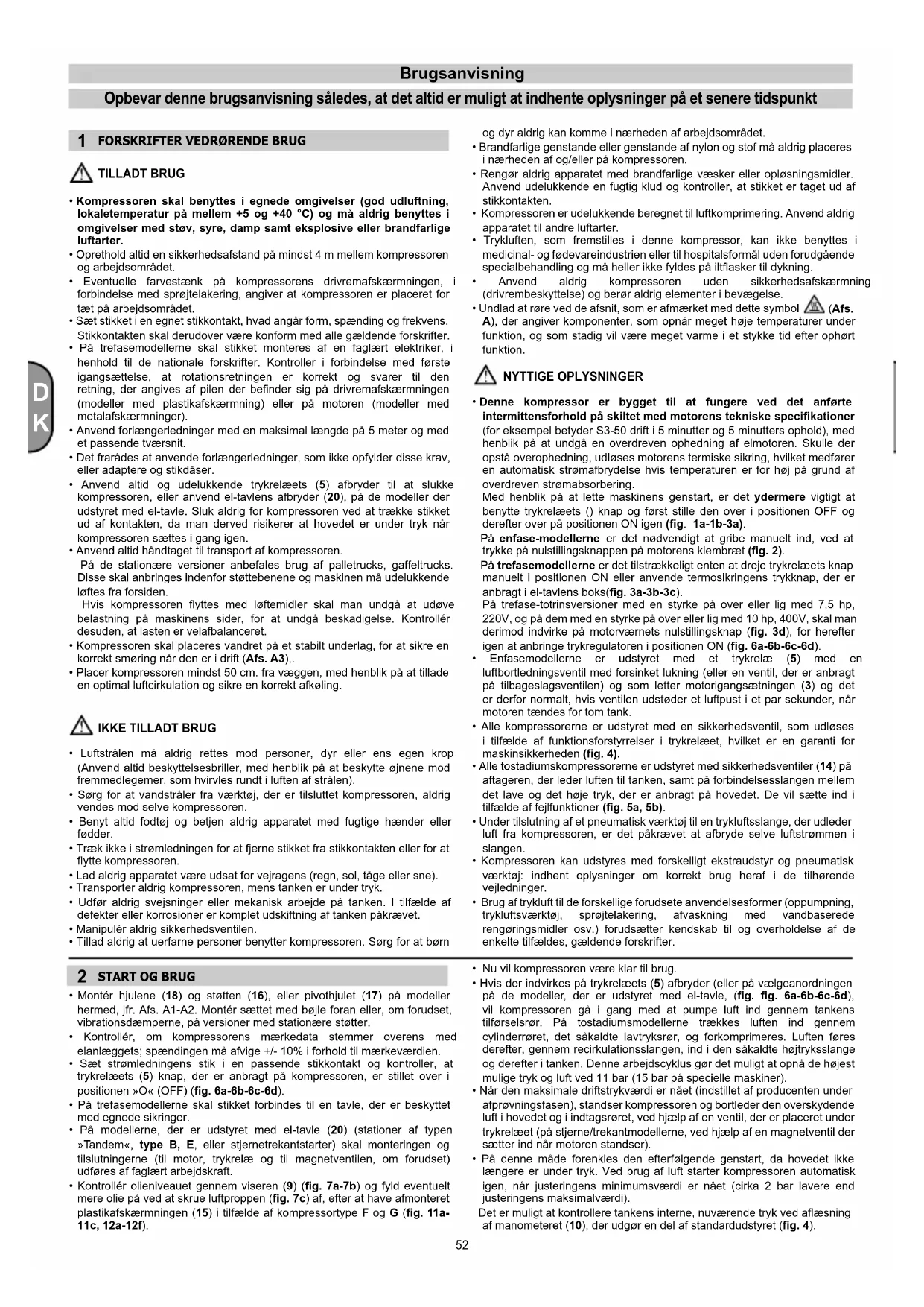 luk og tænd igen med trykrelæets knap (5) (g. 1a). Genopret termomagnetsikringen (g. 2) og start igen (g. 1b). Kontakt assistancecenteret, hvis ulempen varer ved. Modeller med stjerne-trekantsstarter: tryk på termomagnetens knap, der er anbragt i el-tavlens boks (20) (g. 3c) og start igen (g. 6d) Kontakt assistancecenteret, hvis ulempen varer ved. Trefase-totrinsversioner med styrke på over eller lig med 7,5 hp, 220V, Trefase-totrinsversioner med styrke på over eller lig med 10 hp, 400V, indvirk på motorværnets nulstillingsknap (g. 3d), for herefter igen at anbringe trykregulatoren i positionen ON (g. 6a-6b-6c-6d). Andre modeller: sluk og tænd igen med trykrelæets (5) knap (g. 1a-1b). Kontakt assistancecenteret, hvis ulempen varer ved. Elektriske problemer. Kontakt assistancecenteret. Kompressoren vibrerer under driften og motorens lyd er hakkende Hvis den standser, går den ikke i gang igen, på trods af at motoren kan høres. Monofasemotorer: Defekt kondensator. Lad kondensatoren udskifte. Trefasemotorer: En af faserne i trefaseforsyningen mangler, sandsynligvis afbrudt af en sikring. Undersøg sikringerne i el-tavlen (20) eller el- kassen og uskift eventuelt skadede sikringer (g. 19). Unormal olieforekomst i systemet. Overdreven oliepåfyldning i gruppen. Kontroller olieniveauet (9). Segmentslitage. Kontakt assistancecenteret. Kondensudslip fra aedningshanen (4). Snavs/sandforekomster i hanen. Rengør hanen. Ethvert andet indgreb skal udføres af et af de autoriserede assistancecentre, idet originale reservedele er påkrævede. Maskinsikkerheden kan kompromitteres og garantien bortfalder automatisk hvis der udføres maskinændringer.55