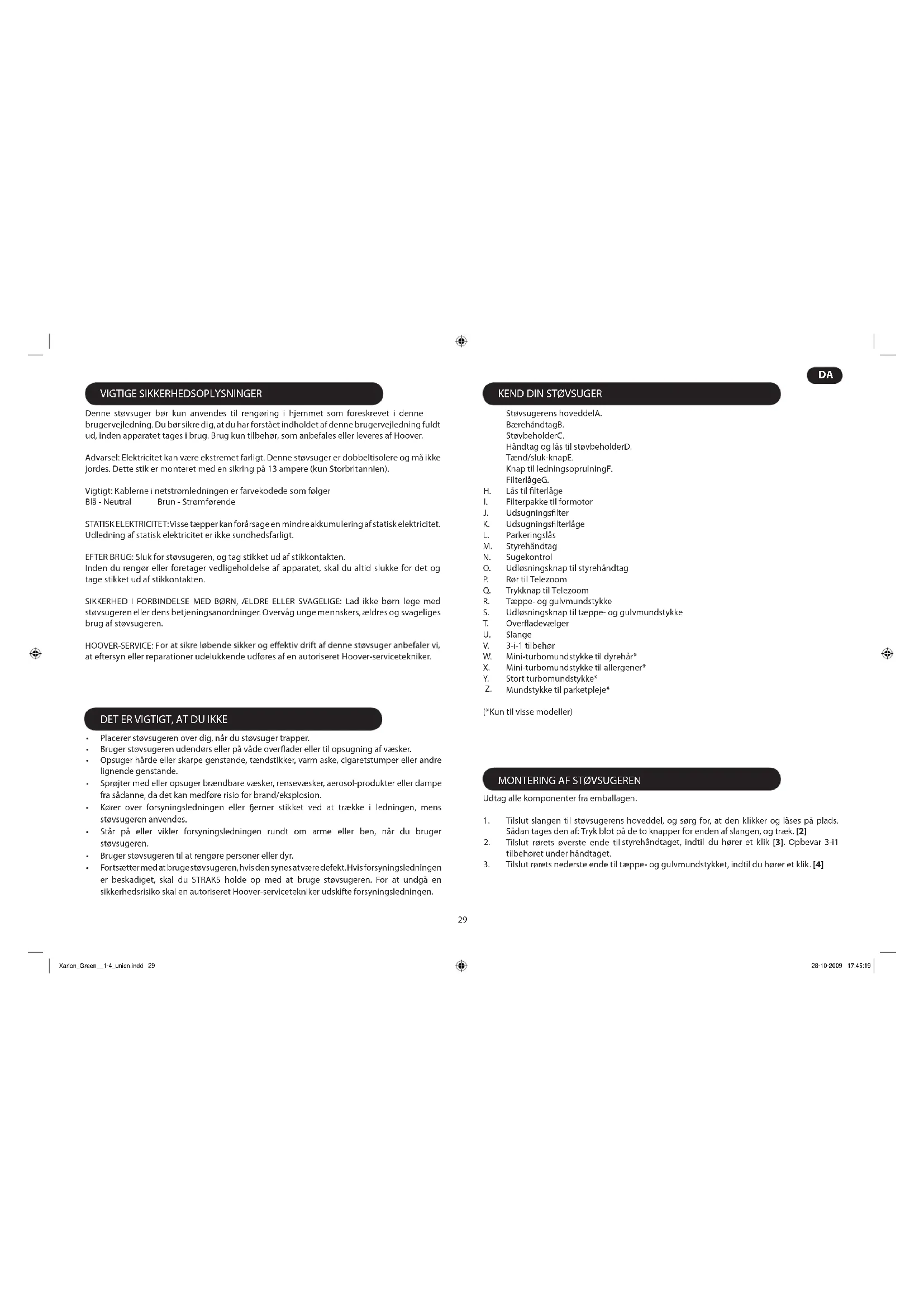 (*Kun til visse modeller) Udtag alle komponenter fra emballagen. Tilslut slangen til støvsugerens hoveddel, og sørg for, at den klikker og låses på plads. 1. Sådan tages den af: Tryk blot på de to knapper for enden af slangen, og træk. [2] Tilslut rørets øverste ende til styrehåndtaget, indtil du hører et klik 2. [3]. Opbevar 3-i1 tilbehøret under håndtaget. Tilslut rørets nederste ende til tæppe- og gulvmundstykket, indtil du hører et klik. 3. [4] Placerer støvsugeren over dig, når du støvsuger trapper.• Bruger støvsugeren udendørs eller på våde overader eller til opsugning af væsker.• Opsuger hårde eller skarpe genstande, tændstikker, varm aske, cigaretstumper eller andre • lignende genstande. Sprøjter med eller opsuger brændbare væsker, rensevæsker, aerosol-produkter eller dampe • fra sådanne, da det kan medføre risio for brand/eksplosion. Kører over forsyningsledningen eller erner stikket ved at trække i ledningen, mens • støvsugeren anvendes. Står på eller vikler forsyningsledningen rundt om arme eller ben, når du bruger • støvsugeren. Bruger støvsugeren til at rengøre personer eller dyr.• Fortsætter med at bruge støvsugeren, hvis den synes at være defekt. Hvis forsyningsledningen • er beskadiget, skal du STRAKS holde op med at bruge støvsugeren. For at undgå en sikkerhedsrisiko skal en autoriseret Hoover-servicetekniker udskifte forsyningsledningen. Xarion_Green__1-4_union.indd 29 28-10-2009 17:45:19 Udsugningslterlåge Z.30