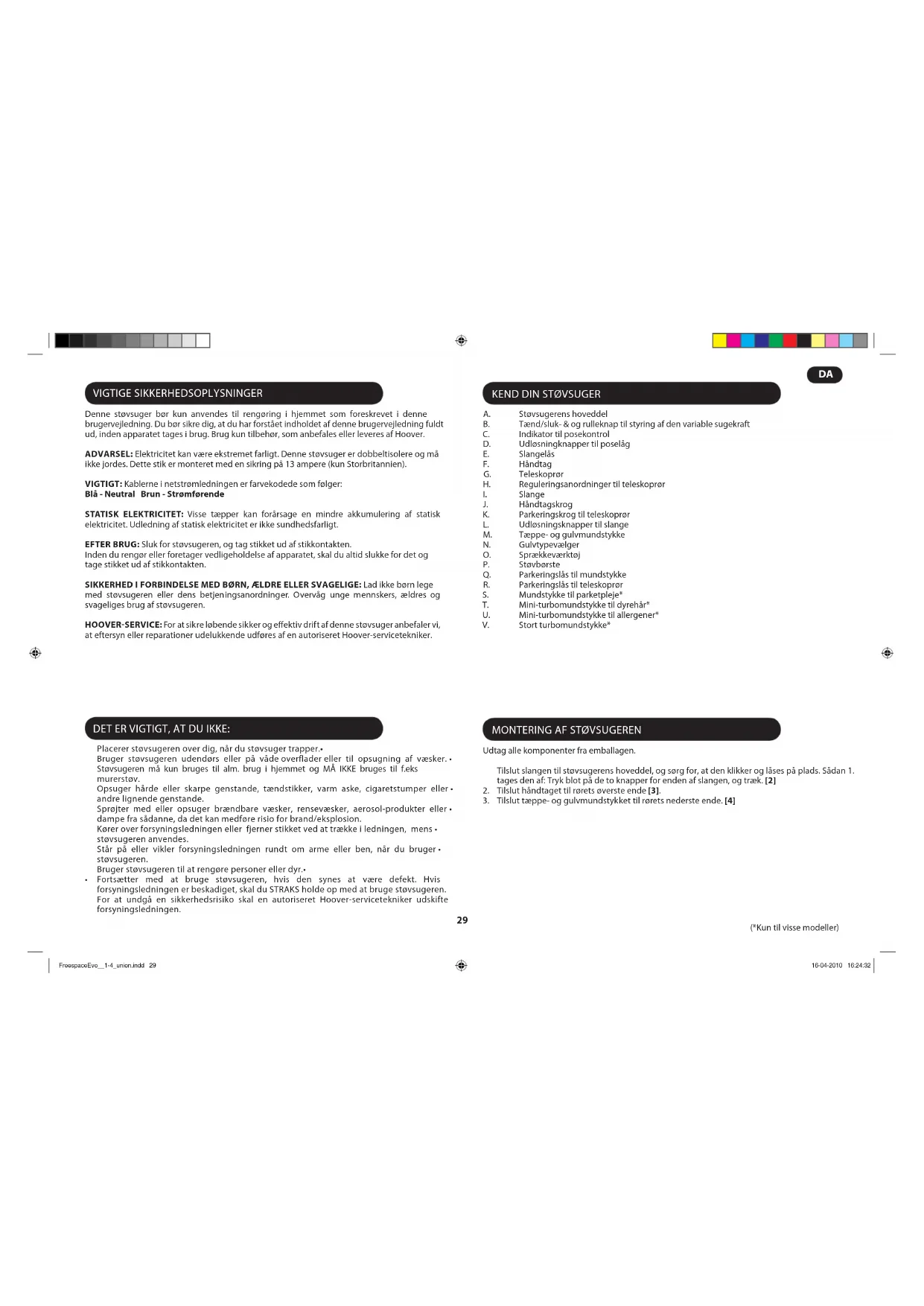 (*Kun til visse modeller) TILBEHØR Se modelspecikationen på mærkaten på emballagen for inkludering af tilbehør til de enkelte modeller. Alt tilbehør kan monteres på slangens håndtag eller for enden af teleskoprøret. Sprækkeværktøj – Til hjørner og områder, der er vanskelige at komme til. Tag fugemundstykket ud af tilbehørsholderen [24], og sæt det på slangehåndtaget [25] eller på teleskoprøret. Støvbørste – Til bogreoler, rammer, tastaturer og andre sarte områder. Tag støvbørsten ud af tilbehørsholderen [24], og sæt den på fugemundstykket. Sæt derefter enheden fast på slangehåndtaget [25] eller på teleskoprøret. Mundstykke til parketpleje* – Til parketgulve og andre sarte gulve.[1S] Mini-turbomundstykke til dyrehår* - Brug mini-turbomundstykket på trapper eller til rengøring af tekstiloverader i dybden og andre områder, der er svære at rengøre. Især velegnet til ernelse af dyrehår. [1T] Mini-turbomundstykke til allergener* – Brug mini-turbomundstykket på trapper eller til rengøring af tekstiloverader i dybden og andre områder, der er svære at rengøre. Især velegnet til ernelse af allergener. [1U] Stort turbomundstykke* – Brug Gran Turbo-mundstykket til dybderengøring af tæpper. [1V] VIGTIGT: Brug ikke Grand Turbo- eller Mini Turbo-mundstykket på tæpper med lange frynser, dyreskind og gulvtæpper med en luv, der er dybere end 15 mm. Hold ikke mundstykket stille, mens børsten roterer. BRUGERENS CHECKLISTE Hvis du får et problem med produktet, skal du udfylde denne enkle brugercheckliste, før du ringer til den lokale Hoover-service. Virker strømforsyningen til støvsugeren? Kontroller venligst på et andet elektrisk • apparat. Er støvposen overfyldt? Se venligst under “Vedligeholdelse af støvsugeren”.• Er filteret tilstoppet? Se venligst under “Vedligeholdelse af støvsugeren”.• Er slangen eller mundstykket tilstoppet? Se ”Sådan fjerner du en tilstopning fra • systemet”. Er støvsugeren overophedet? Hvis den er, vil det vare ca. 45 minutter at nulstille • automatisk. VIGTIGE OPLYSNINGER Hoover-reservedele og -forbrugsvarer Udskift altid dele med ægte Hoover-reservedele. Disse fås fra den lokale Hoover-forhandler eller direkte fra Hoover, Når du bestiller dele, skal du altid opgive modelnummer. Forbrugsvarer Papirspose: H69 - 35601053• Mikrofiberpose: H71 - 35601069 (Hvis tilgængelige)• Mikrofilter til udblæsningen: T102 - 35601056• Hepa motor Præ Filter: S107 - 35601057• Reservedele Tæppe- og gulvmundstykke - G72 - 4845090• Stofslange: - D118 - 35601054• Fleksibel slange - D122 - 35601055• Mundstykke til parketpleje: G90PCB - 35600934• Allergivenligt Mini-turbomundstykke: J32 - 35600817• Stort turbomundstykke: J31 - 35600816• Hoover-service Hvis du ønsker service på dine produkter, skal du kontakte det lokale Hoover-servicekontor. FreespaceEvo__1-4_union.indd 31 16-04-2010 16:24:3232
