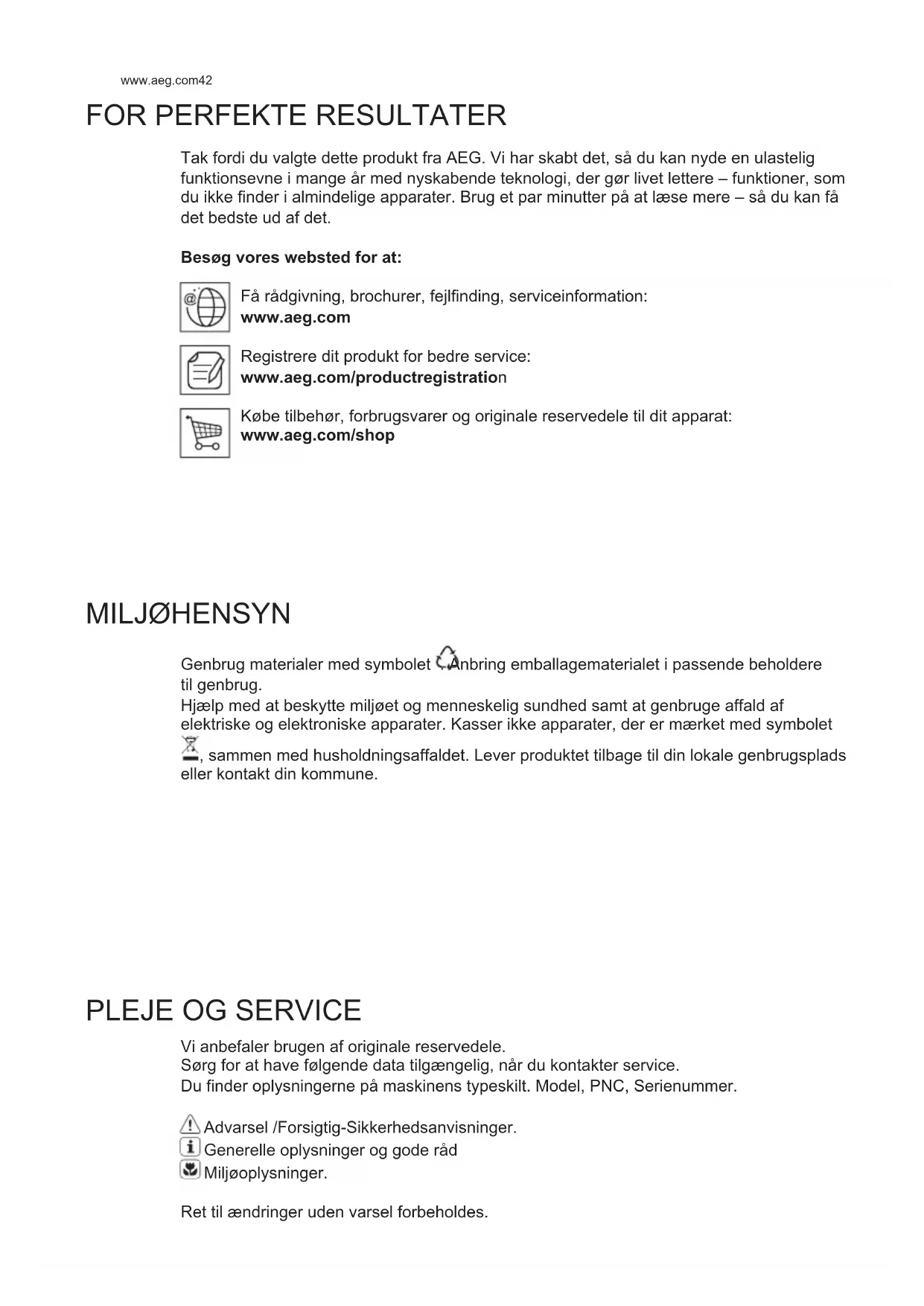Vi anbefaler brugen af originale reservedele. Sørg for at have følgende data tilgængelig, når du kontakter service. Du finder oplysningerne på maskinens typeskilt. Model, PNC, Serienummer. Advarsel /Forsigtig-Sikkerhedsanvisninger. Generelle oplysninger og gode råd Miljøoplysninger. Ret til ændringer uden varsel forbeholdes. DA BRUGSVEJLEDNING43 DANSK