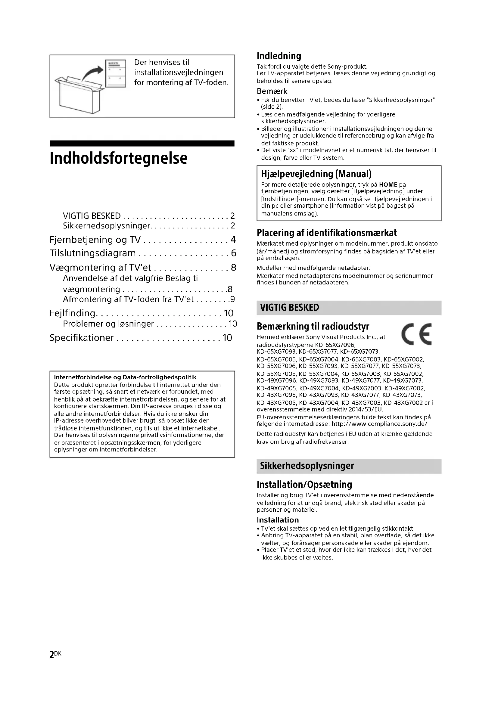 - Før du benytter TV'et, bedes du læse "Sikkerhedsoplysninger" (side 2).• Læs den medfølgende vejledning for yderligere sikkerhedsoplysninger.• Billeder og illustrationer i Installationsvejledningen og denne vejledning er udelukkende til referencebrug og kan afvige fra det faktiske produkt.• Det viste "xx" i modelnavnet er et numerisk tal, der henviser til design, farve eller TV-system. Placering af identifikationsmærkat Mærkatet med oplysninger om modelnummer, produktionsdato (år/måned) og strømforsyning findes på bagsiden af TV'et eller på emballagen.Modeller med medfølgende netadapter:Mærkater med netadapterens modelnummer og serienummer findes i bunden af netadapteren. VIGTIG BESKED Bemærkning til radioudstyr Hermed erklærer Sony Visual Products Inc., at radioudstyrstyperne KD-65XG7096, KD-65XG7093, KD-65XG7077, KD-65XG7073, KD-65XG7005, KD-65XG7004, KD-65XG7003, KD-65XG7002, KD-55XG7096, KD-55XG7093, KD-55XG7077, KD-55XG7073, KD-55XG7005, KD-55XG7004, KD-55XG7003, KD-55XG7002, KD-49XG7096, KD-49XG7093, KD-49XG7077, KD-49XG7073, KD-49XG7005, KD-49XG7004, KD-49XG7003, KD-49XG7002, KD-43XG7096, KD-43XG7093, KD-43XG7077, KD-43XG7073, KD-43XG7005, KD-43XG7004, KD-43XG7003, KD-43XG7002 er i overensstemmelse med direktiv 2014/53/EU. EU-overensstemmelseserklæringens fulde tekst kan findes på følgende internetadresse: http://www.compliance.sony.de/Dette radioudstyr kan betjenes i EU uden at krænke gældende krav om brug af radiofrekvenser. Sikkerhedsoplysninger Installation/Opsætning Installer og brug TV'et i overensstemmelse med nedenstående vejledning for at undgå brand, elektrisk stød eller skader på personer og materiel. Installation