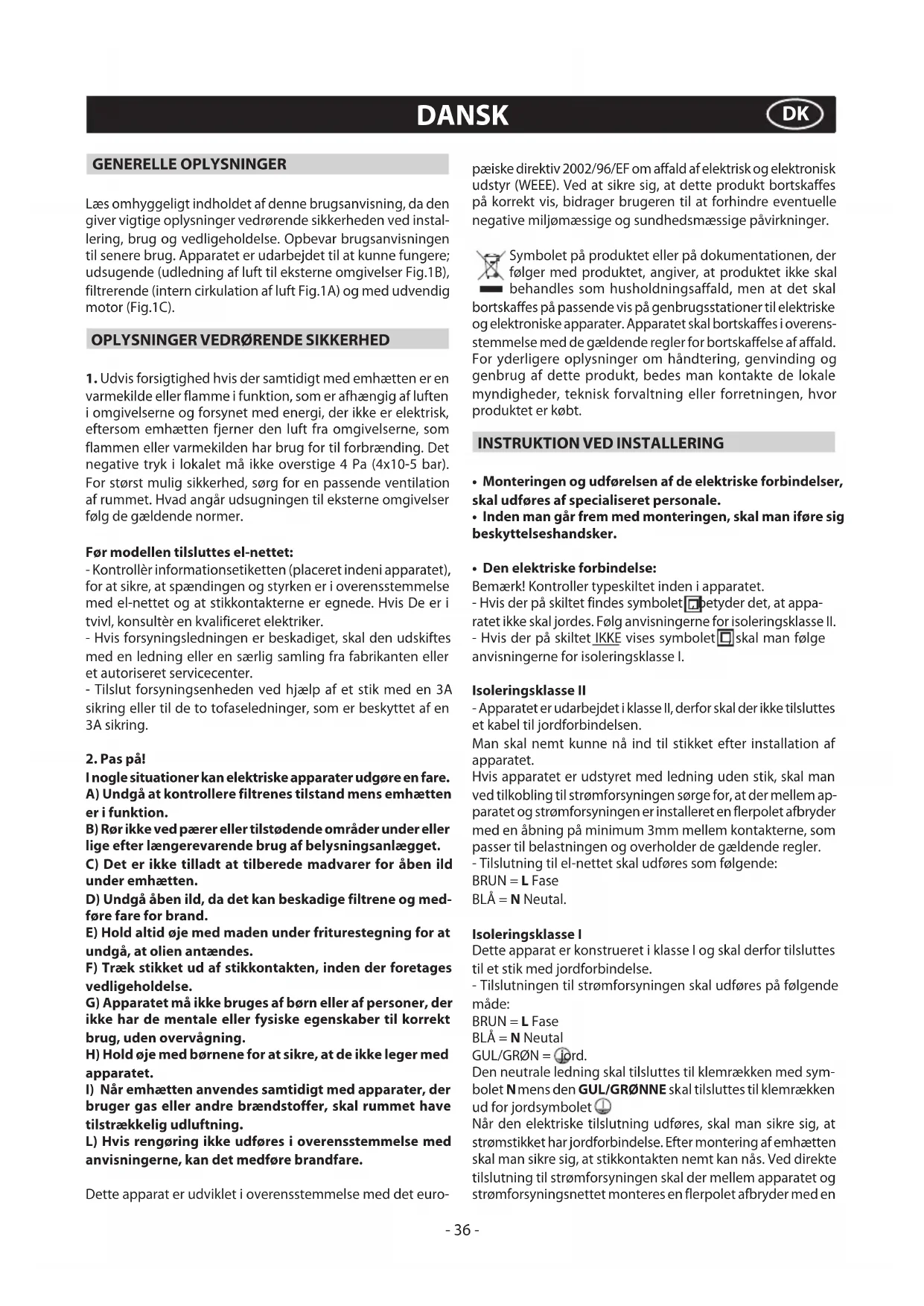 bruger gas eller andre brændstoffer, skal rummet have tilstrækkelig udluftning. L) Hvis rengøring ikke udføres i overensstemmelse med anvisningerne, kan det medføre brandfare. Dette apparat er udviklet i overensstemmelse med det euro- pæiske direktiv 2002/96/EF om affald af elektrisk og elektronisk udstyr (WEEE). Ved at sikre sig, at dette produkt bortskaffes på korrekt vis, bidrager brugeren til at forhindre eventuelle negative miljømæssige og sundhedsmæssige påvirkninger. Symbolet på produktet eller på dokumentationen, der følger med produktet, angiver, at produktet ikke skal behandles som husholdningsaffald, men at det skal bortskaffes på passende vis på genbrugsstationer til elektriske og elektroniske apparater. Apparatet skal bortskaffes i overens- stemmelse med de gældende regler for bortskaffelse af affald. For yderligere oplysninger om håndtering, genvinding og genbrug af dette produkt, bedes man kontakte de lokale myndigheder, teknisk forvaltning eller forretningen, hvor produktet er købt.