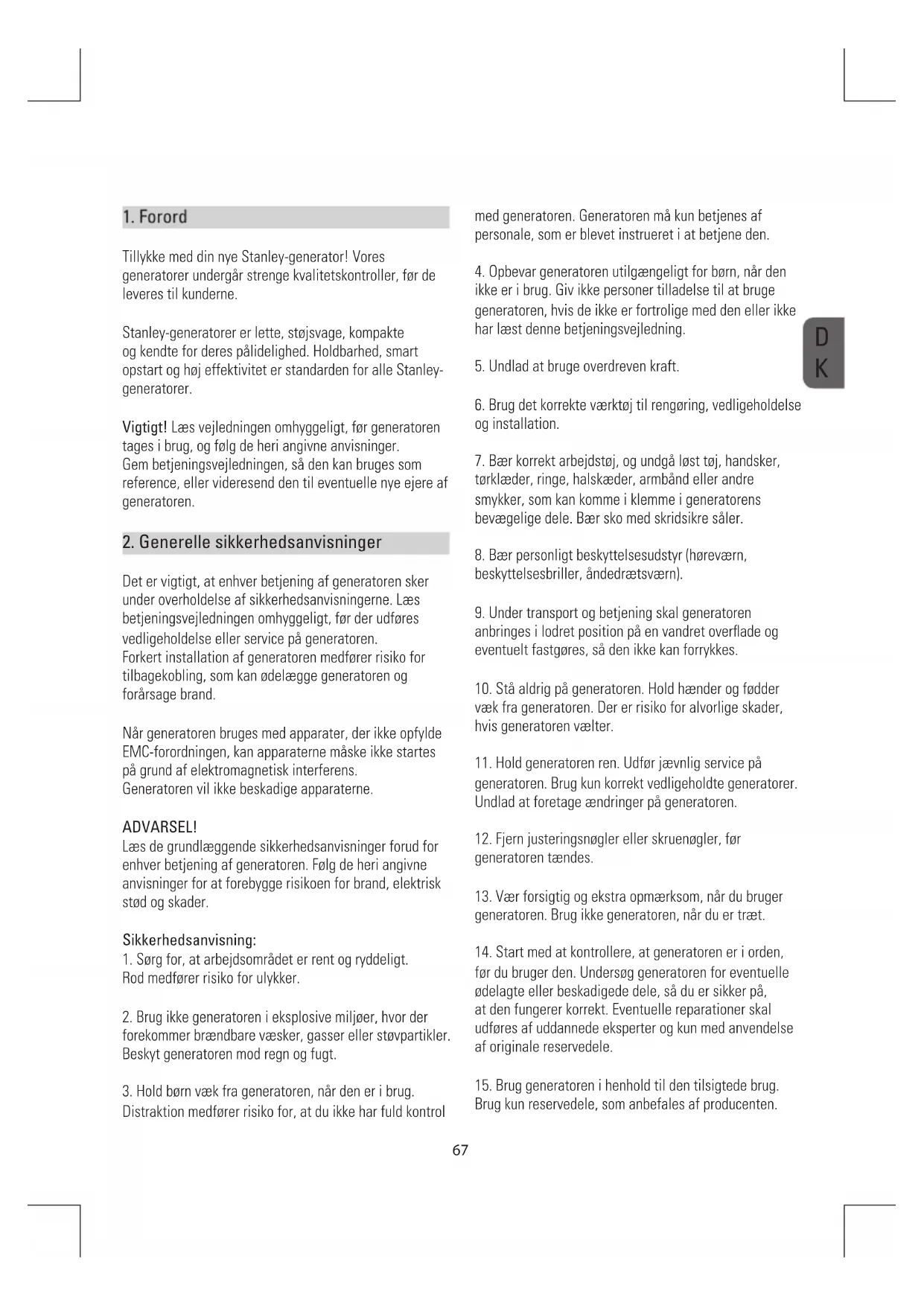Tillykke med din nye Stanley-generator! Vores generatorer undergår strenge kvalitetskontroller, før de leveres til kunderne. Stanley-generatorer er lette, støjsvage, kompakte og kendte for deres pålidelighed. Holdbarhed, smart opstart og høj effektivitet er standarden for alle Stanley- generatorer. Vigtigt! Læs vejledningen omhyggeligt, før generatoren tages i brug, og følg de heri angivne anvisninger. Gem betjeningsvejledningen, så den kan bruges som reference, eller videresend den til eventuelle nye ejere af generatoren.