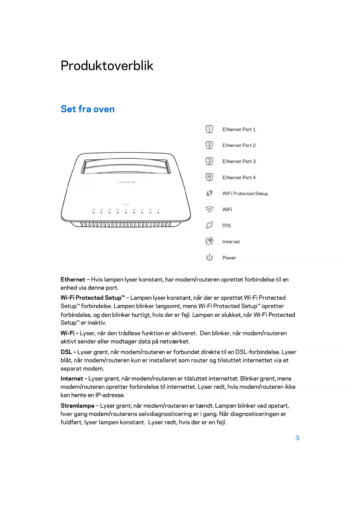 Ethernet - -- Hvis lampen lyser konstant, har modem/routeren oprettet forbindelse til en enhed via denne port. Wi-Fi Protected Setup™ - -- Lampen lyser konstant, når der er oprettet Wi-Fi Protected Setup™ forbindelse. Lampen blinker langsomt, mens Wi-Fi Protected Setup™ opretter forbindelse, og den blinker hurtigt, hvis der er fejl. Lampen er slukket, når Wi-Fi Protected Setup™ er inaktiv. Wi-Fi – Lyser, når den trådløse funktion er aktiveret. Den blinker, når modem/routeren aktivt sender eller modtager data på netværket. DSL – Lyser grønt, når modem/routeren er forbundet direkte til en DSL-forbindelse. Lyser blåt, når modem/routeren kun er installeret som router og tilsluttet internettet via et separat modem. Internet – Lyser grønt, når modem/routeren er tilsluttet internettet. Blinker grønt, mens modem/routeren opretter forbindelse til internettet. Lyser rødt, hvis modem/routeren ikke kan hente en IP-adresse. Strømlampe - -- Lyser grønt, når modem/routeren er tændt. Lampen blinker ved opstart, hver gang modem/routerens selvdiagnosticering er i gang. Når diagnosticeringen er fuldført, lyser lampen konstant. Lyser rødt, hvis der er en fejl. 3Bagside
