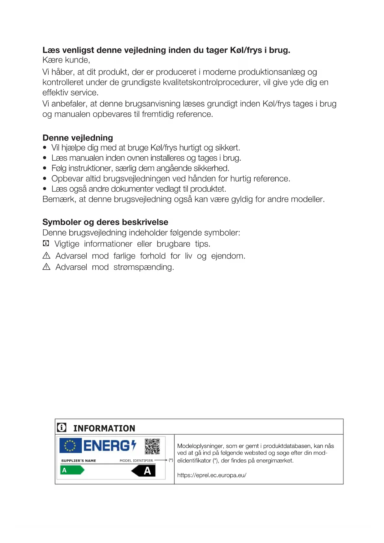 - Læs også andre dokumenter vedlagt til produktet. Bemærk, at denne brugsvejledning også kan være gyldig for andre modeller. Symboler og deres beskrivelse Denne brugsvejledning indeholder følgende symboler: C Vigtige informationer eller brugbare tips. A Advarsel mod farlige forhold for liv og ejendom. B Advarsel mod strømspænding. INFORMATION Modeloplysninger, som er gemt i produktdatabasen, kan nås ved at gå ind på følgende websted og søge efter din mod-elidentifikator (*), der findes på energimærket.https://eprel.ec.europa.eu/