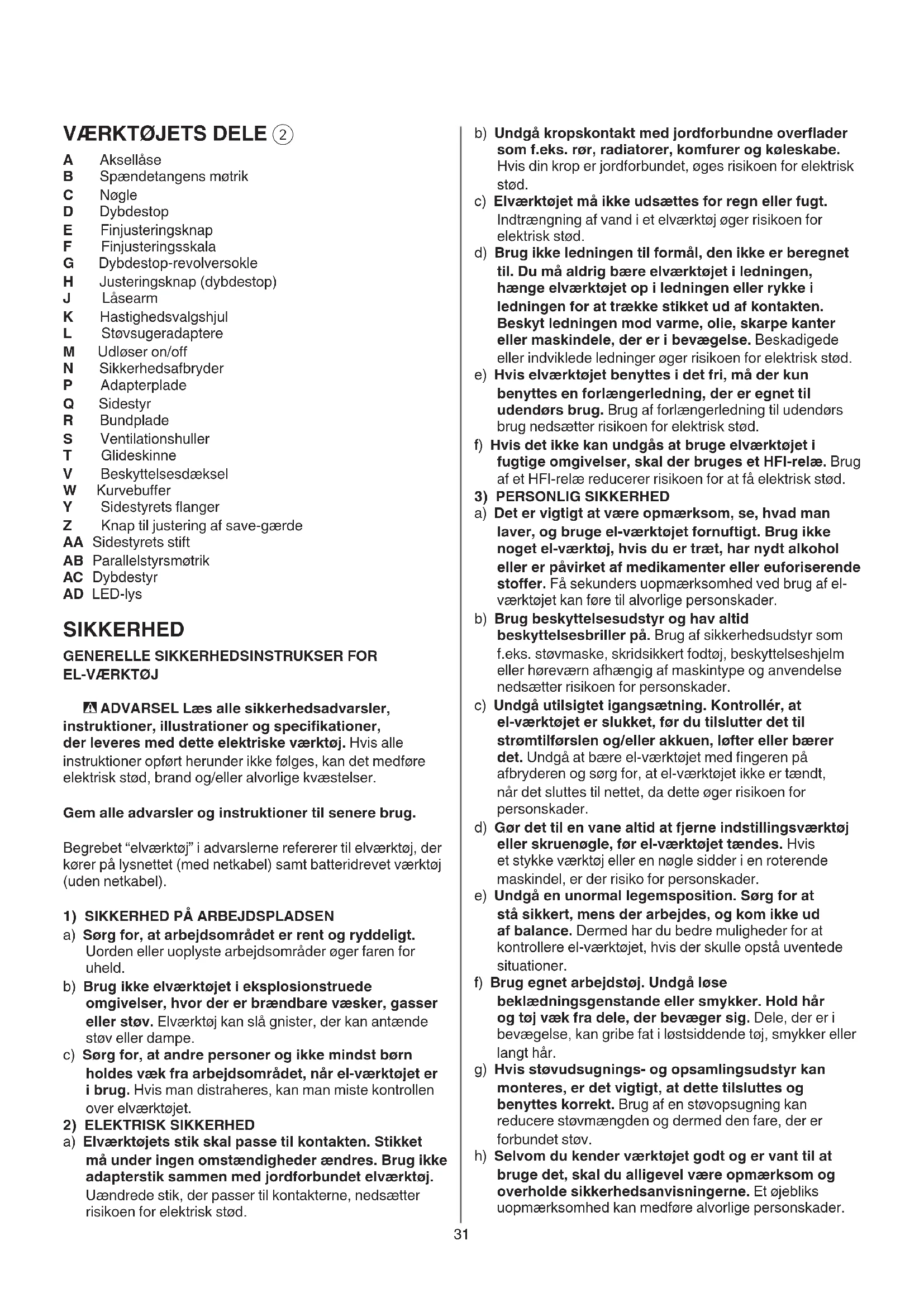 h) Selvom du kender værktogjt godt og ervant til at bruge det, skal du alligevel vaere opmaerkso mg overholde sikkerhedsanvisningerne. Et ojebliks uopmaerksohmhed kan medfrole alvorlige personskader.