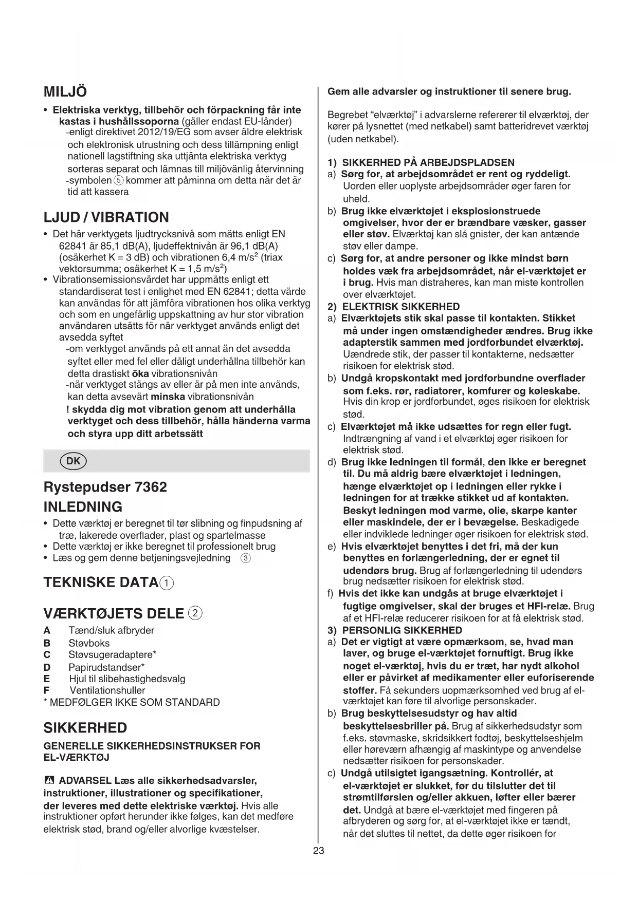 - Dammuppsugning ! använd inte dammuppsamlaren/dammsugare när du slipar metall23 Gem alle advarsler og instruktioner til senere brug. Begrebet “elværktøj” i advarslerne refererer til elværktøj, der kører på lysnettet (med netkabel) samt batteridrevet værktøj (uden netkabel).