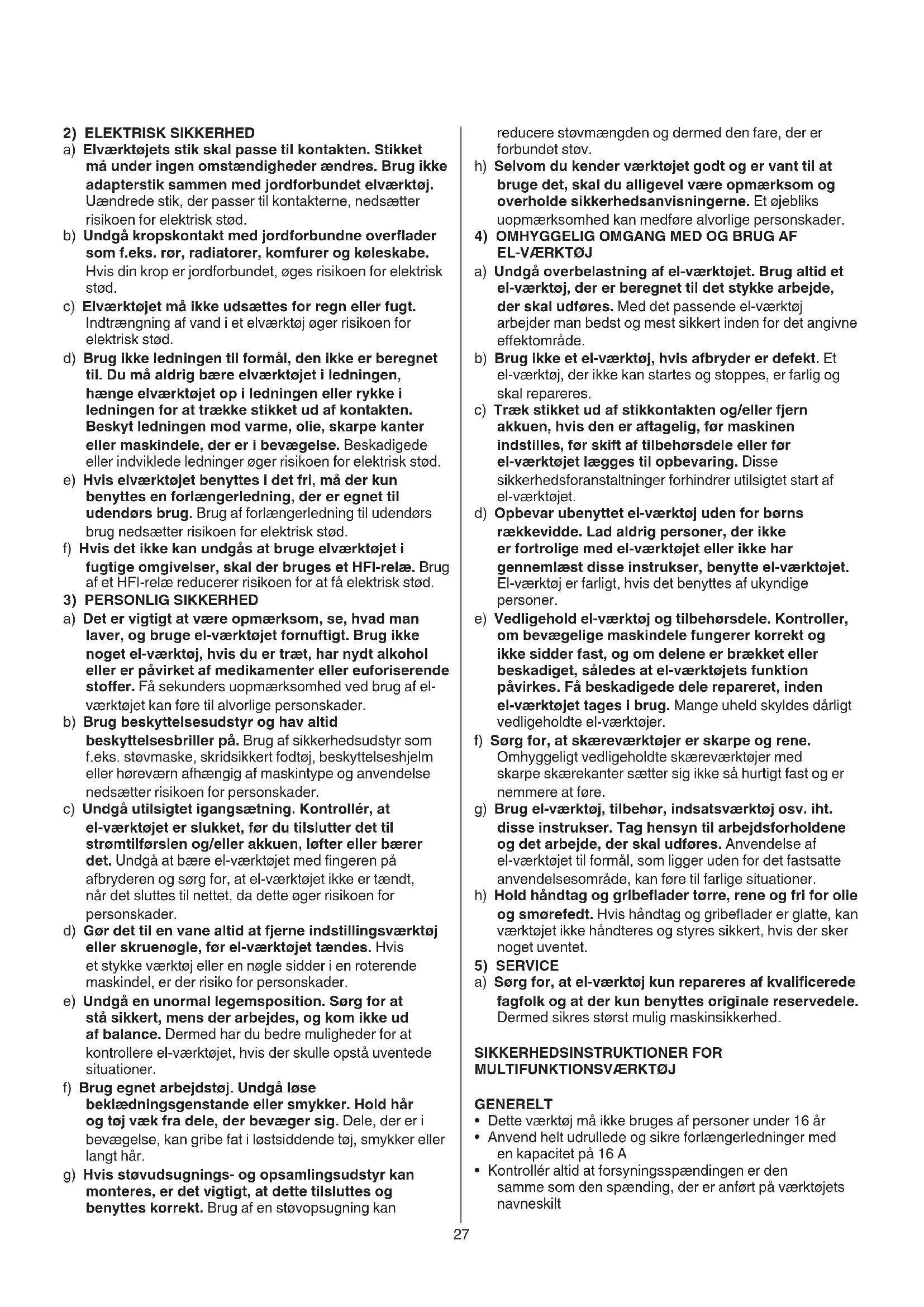 a) Sørg for, at el-værktøj kun repareres af kvalicerede fagfolk og at der kun benyttes originale reservedele. Dermed sikres størst mulig maskinsikkerhed. SIKKERHEDSINSTRUKTIONER FOR
