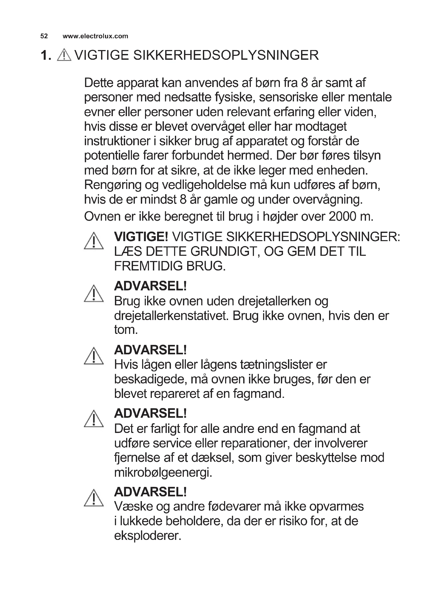 11. MILJØOPLYSNINGER ..............................................................................................................75 3 - ELECTROLUX_DANISH_MG_BASE_AJ26UICTO_SAFETYMAY19.indd 513 - ELECTROLUX_DANISH_MG_BASE_AJ26UICTO_SAFETYMAY19.indd 51 04/10/2024 07:15:3704/10/2024 07:15:3752 www.electrolux.com Dette apparat kan anvendes af børn fra 8 år samt af personer med nedsatte fysiske, sensoriske eller mentale evner eller personer uden relevant erfaring eller viden, hvis disse er blevet overvåget eller har modtaget instruktioner i sikker brug af apparatet og forstår de potentielle farer forbundet hermed. Der bør føres tilsyn med børn for at sikre, at de ikke leger med enheden. Rengøring og vedligeholdelse må kun udføres af børn, hvis de er mindst 8 år gamle og under overvågning. Ovnen er ikke beregnet til brug i højder over 2000 m. VIGTIGE! VIGTIGE SIKKERHEDSOPLYSNINGER: LÆS DETTE GRUNDIGT, OG GEM DET TIL FREMTIDIG BRUG. ADVARSEL! Brug ikke ovnen uden drejetallerken og drejetallerkenstativet. Brug ikke ovnen, hvis den er tom. ADVARSEL! Hvis lågen eller lågens tætningslister er beskadigede, må ovnen ikke bruges, før den er blevet repareret af en fagmand. ADVARSEL! Det er farligt for alle andre end en fagmand at udføre service eller reparationer, der involverer fjernelse af et dæksel, som giver beskyttelse mod mikrobølgeenergi. ADVARSEL! Væske og andre fødevarer må ikke opvarmes i lukkede beholdere, da der er risiko for, at de eksploderer.