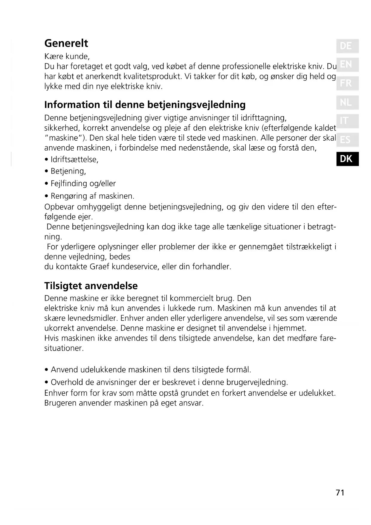 - Rengøring af maskinen. Opbevar omhyggeligt denne betjeningsvejledning, og giv den videre til den efter- følgende ejer. Denne betjeningsvejledning kan dog ikke tage alle tænkelige situationer i betragt- ning. For yderligere oplysninger eller problemer der ikke er gennemgået tilstrækkeligt i denne vejledning, bedes du kontakte Graef kundeservice, eller din forhandler. Tilsigtet anvendelse Denne maskine er ikke beregnet til kommercielt brug. Den elektriske kniv må kun anvendes i lukkede rum. Maskinen må kun anvendes til at skære levnedsmidler. Enhver anden eller yderligere anvendelse, vil ses som værende ukorrekt anvendelse. Denne maskine er designet til anvendelse i hjemmet. Hvis maskinen ikke anvendes til dens tilsigtede anvendelse, kan det medføre fare- situationer.