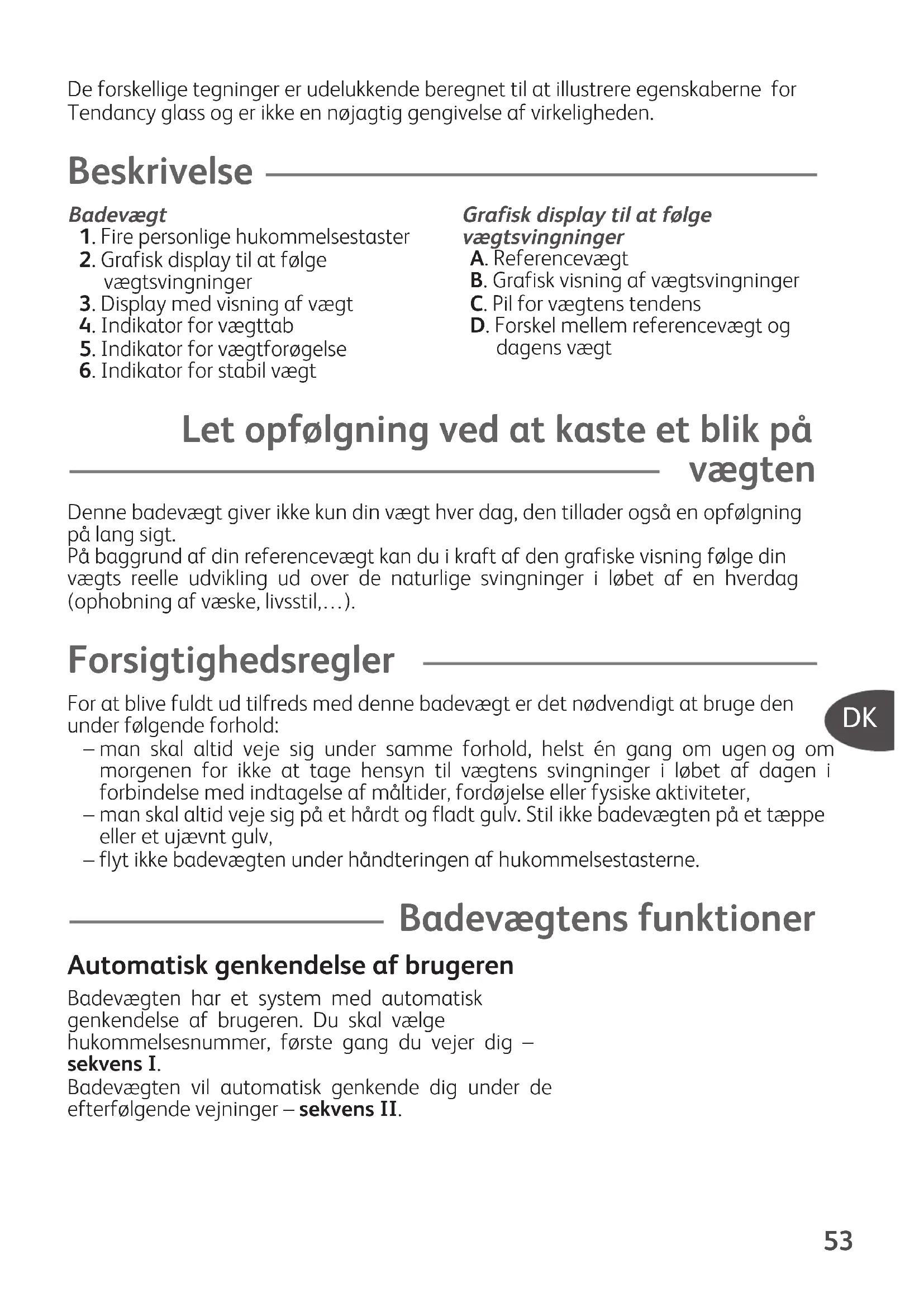 De forskellige tegninger er udelukkende beregnet til at illustrere egenskaberne forTendancy glass og er ikke en nøjagtig gengivelse af virkeligheden. Beskrivelse Badevægt1. Fire personlige hukommelsestaster2. Grafisk display til at følge vægtsvingninger3. Display med visning af vægt4. Indikator for vægttab5. Indikator for vægtforøgelse6. Indikator for stabil vægt Let opfølgning ved at kaste et blik på vægten Denne badevægt giver ikke kun din vægt hver dag, den tillader også en opfølgningpå lang sigt. På baggrund af din referencevægt kan du i kraft af den grafiske visning følge dinvægts reelle udvikling ud over de naturlige svingninger i løbet af en hverdag(ophobning af væske, livsstil,…). Forsigtighedsregler For at blive fuldt ud tilfreds med denne badevægt er det nødvendigt at bruge denunder følgende forhold:– man skal altid veje sig under samme forhold, helst én gang om ugen og ommorgenen for ikke at tage hensyn til vægtens svingninger i løbet af dagen iforbindelse med indtagelse af måltider, fordøjelse eller fysiske aktiviteter,– man skal altid veje sig på et hårdt og fladt gulv. Stil ikke badevægten på et tæppeeller et ujævnt gulv,– flyt ikke badevægten under håndteringen af hukommelsestasterne. Badevægtens funktioner Automatisk genkendelse af brugeren Badevægten har et system med automatiskgenkendelse af brugeren. Du skal vælgehukommelsesnummer, første gang du vejer dig –sekvens I. Badevægten vil automatisk genkende dig under de efterfølgende vejninger – sekvens II.Grafisk display til at følgevægtsvingningerA. ReferencevægtB. Grafisk visning af vægtsvingningerC. Pil for vægtens tendensD. Forskel mellem referencevægt ogdagens vægtF