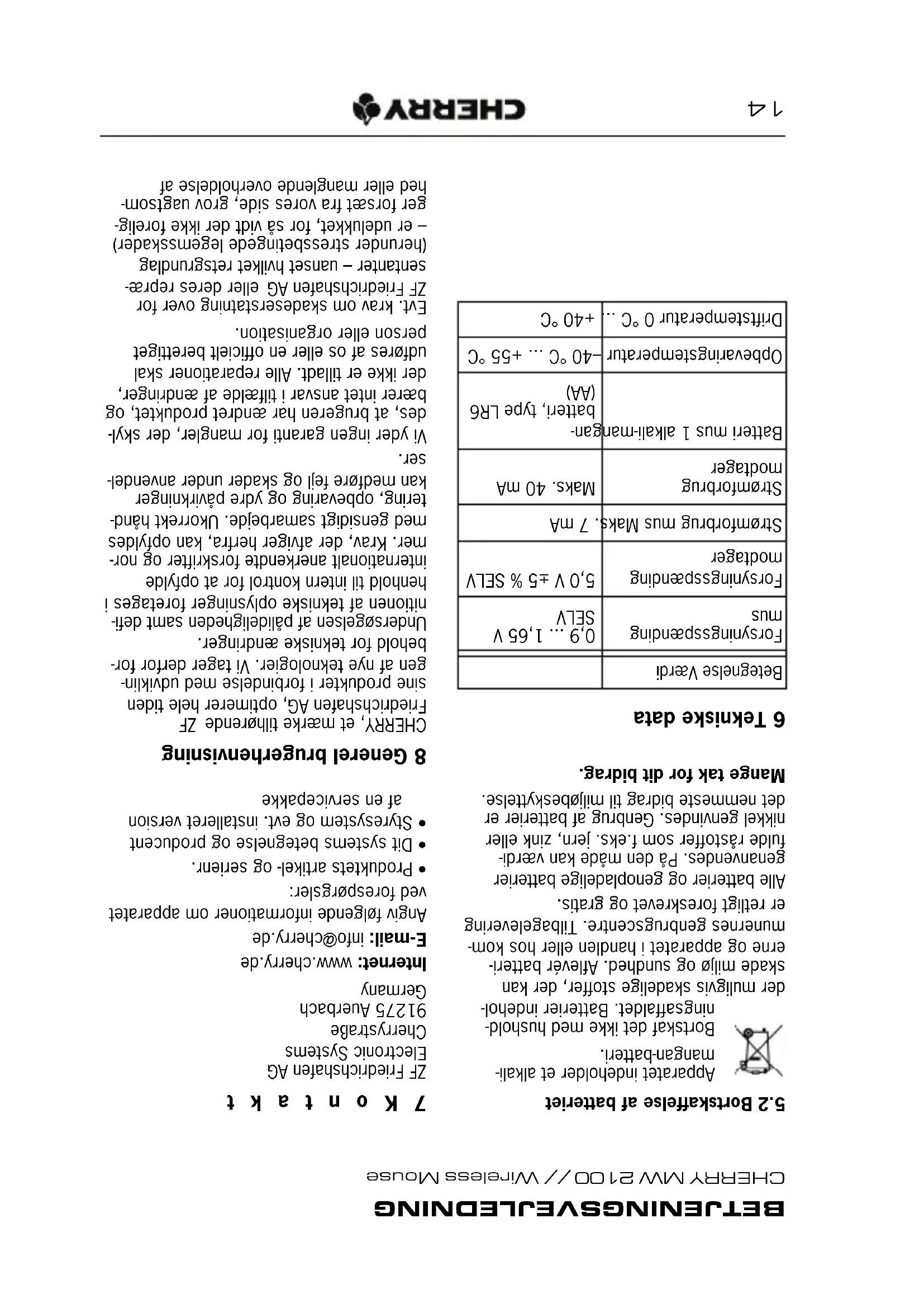 Apparatet indeholder et alkali- mangan-batteri. Bortskaf det ikke med hushold- ningsaffaldet. Batterier indehol- der muligvis skadelige stoffer, der kan skade miljø og sundhed. Aflevér batteri- erne og apparatet i handlen eller hos kom- munernes genbrugscentre. Tilbagelevering er retligt foreskrevet og gratis. Alle batterier og genopladelige batterier genanvendes. På den måde kan værdi- fulde råstoffer som f.eks. jern, zink eller nikkel genvindes. Genbrug af batterier er det nemmeste bidrag til miljøbeskyttelse. Mange tak for dit bidrag. 6 Tekniske data Betegnelse Værdi Forsyningsspænding mus 0,9 ... 1,65 V SELV Forsyningsspænding modtager 5,0 V ±5 % SELV Strømforbrug mus Maks. 7 mA Strømforbrug modtager Maks. 40 mA Batteri mus 1 alkali-mangan- batteri, type LR6 (AA) Opbevaringstemperatur –40 °C ... +55 °C Driftstemperatur 0 °C ... +40 °C 7Kontakt ZF Friedrichshafen AG Electronic Systems Cherrystraße 91275 Auerbach Germany Internet: www.cherry.de E-mail: info@cherry.de Angiv følgende informationer om apparatet ved forespørgsler: