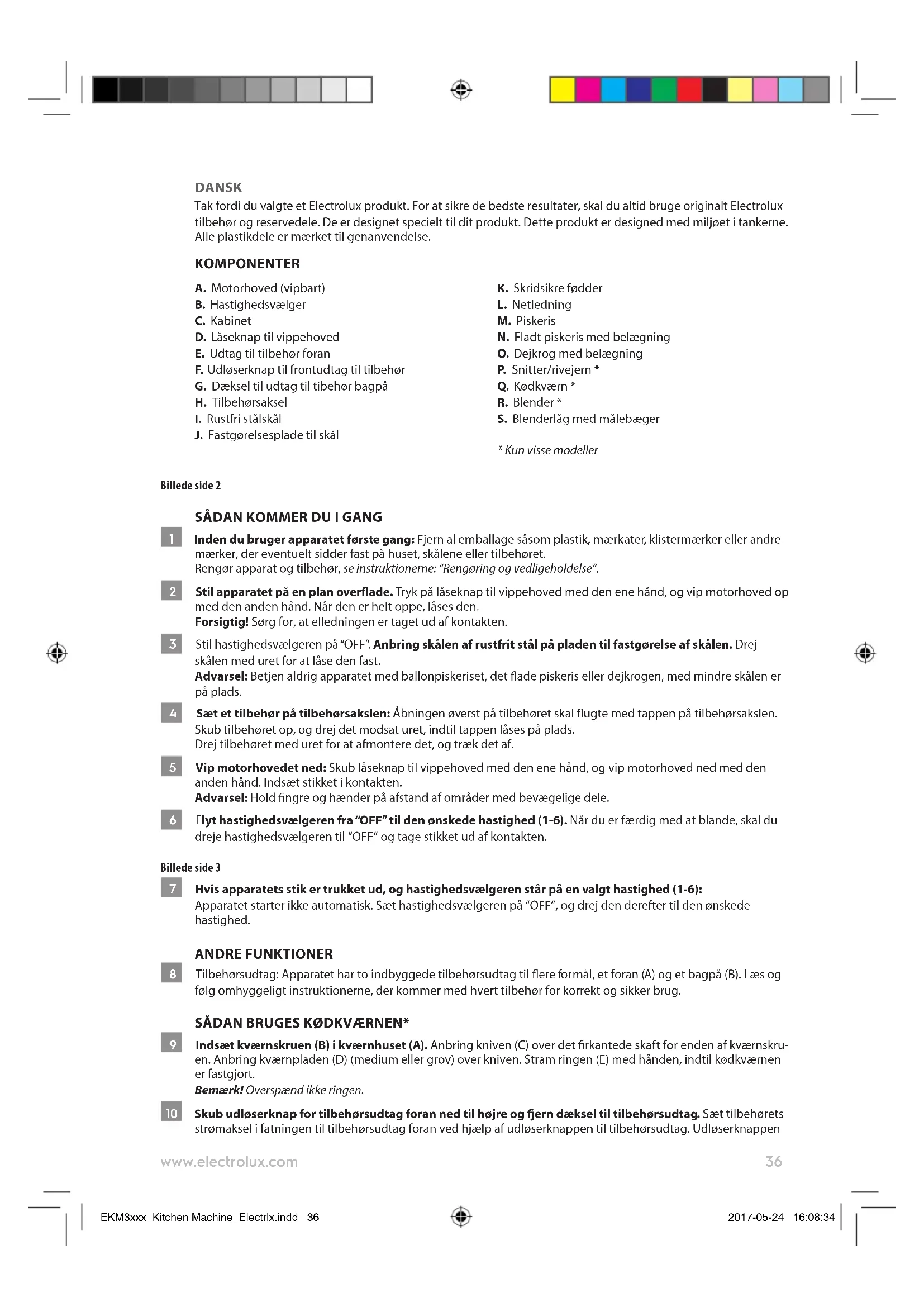 *Bei der Zubereitung von Hefeteig keine höhere Geschwindigkeit als Stufe 2 einstellen. Der Mixer kann dadurch beschädigt werden. EKM3xxx_Kitchen Machine_Electrlx.indd 35 2017-05-24 16:08:3436 www.electrolux.com DANSK Tak fordi du valgte et Electrolux produkt. For at sikre de bedste resultater, skal du altid bruge originalt Electrolux tilbehør og reservedele. De er designet specielt til dit produkt. Dette produkt er designed med miljøet i tankerne. Alle plastikdele er mærket til genanvendelse. KOMPONENTER A. Motorhoved (vipbart) B. Hastighedsvælger C. Kabinet D. Låseknap til vippehoved E. Udtag til tilbehør foran F. Udløserknap til frontudtag til tilbehør G. Dæksel til udtag til tibehør bagpå H. Tilbehørsaksel