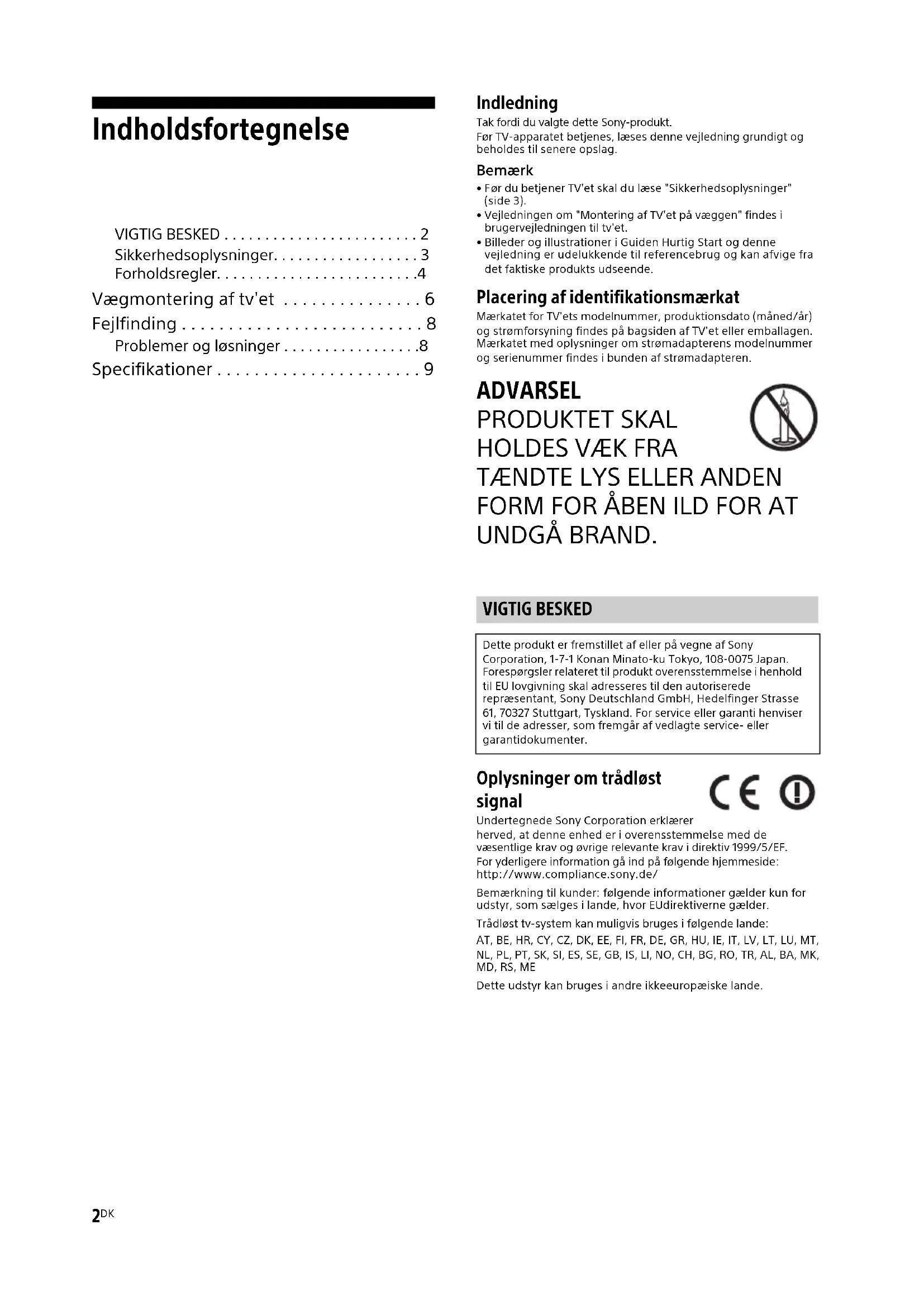 UNDGÅ BRAND. Oplysninger om trådløst signal Undertegnede Sony Corporation erklærer herved, at denne enhed er i overensstemmelse med de væsentlige krav og øvrige relevante krav i direktiv 1999/5/EF.For yderligere information gå ind på følgende hjemmeside:http://www.compliance.sony.de/Bemærkning til kunder: følgende informationer gælder kun for udstyr, som sælges i lande, hvor EUdirektiverne gælder.Trådløst tv-system kan muligvis bruges i følgende lande:AT, BE, HR, CY, CZ, DK, EE, FI, FR, DE, GR, HU, IE, IT, LV, LT, LU, MT, NL, PL, PT, SK, SI, ES, SE, GB, IS, LI, NO, CH, BG, RO, TR, AL, BA, MK, MD, RS, MEDette udstyr kan bruges i andre ikkeeuropæiske lande. VIGTIG BESKED Dette produkt er fremstillet af eller på vegne af Sony Corporation, 1-7-1 Konan Minato-ku Tokyo, 108-0075 Japan. Forespørgsler relateret til produkt overensstemmelse i henhold til EU lovgivning skal adresseres til den autoriserede repræsentant, Sony Deutschland GmbH, Hedelfinger Strasse 61, 70327 Stuttgart, Tyskland. For service eller garanti henviser vi til de adresser, som fremgår af vedlagte service- eller garantidokumenter.DK