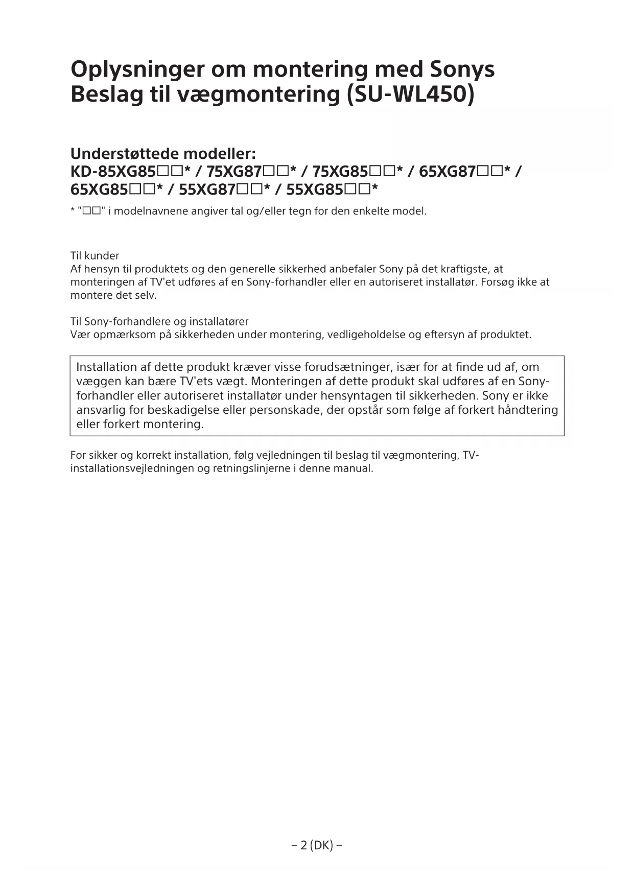 - "" i modelnavnene angiver tal og/eller tegn for den enkelte model. Til kunder Af hensyn til produktets og den generelle sikkerhed anbefaler Sony på det kraftigste, at monteringen af TV'et udføres af en Sony-forhandler eller en autoriseret installatør. Forsøg ikke at montere det selv. Til Sony-forhandlere og installatører Vær opmærksom på sikkerheden under montering, vedligeholdelse og eftersyn af produktet. Installation af dette produkt kræver visse forudsætninger, især for at finde ud af, om væggen kan bære TV'ets vægt. Monteringen af dette produkt skal udføres af en Sony- forhandler eller autoriseret installatør under hensyntagen til sikkerheden. Sony er ikke ansvarlig for beskadigelse eller personskade, der opstår som følge af forkert håndtering eller forkert montering. For sikker og korrekt installation, følg vejledningen til beslag til vægmontering, TV- installationsvejledningen og retningslinjerne i denne manual.− 3 (DK) −