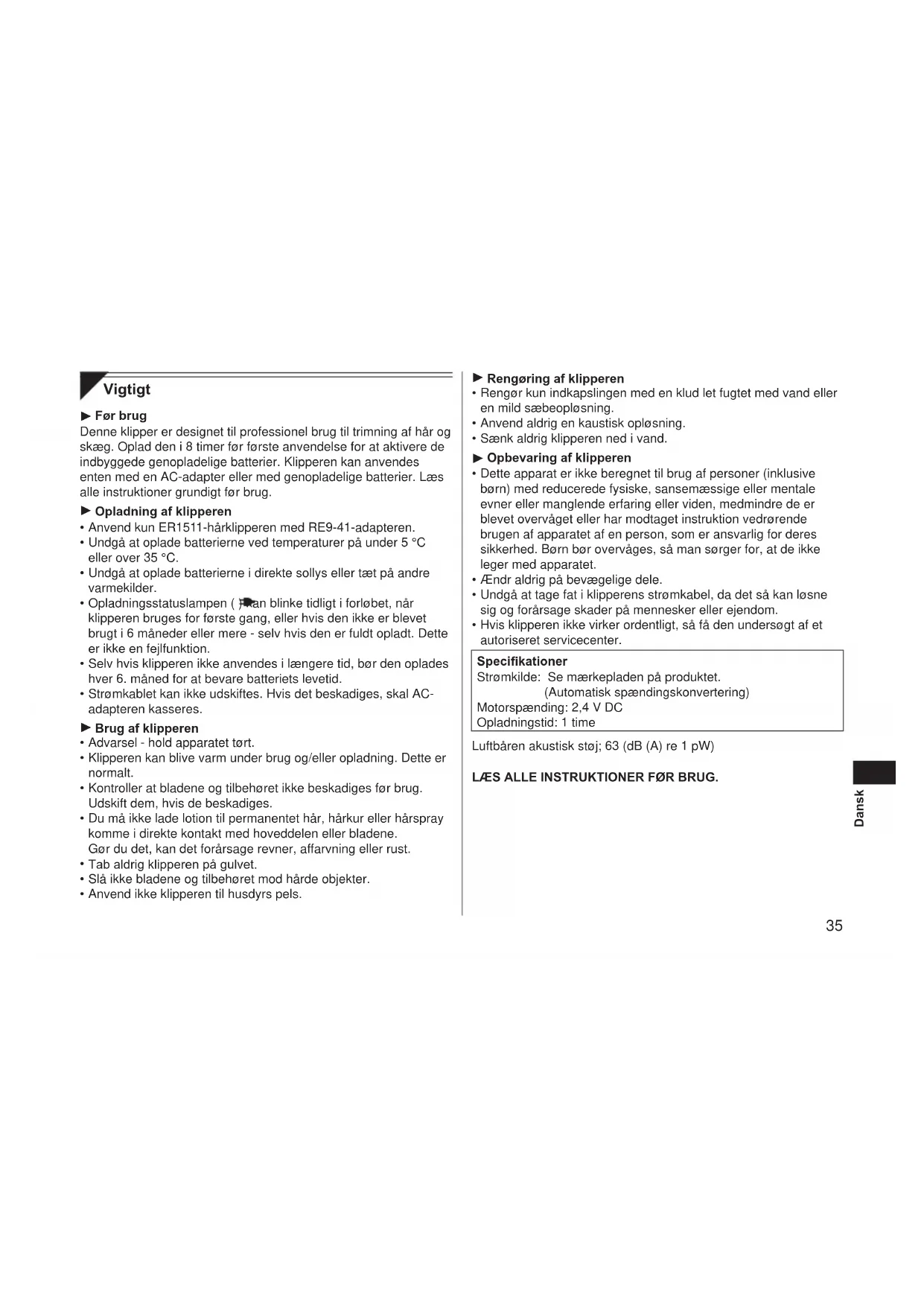 - 35 Dansk Vigtigt Før brug Denne klipper er designet til professionel brug til trimning af hår og skæg. Oplad den i 8 timer før første anvendelse for at aktivere de indbyggede genopladelige batterier. Klipperen kan anvendes enten med en AC‑adapter eller med genopladelige batterier. Læs alle instruktioner grundigt før brug. Opladning af klipperen Anvend kun ER151 1‑hårklipperen med RE9‑41‑adapteren. Undgå at oplade batterierne ved temperaturer på under 5 °C eller over 35 °C. Undgå at oplade batterierne i direkte sollys eller tæt på andre varmekilder. Opladningsstatuslampen ( ) kan blinke tidligt i forløbet, når klipperen bruges for første gang, eller hvis den ikke er blevet brugt i 6 måneder eller mere ‑ selv hvis den er fuldt opladt. Dette er ikke en fejlfunktion. Selv hvis klipperen ikke anvendes i længere tid, bør den oplades hver 6. måned for at bevare batteriets levetid. Strømkablet kan ikke udskiftes. Hvis det beskadiges, skal AC‑ adapteren kasseres. Brug af klipperen Advarsel ‑ hold apparatet tørt. Klipperen kan blive varm under brug og/eller opladning. Dette er normalt. Kontroller at bladene og tilbehøret ikke beskadiges før brug. Udskift dem, hvis de beskadiges. Du må ikke lade lotion til permanentet hår, hårkur eller hårspray komme i direkte kontakt med hoveddelen eller bladene. Gør du det, kan det forårsage revner, affarvning eller rust. Tab aldrig klipperen på gulvet. Slå ikke bladene og tilbehøret mod hårde objekter. Anvend ikke klipperen til husdyrs pels.