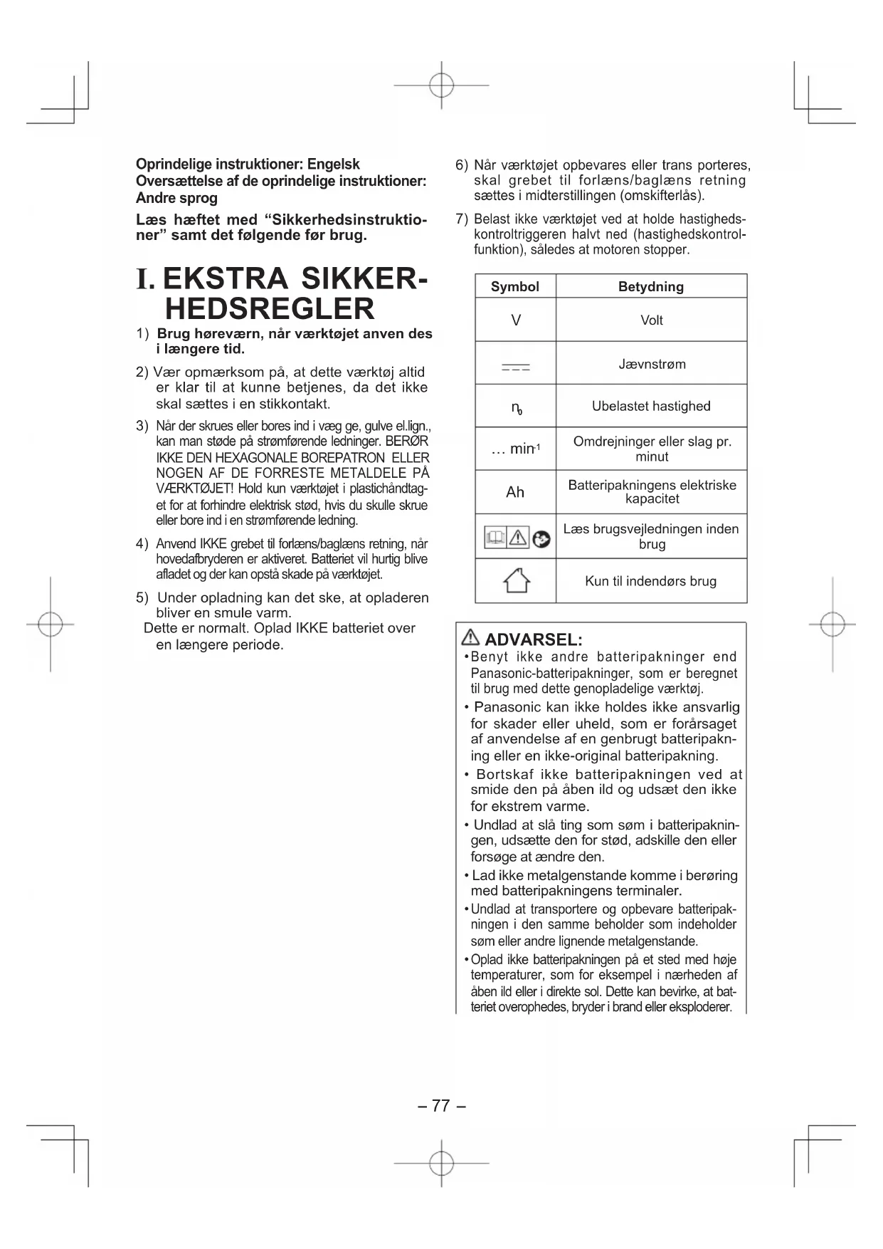 Oplad ikke batteripakningen på et sted med høje temperaturer, som for eksempel i nærheden af åben ild eller i direkte sol. Dette kan bevirke, at bat- teriet overophedes, bryder i brand eller eksploderer. Oprindelige instruktioner: Engelsk Oversættelse af de oprindelige instruktioner: Andre sprog Læs hæftet med “Sikkerhedsinstruktio- ner” samt det følgende før brug. EY7546_EY7547_EY7550_EY7551_EU_007(DK).indd 77 2012-10-12 13:21:51-