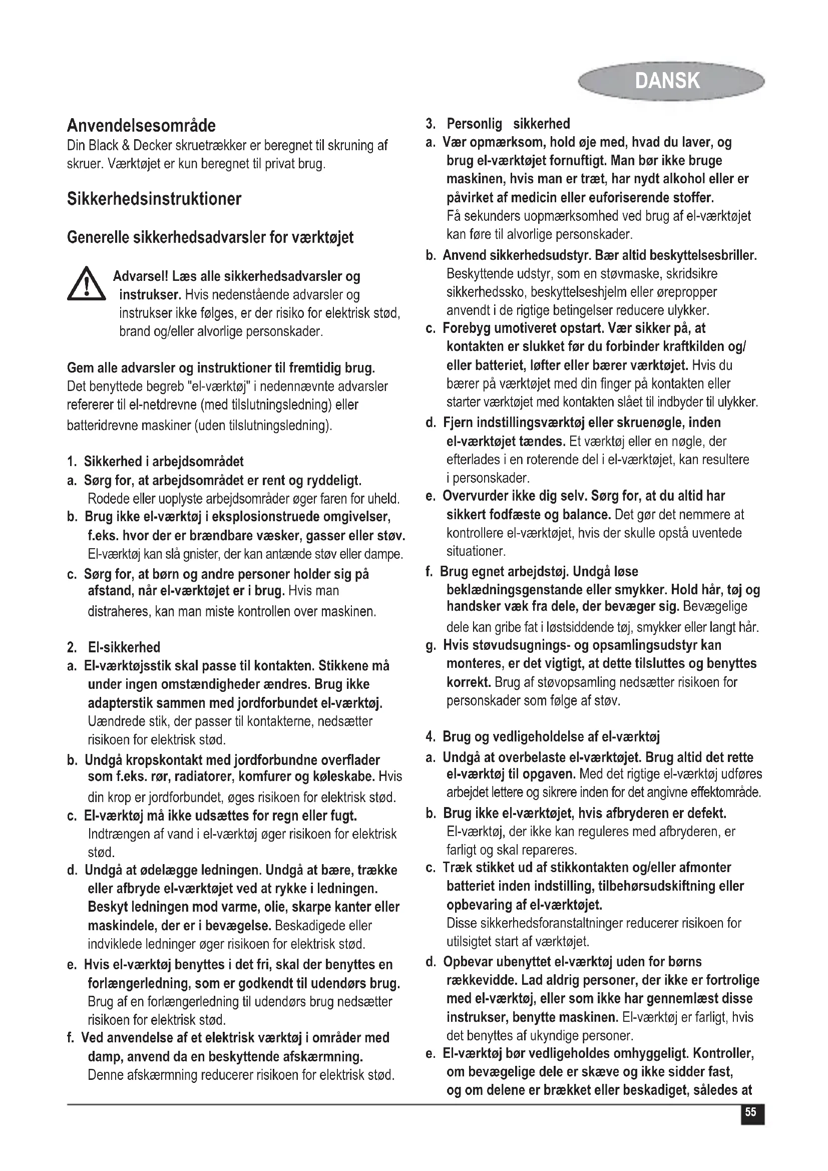 Det benyttede begr "el-vaerktoj" i nedennævnte advarsler refererer til el-netdrevne (med tilslutningsledning) eller batteridrevne maskiner (eden tilslutningsledning).