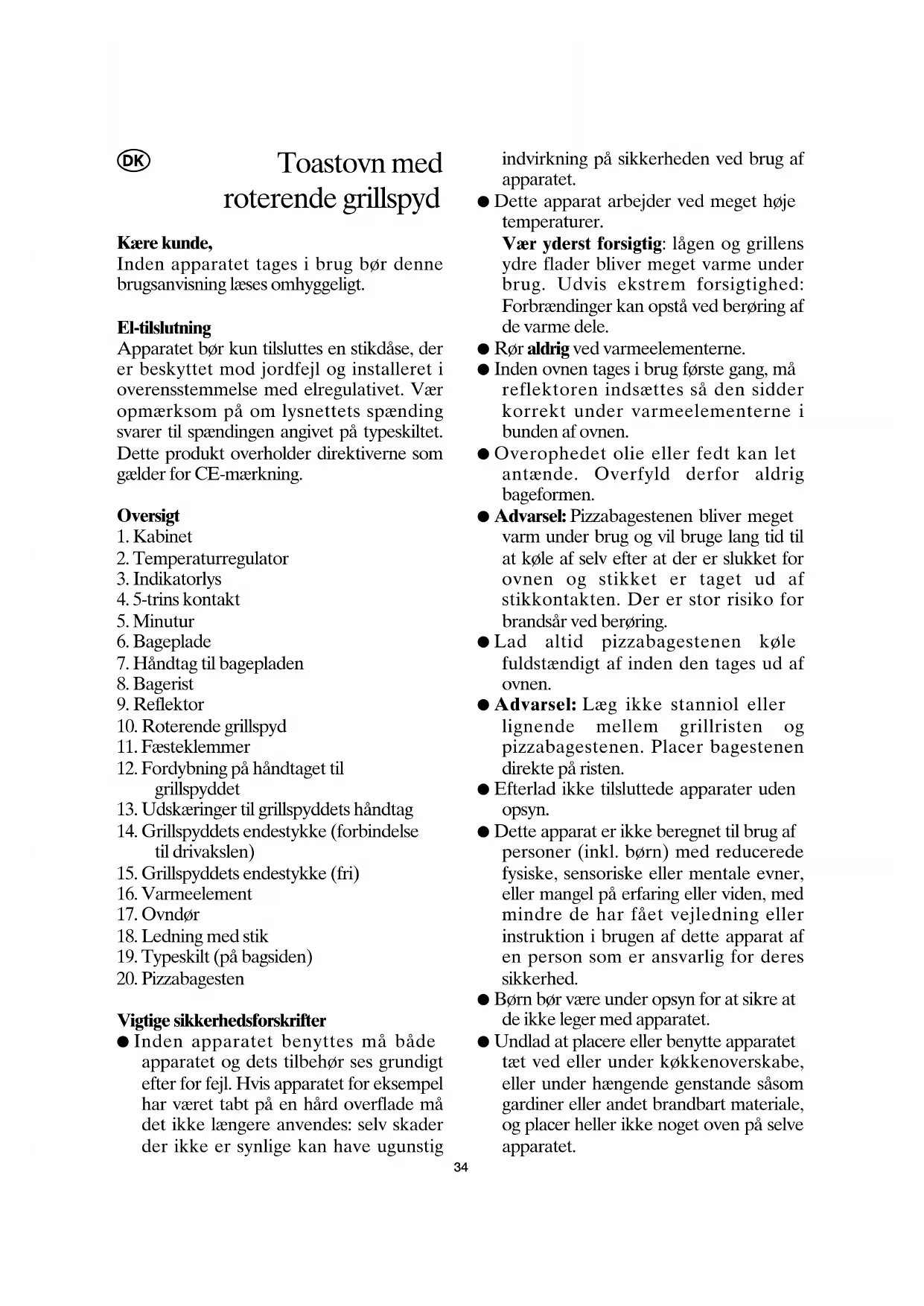 Vigtige sikkerhedsforskrifter ● Inden apparatet benyttes må både apparatet og dets tilbehør ses grundigt efter for fejl. Hvis apparatet for eksempel har været tabt på en hård overflade må det ikke længere anvendes: selv skader der ikke er synlige kan have ugunstig indvirkning på sikkerheden ved brug af apparatet. ● Dette apparat arbejder ved meget høje temperaturer. Vær yderst forsigtig: lågen og grillens ydre flader bliver meget varme under brug. Udvis ekstrem forsigtighed: Forbrændinger kan opstå ved berøring af de varme dele. ● Rør aldrig ved varmeelementerne. ● Inden ovnen tages i brug første gang, må reflektoren indsættes så den sidder korrekt under varmeelementerne i bunden af ovnen. ● Overophedet olie eller fedt kan let antænde. Overfyld derfor aldrig bageformen. ● Advarsel: Pizzabagestenen bliver meget varm under brug og vil bruge lang tid til at køle af selv efter at der er slukket for ovnen og stikket er taget ud af stikkontakten. Der er stor risiko for brandsår ved berøring. ● Lad altid pizzabagestenen køle fuldstændigt af inden den tages ud af ovnen. ● Advarsel: Læg ikke stanniol eller lignende mellem grillristen og pizzabagestenen. Placer bagestenen direkte på risten. ● Efterlad ikke tilsluttede apparater uden opsyn. ● Dette apparat er ikke beregnet til brug af personer (inkl. børn) med reducerede fysiske, sensoriske eller mentale evner, eller mangel på erfaring eller viden, med mindre de har fået vejledning eller instruktion i brugen af dette apparat af en person som er ansvarlig for deres sikkerhed. ● Børn bør være under opsyn for at sikre at de ikke leger med apparatet. ● Undlad at placere eller benytte apparatet tæt ved eller under køkkenoverskabe, eller under hængende genstande såsom gardiner eller andet brandbart materiale, og placer heller ikke noget oven på selve apparatet.
