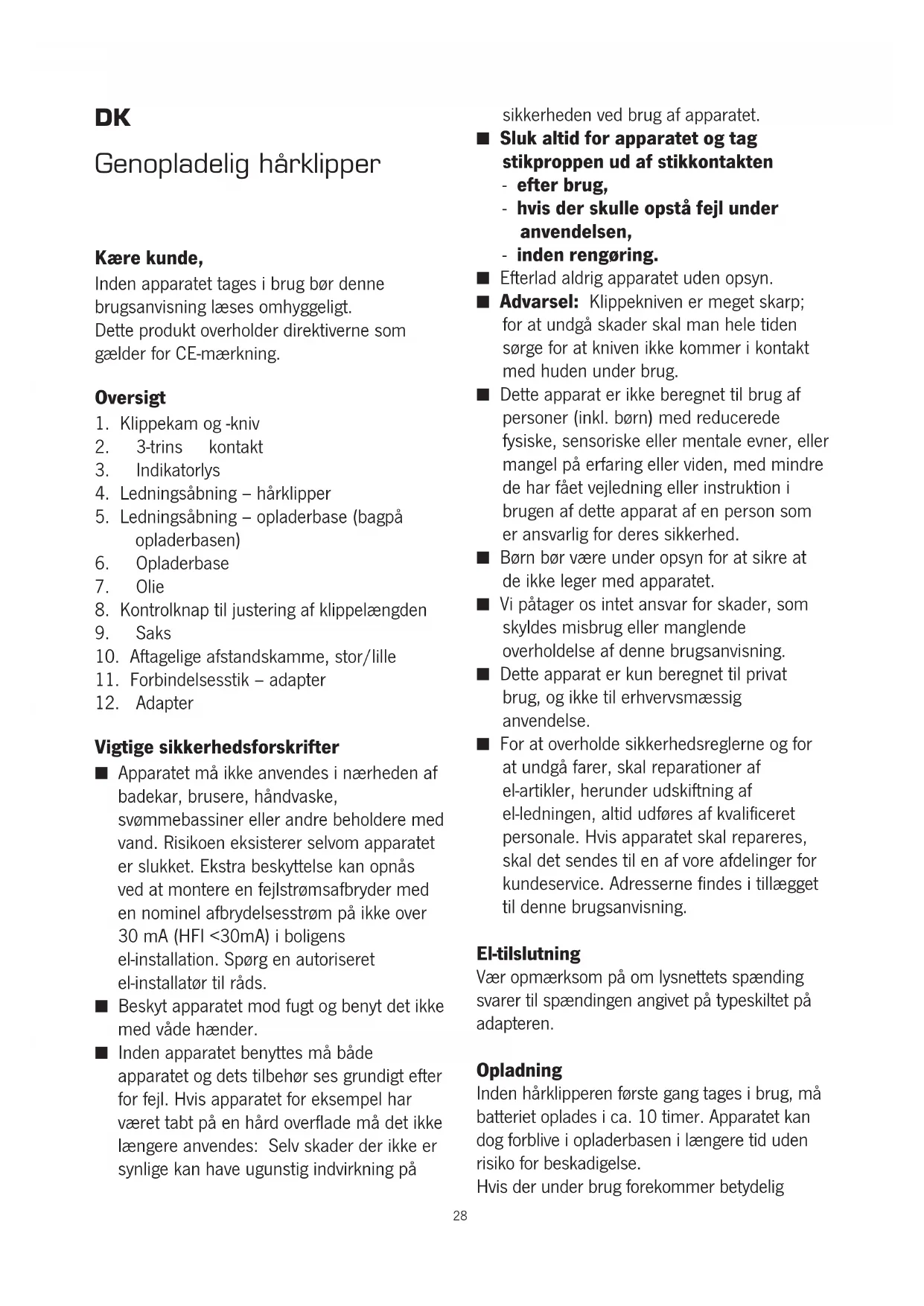 Vigtige sikkerhedsforskrifter ■ Apparatet må ikke anvendes i nærheden af badekar, brusere, håndvaske, svømmebassiner eller andre beholdere med vand. Risikoen eksisterer selvom apparatet er slukket. Ekstra beskyttelse kan opnås ved at montere en fejlstrømsafbryder med en nominel afbrydelsesstrøm på ikke over 30 mA (HFI <30mA) i boligens el-installation. Spørg en autoriseret el-installatør til råds. ■ Beskyt apparatet mod fugt og benyt det ikke med våde hænder. ■ Inden apparatet benyttes må både apparatet og dets tilbehør ses grundigt efter for fejl. Hvis apparatet for eksempel har været tabt på en hård overflade må det ikke længere anvendes: Selv skader der ikke er synlige kan have ugunstig indvirkning på sikkerheden ved brug af apparatet. ■ Sluk altid for apparatet og tag stikproppen ud af stikkontakten - efter brug, - hvis der skulle opstå fejl under anvendelsen, - inden rengøring. ■ Efterlad aldrig apparatet uden opsyn. ■ Advarsel: Klippekniven er meget skarp; for at undgå skader skal man hele tiden sørge for at kniven ikke kommer i kontakt med huden under brug. ■ Dette apparat er ikke beregnet til brug af personer (inkl. børn) med reducerede fysiske, sensoriske eller mentale evner, eller mangel på erfaring eller viden, med mindre de har fået vejledning eller instruktion i brugen af dette apparat af en person som er ansvarlig for deres sikkerhed. ■ Børn bør være under opsyn for at sikre at de ikke leger med apparatet. ■ Vi påtager os intet ansvar for skader, som skyldes misbrug eller manglende overholdelse af denne brugsanvisning. ■ Dette apparat er kun beregnet til privat brug, og ikke til erhvervsmæssig anvendelse. ■ For at overholde sikkerhedsreglerne og for at undgå farer, skal reparationer af el-artikler, herunder udskiftning af el-ledningen, altid udføres af kvalificeret personale. Hvis apparatet skal repareres, skal det sendes til en af vore afdelinger for kundeservice. Adresserne findes i tillægget til denne brugsanvisning. El-tilslutning Vær opmærksom på om lysnettets spænding svarer til spændingen angivet på typeskiltet på adapteren. Opladning Inden hårklipperen første gang tages i brug, må batteriet oplades i ca. 10 timer. Apparatet kan dog forblive i opladerbasen i længere tid uden risiko for beskadigelse. Hvis der under brug forekommer betydelig 28nedgang i hårklipperens ydeevne, eller hvis indikatorlyset begynder at blinke rødt, bør man slukke for apparatet og genoplade batteriet. Hårklipperen kan dog også benyttes direkte igennem adapteren. I så fald må batteriet imidlertid oplades kortvarigt i ca.10 minutter. Ladeprocessen kan først starte når hårklipperen er slukket og vises ved at indikatorlyset er tændt.
