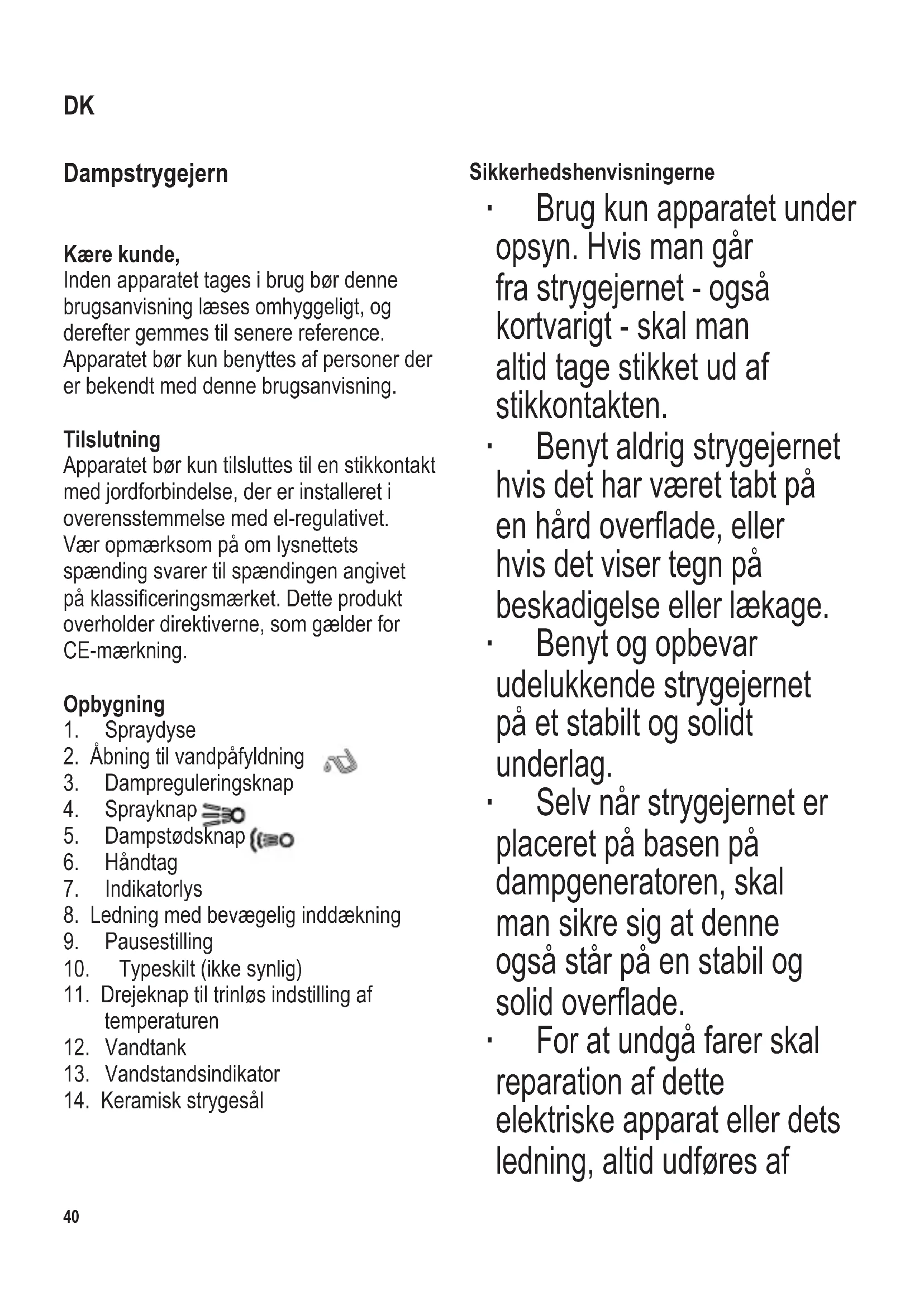 Sikkerhedshenvisningerne ∙ Brug kun apparatet under opsyn. Hvis man går fra strygejernet - også kortvarigt - skal man altid tage stikket ud af stikkontakten. ∙ Benyt aldrig strygejernet hvis det har været tabt på enhårdoverade,eller hvis det viser tegn på beskadigelse eller lækage. ∙ Benyt og opbevar udelukkende strygejernet på et stabilt og solidt underlag. ∙ Selv når strygejernet er placeret på basen på dampgeneratoren, skal man sikre sig at denne også står på en stabil og solidoverade. ∙ For at undgå farer skal reparation af dette elektriske apparat eller dets ledning, altid udføres af DK104 x 142 mm