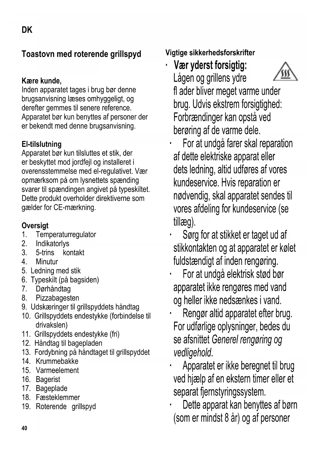 Vigtige sikkerhedsforskrifter ∙ Vær yderst forsigtig: Lågen og grillens ydre fl ader bliver meget varme under brug. Udvis ekstrem forsigtighed: Forbrændinger kan opstå ved berøring af de varme dele. ∙ For at undgå farer skal reparation af dette elektriske apparat eller dets ledning, altid udføres af vores kundeservice. Hvis reparation er nødvendig, skal apparatet sendes til vores afdeling for kundeservice (se tillæg). ∙ Sørg for at stikket er taget ud af stikkontakten og at apparatet er kølet fuldstændigt af inden rengøring. ∙ For at undgå elektrisk stød bør apparatet ikke rengøres med vand og heller ikke nedsænkes i vand. ∙ Rengør altid apparatet efter brug. For udførlige oplysninger, bedes du se afsnittet Generel rengøring og vedligehold. ∙ Apparatet er ikke beregnet til brug ved hjælp af en ekstern timer eller et separat fjernstyringssystem. ∙ Dette apparat kan benyttes af børn (som er mindst 8 år) og af personer DK41 med reducerede fysiske, sensoriske eller mentale evner, eller mangel på erfaring eller viden, såfremt de har fået vejledning og instruktion i brugen af dette apparat og fuldt ud forstår alle farer og forholdsregler vedrørende sikkerheden som brug af apparatet medfører. ∙ Børn må aldrig få lov til at lege med apparatet. ∙ Børn må aldrig få lov til at udføre rengørings- eller vedligeholdelsesarbejde på dette apparat, medmindre de er under opsyn og mindst 8 år gamle. ∙ Apparatet og dets ledning må altid holdes væk fra børn som er yngre en 8 år. ∙ Advarsel: Hold børn væk fra emballeringen, da denne udgør en mulig risiko for tilskadekomst, ved f.eks. kvælning. ∙ Inden apparatet benyttes må både apparatet og dets tilbehør ses grundigt efter for fejl. Hvis apparatet for eksempel har været tabt på en hård overfl ade eller der er blevet trukket i ledningen med stor kraft, må det ikke længere benyttes: Selv skader der ikke er synlige kan have ugunstig indvirkning på sikkerheden ved brug af apparatet. ∙ Rør aldrig ved varmeelementerne. ∙ Inden apparatet tages i brug, skal krummebakken anbringes på plads under de nederste varmeelementer ∙ Overophedet olie eller fedt kan let antænde. Overfyld derfor aldrig bageformen; dermed undgår du, at fedt drypper ned på varmeelementerne nedenunder. ∙ Efterlad ikke tilsluttede apparater uden opsyn. ∙ Benyt aldrig apparatet udendørs. ∙ Der skal altid være tilstrækkelig ventilation. Placer ikke andre ting ovenpå ovnen, og sørg for at overholde følgende minimumsafstande mellem ovn og vægge eller andre genstande: Siderne: 12 cm Bagpå: 12 cm Top: 30 cm ∙ Apparatet må ikke installeres inde i et skab; når ovnen skal placeres bør man også sikre sig at den ikke står tæt op under et skab eller noget tilsvarende. ∙ Fødderne under ovnen må ikke fjernes. ∙ Undlad at placere eller benytte apparatet tæt ved eller under køkkenoverskabe, eller under hængende genstande såsom gardiner eller andet brandbart materiale. ∙ Brug kun apparatet på et varmefast arbejdsbord, som tåler stænk og pletter. Placer ikke apparatet på eller nær ved varme overfl ader, åben ild eller letantændelige dampe. ∙ Advarsel: Pizzabagestenen bliver meget varm under brug og vil bruge lang tid til at køle af selv efter at der er slukket for ovnen og stikket er taget ud af stikkontakten. Der er stor risiko for brandsår ved berøring. ∙ Lad altid pizzabagestenen køle fuldstændigt af inden den tages ud af ovnen.42 ∙ Advarsel: Læg ikke stanniol eller lignende mellem grillristen og pizzabagestenen. Placer bagestenen direkte på risten. ∙ Lad ikke ledningen komme i berøring med nogle af apparatets varme dele. ∙ Lad ikke ledningen hænge løst ud over bordkanten. ∙ Sluk altid for apparatet og tag stikket ud af stikkontakten - efter brug, - i tilfælde af fejlfunktion, - inden rengøring af apparatet. ∙ Træk aldrig i selve ledningen, når ledningen tages ud af stikkontakten; tag altid fat i selve stikket. ∙ Vi påtager os intet ansvar for skader, som skyldes misbrug eller manglende overholdelse af denne brugsanvisning. ∙ Dette apparat er beregnet til privat brug eller i tilsvarende omgivelser, såsom - kontorer eller andre mindre virksomheder, - landbrugsvirksomheder, - af kunder på hoteller, moteller m.m. og tilsvarende foretagender, - B&B pensionater. Temperaturregulator Temperaturregulatoren bruges til at vælge den ønskede temperaturindstilling. Indikatorlyset tænder efter at minuturet er aktiveret. Indikatorlyset slukker så snart den forindstillede temperatur er nået. Indstillinger på 5-trins kontakten Begge varmeelementerne og det roterende grillspyd er slukket Overvarme Overvarme og roterende grillspyd Over- og undervarme Undervarme Varmeelementerne vil først tænde efter at minuturet er aktiveret. Minutur Med minuturet kan man vælge den ønskede tilberedningstid (max. 60 minutter). Indikatorlampen vil være tændt mens varmelementerne er i brug. Efter den indstillede tid er gået vil et akustisk signal angive at varmeelementerne er slukkede. For at slukke for apparatet må også begge varmeelementerne være slukkede. Varmluftsfunktion Ventilatoren til varmluft aktiveres automatisk når der tændes for varmeelementerne. Roterende grillspyd Når man benytter det roterende grillspyd, er det kun det øverste varmeelement der er i brug. ∙ Inden grillspyddet tages i brug skal man altid sørge for at bageristen og bagepladen er korrekt placeret i en af de nederste styrende riller. ∙ Når man sætter maden der skal tilberedes fast på grillspyddet, skal man sørge for at den ikke berører hverken varmeelementet foroven eller bagepladen forneden – sørg for tilstrækkelig afstand. ∙ Stik maden der skal tilberedes fast på spyddet og vær særlig opmærksom på om spyddet sidder midt i maden. Dette skal sikre at der er tilstrækkelig afstand fra bagepladen, ovnens sider og varmeelementer til maden. Benyt fæsteklemmerne til at fastho