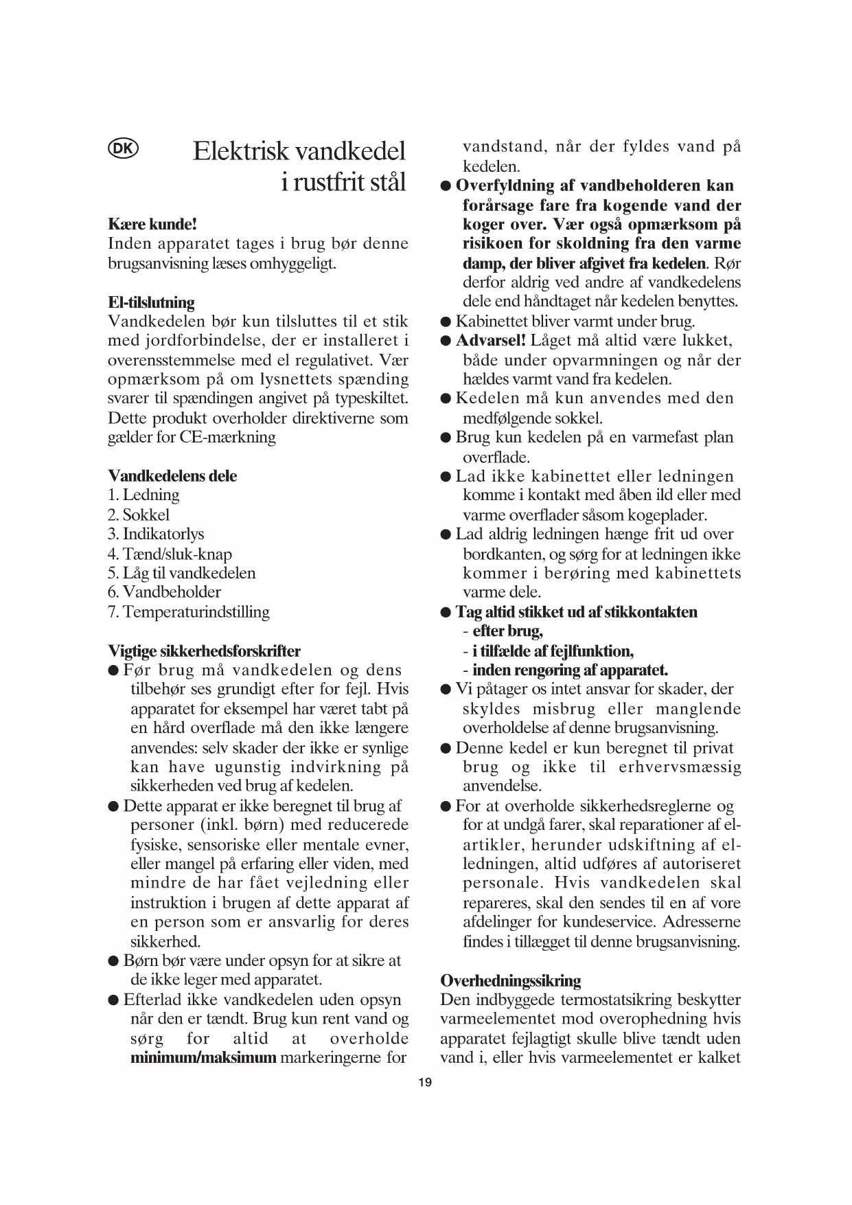 Vandkedelen bør kun tilsluttes til et stik med jordforbindelse, der er installerer i overensstemmelse med el regulativet. Vær opmaerk som pa om lysnettets spanding svarer til spændingen angivet pa typeskiltet. Dette produit overholder direktiverne som gelder for CE-mærkning