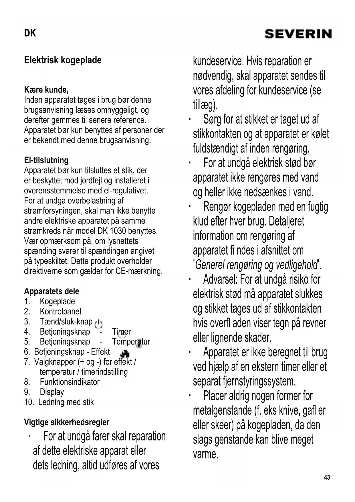 Vigtige sikkerhedsregler ∙ For at undgå farer skal reparation af dette elektriske apparat eller dets ledning, altid udføres af vores kundeservice. Hvis reparation er nødvendig, skal apparatet sendes til vores afdeling for kundeservice (se tillæg). ∙ Sørg for at stikket er taget ud af stikkontakten og at apparatet er kølet fuldstændigt af inden rengøring. ∙ For at undgå elektrisk stød bør apparatet ikke rengøres med vand og heller ikke nedsænkes i vand. ∙ Rengør kogepladen med en fugtig klud efter hver brug. Detaljeret information om rengøring af apparatet fi ndes i afsnittet om ’Generel rengøring og vedligehold’. ∙ Advarsel: For at undgå risiko for elektrisk stød må apparatet slukkes og stikket tages ud af stikkontakten hvis overfl aden viser tegn på revner eller lignende skader. ∙ Apparatet er ikke beregnet til brug ved hjælp af en ekstern timer eller et separat fjernstyringssystem. ∙ Placer aldrig nogen former for metalgenstande (f. eks knive, gafl er eller skeer) på kogepladen, da den slags genstande kan blive meget varme. DK44 ∙ Dette apparat kan benyttes af børn (som er mindst 8 år) og af personer med reducerede fysiske, sensoriske eller mentale evner, eller mangel på erfaring eller viden, såfremt de har fået vejledning og instruktion i brugen af dette apparat og fuldt ud forstår alle farer og forholdsregler vedrørende sikkerheden som brug af apparatet medfører. ∙ Børn må aldrig få lov til at lege med apparatet. ∙ Børn må aldrig få lov til at udføre nogen former for rengøring eller vedligehold af dette apparat medmindre de er under opsyn. ∙ Apparatet og dets ledning må altid holdes væk fra børn som er yngre en 8 år. ∙ Advarsel: Hold børn væk fra emballeringen, da denne udgør en mulig risiko for tilskadekomst, ved f.eks. kvælning. ∙ Inden apparatet benyttes må både apparatet og dets tilbehør ses grundigt efter for fejl. Hvis apparatet for eksempel har været tabt på en hård overfl ade eller der er blevet trukket i ledningen med stor kraft, må det ikke længere benyttes: Selv skader der ikke er synlige kan have ugunstig indvirkning på sikkerheden ved brug af apparatet. ∙ Dette apparat må ikke monteres i en bordplade. ∙ Personer med indopereret pacemaker bør konsultere deres læge inden apparatet tages i brug, da pacemakerens funktion kan blive påvirket. ∙ Dette apparat bør kun benyttes når der er tilstrækkelig afstand til andre genstande som reagerer på magnetfelter (f. eks kreditkort, kassettebånd, TV apparater eller radioer). ∙ Efterlad ikke tilsluttede apparater uden opsyn. ∙ Undlad at placere eller benytte apparatet tæt ved eller under køkkenoverskabe, eller under hængende genstande såsom gardiner eller andet brandbart materiale. ∙ Under brug må apparatet placeres på et ikke-metallisk, varmefast underlag der både tåler pletter, stænk og varm damp. ∙ Sørg altid for at luften kan cirkulere frit under apparatet. Der må også altid være en minimumsafstand på 10 cm til en væg. ∙ Ventilationsrillerne på apparatet må aldrig være dækket til under brug. ∙ Brug ikke apparatet medmindre egnet kogegrej (med mad i) er blevet placeret på kogepladen. Hvis en tom gryde eller pande bliver varmet op, vil termosikringen automatisk slukke for apparatet. I sådanne tilfælde kan det imidlertid ikke helt udelukkes at selve apparatet eller kogegrejet tager skade. ∙ Advarsel: Med den varme der afgives fra kogegrejet, kan den keramiske overfl ade blive varm. Der er derfor risiko for brandsår. ∙ Advarsel: Fødevarer der indeholder fedt eller olie kan antænde hvis de overophedes. ∙ Forsøg aldrig at fl ytte apparatet når der står kogegrej på den keramiske overfl ade.45 ∙ Træk eller skub aldrig kogegrej hen over kontrolpanelet, og placer heller aldrig nogen former for kogegrej på det. ∙ Tag altid stikket ud af stikkontakten - efter brug, - i tilfælde af fejlfunktion, - inden rengøring af apparatet. ∙ Træk aldrig i selve ledningen, når ledningen tages ud af stikkontakten; tag altid fat i selve stikket. ∙ Lad ikke ledningen hænge løst ud over bordkanten. ∙ Hold altid ledningen langt væk fra apparatets varme dele. ∙ Vi påtager os ikke ansvaret for skader, der skyldes misbrug eller manglende overholdelse af denne brugsanvisning. ∙ Dette apparat er beregnet til privat brug eller i tilsvarende omgivelser, såsom - kontorer eller andre mindre virksomheder, - landhusholdninger, - af kunder på hoteller, moteller m.m. og tilsvarende foretagender, - B&B pensionater. Før brug Inden apparatet tages i brug første gang, må al tilbageværende emballage fjernes og overfl aden tørres af med en fugtig klud. Egnet kogegrej ∙ Dette apparat må kun benyttes med kogegrej der er egnet til brug på induktionskogeplader, f.eks. rustfrit stål med magnetisk jernbund, eller støbejern eller emaljeret kogegrej af stål. ∙ Man kan helt enkelt teste kogegrejets egnethed ved at holde en magnet mod bunden; hvis magneten tiltrækkes er kogegrejet egnet til at blive brugt på dette apparat. ∙ Benyt udelukkende gryder og pander med helt plan bund. ∙ Brug aldrig kogegrej hvor bunden er mindre end 2 mm tyk. ∙ Kun gryder og pander med en diameter på 12 til ca. 24 cm kan benyttes. ∙ Hvis man benytter kogegrej som ikke er egnet, vil apparatet afgive en fejlmelding (se tabellen om ’Problemløsning’). ∙ Gryder og pander med belægning kan blive ødelagt ved for kraftig varme. Det er derfor vigtigt at vælge en passende temperatur til det kogegrej som benyttes, og at følge den information som blev leveret fra producenten af kogegrejet. ∙ En maksimal belastning på 6 kg for hver kogeplade må aldrig overskrides. Indstilling af effekt /temperatur Dette apparat kan benyttes enten med kontrolfunktionen ’Effekt’ eller ’Temperatur’ . Til opvarmning af vand, dampkogning eller tilsvarende tilberedningsmetoder, anbefaler vi brug af kontrolfunktionen Effekt’ . Til 