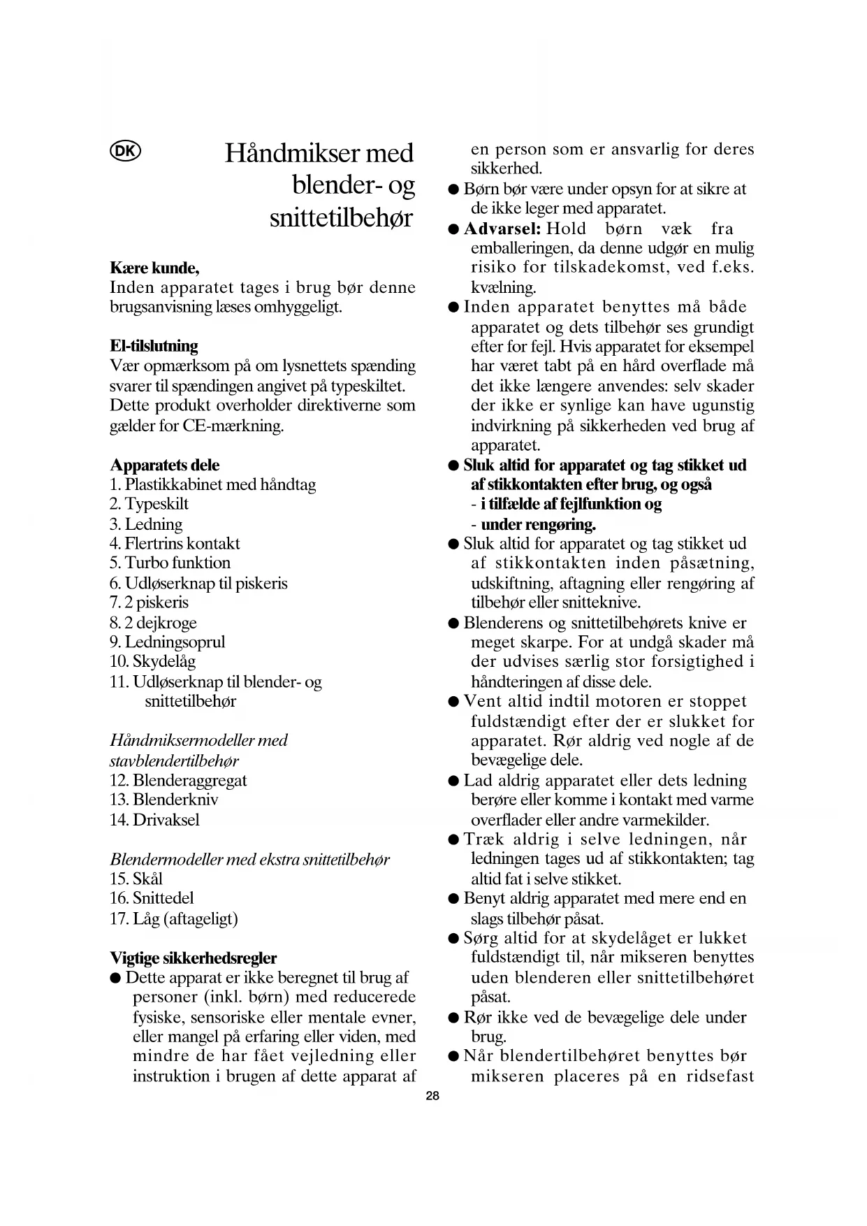 Stavblenderen er kun beregnet til at bearbejde almindelige husholdningers madportioner. När mikseren benyttes ved hastighederne 1 - 5, bör den/DD bruges kontinuierigt i mere end 10 minutter. När turbo Funktionen benyttes bör handmikseren holest kore i 30 sekunder ad gangen. Sluk for mikseren after brug og lad motoren kole fuldstendigt af.