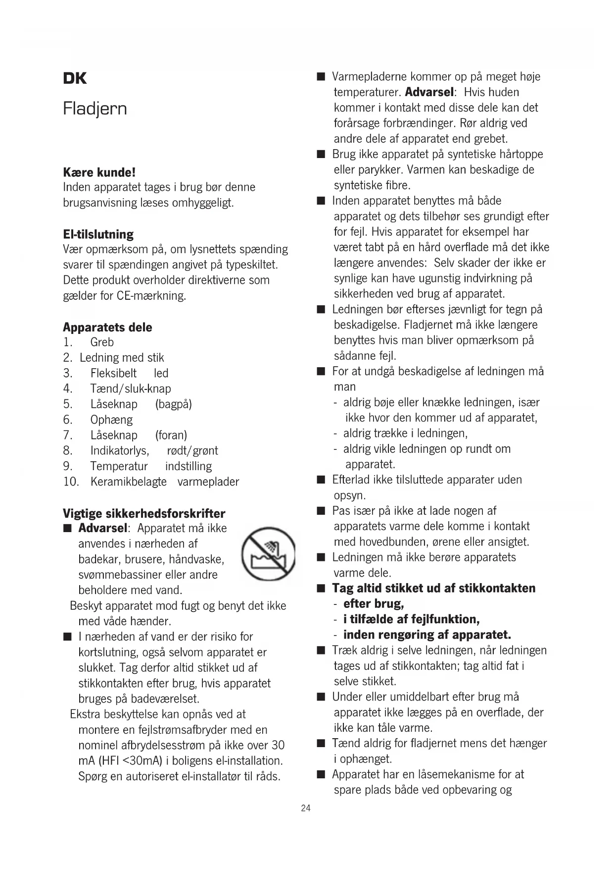 Advarel: Apparatet ma ikke anwendes iærheden af badekar, brusere, händvaske, svømmebassiner eller andre beholdere med vand.