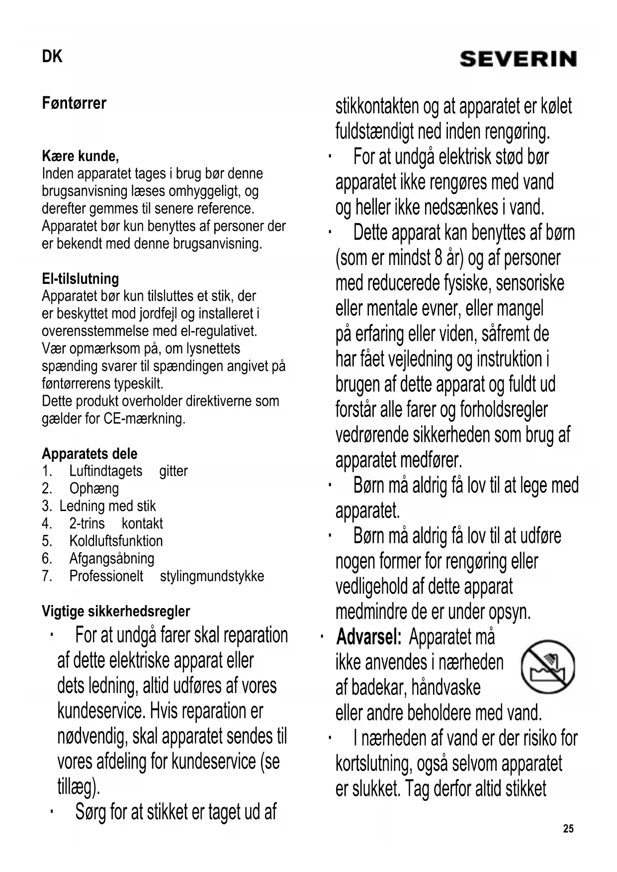 Vigtige sikkerhedsregler ∙ For at undgå farer skal reparation af dette elektriske apparat eller dets ledning, altid udføres af vores kundeservice. Hvis reparation er nødvendig, skal apparatet sendes til vores afdeling for kundeservice (se tillæg). ∙ Sørg for at stikket er taget ud af stikkontakten og at apparatet er kølet fuldstændigt ned inden rengøring. ∙ For at undgå elektrisk stød bør apparatet ikke rengøres med vand og heller ikke nedsænkes i vand. ∙ Dette apparat kan benyttes af børn (som er mindst 8 år) og af personer med reducerede fysiske, sensoriske eller mentale evner, eller mangel på erfaring eller viden, såfremt de har fået vejledning og instruktion i brugen af dette apparat og fuldt ud forstår alle farer og forholdsregler vedrørende sikkerheden som brug af apparatet medfører. ∙ Børn må aldrig få lov til at lege med apparatet. ∙ Børn må aldrig få lov til at udføre nogen former for rengøring eller vedligehold af dette apparat medmindre de er under opsyn. ∙ Advarsel: Apparatet må ikke anvendes i nærheden af badekar, håndvaske eller andre beholdere med vand. ∙ I nærheden af vand er der risiko for kortslutning, også selvom apparatet er slukket. Tag derfor altid stikket DK26 ud af stikkontakten efter brug, hvis hårtørreren bruges på badeværelset. ∙ Ekstra beskyttelse kan opnås ved at montere en fejlstrømsafbryder med en nominel afbrydelsesstrøm på ikke over 30 mA (HFI <30mA) i boligens el-installation. Spørg en autoriseret el-installatør til råds. ∙ Advarsel: Hold børn væk fra emballeringen, da denne udgør en mulig risiko for tilskadekomst, ved f.eks. kvælning. ∙ Beskyt apparatet mod fugt og benyt det ikke med våde hænder. ∙ Elektriske hårtørrere benytter meget høje temperaturer. Rør aldrig ved andre dele af hårtørreren end håndtaget. Man kan komme til at brænde sig, hvis man rører ved de varme dele. Når hårtørreren anvendes, må man kun holde fast i håndtaget. ∙ Brug ikke hårtørreren på syntetiske hårtoppe eller parykker. Varmen kan beskadige de syntetiske fi bre. ∙ Sørg for at luftindsugnings- og afgangsåbningerne ikke blokeres af fi ngre eller hår, og at der ikke samler sig fnug i luftindsugningen. ∙ Blokering af luftgennemstrømningen i hårtørreren kan bevirke at den indbyggede termosikring automatisk slukker for hårtørreren. Hvis dette sker, må man straks tage stikket ud af stikkontakten, lade hårtørreren få tilstrækkelig tid til at køle af inden det der blokerer fjernes og hårtørreren igen kan benyttes. ∙ Inden apparatet benyttes må både apparatet og dets tilbehør ses grundigt efter for fejl. Hvis apparatet for eksempel har været tabt på en hård overfl ade eller der er blevet trukket i ledningen med stor kraft, må det ikke længere benyttes: Selv skader der ikke er synlige kan have ugunstig indvirkning på sikkerheden ved brug af apparatet. ∙ For at undgå beskadigelse af ledningen må man - aldrig bøje eller knække ledningen, især ikke hvor den kommer ud af apparatet, - aldrig trække i ledningen, - aldrig vikle ledningen op rundt om apparatet. ∙ Efterlad ikke tilsluttede apparater uden opsyn. ∙ Sluk altid for apparatet og tag stikket ud af stikkontakten efter brug, og også i tilfælde af fejlfunktion. ∙ Træk aldrig i selve ledningen, når ledningen tages ud af stikkontakten; tag altid fat i selve stikket. ∙ Under eller umiddelbart efter brug må apparatet ikke lægges på en overfl ade, der ikke kan tåle varme. ∙ Vi påtager os intet ansvar for skader, der skyldes misbrug eller manglende overholdelse af denne brugsanvisning. ∙ Dette apparat er beregnet til privat brug eller i tilsvarende omgivelser, såsom - kontorer eller andre mindre virksomheder, - landbrugsvirksomheder, - af kunder på hoteller, moteller m.m. og tilsvarende foretagender, - B&B pensionater. Stylingmundstykke Stylingmundstykket kan sættes på afgangsåbningen for at lette formningen af27 håret under føntørringen. Koldluftsfunktion Koldluftsfunktionen kan benyttes når som helst under tørreprocessen. Den afgiver kold luft, som hjælper med til at fastholde og forme håret. . Sådan anvendes føntørreren Føntørreren tilsluttes en egnet stikkontakt og den ønskede indstilling vælges ved hjælp 2-trins kontakten, der er indbygget i håndtaget. Rengøring og vedligeholdelse ∙ Inden føntørreren rengøres, skal stikket tages ud af stikkontakten og man skal lade den køle helt af. ∙ For at undgå risiko for elektrisk stød må føntørreren ikke rengøres med vand, og den må ikke komme ned i vand. ∙ Hvis det er nødvendigt, kan føntørreren aftørres udvendigt med en tør, fnugfri klud. ∙ Kontroller altid luftindsugningsåbningerne for fnug og hår, der har samlet sig der og fjern dem, hvis der er nogen. Bortskaffelse Apparater mærket med dette symbol må ikke smides ud sammen med husholdningsaffaldet, da de indeholder værdifulde materialer som kan genbruges. Korrekt bortskaffelse beskytter både miljøet og menneskers helbred. Din kommune eller forhandleren kan give dig yderligere information om dette. Garantierklæring På dette husholdningsprodukt overtager vi garantien i to år fra salgsdatoen. Garantien gælder for materiale- og fabrikationsfejl. Skader, der er opstået som følge af forkert behandling, normalt slid samt på skørbare dele som f.eks. glas, dækkes ikke af garantien. Denne garanti har ingen indvirkning på dine lovmæssige rettigheder, heller ikke de nationale forbrugerrettigheder om anskaffelse af varer. Hvis produktet ikke fungerer og må returneres, skal det pakkes forsvarligt ind, og navn, adresse samt årsagen til returneringen skal vedlægges. Hvis dette sker mens garantien stadig dækker, må garantibeviset og kvitteringen også lægges ved. Garantien bortfalder ligeledes ved indgreb på produktet af folk, der ikke er autoriseret af os.28 Hårtork Bästa kund! Innan du använder apparaten bör du läsa denna bruksanvisnin