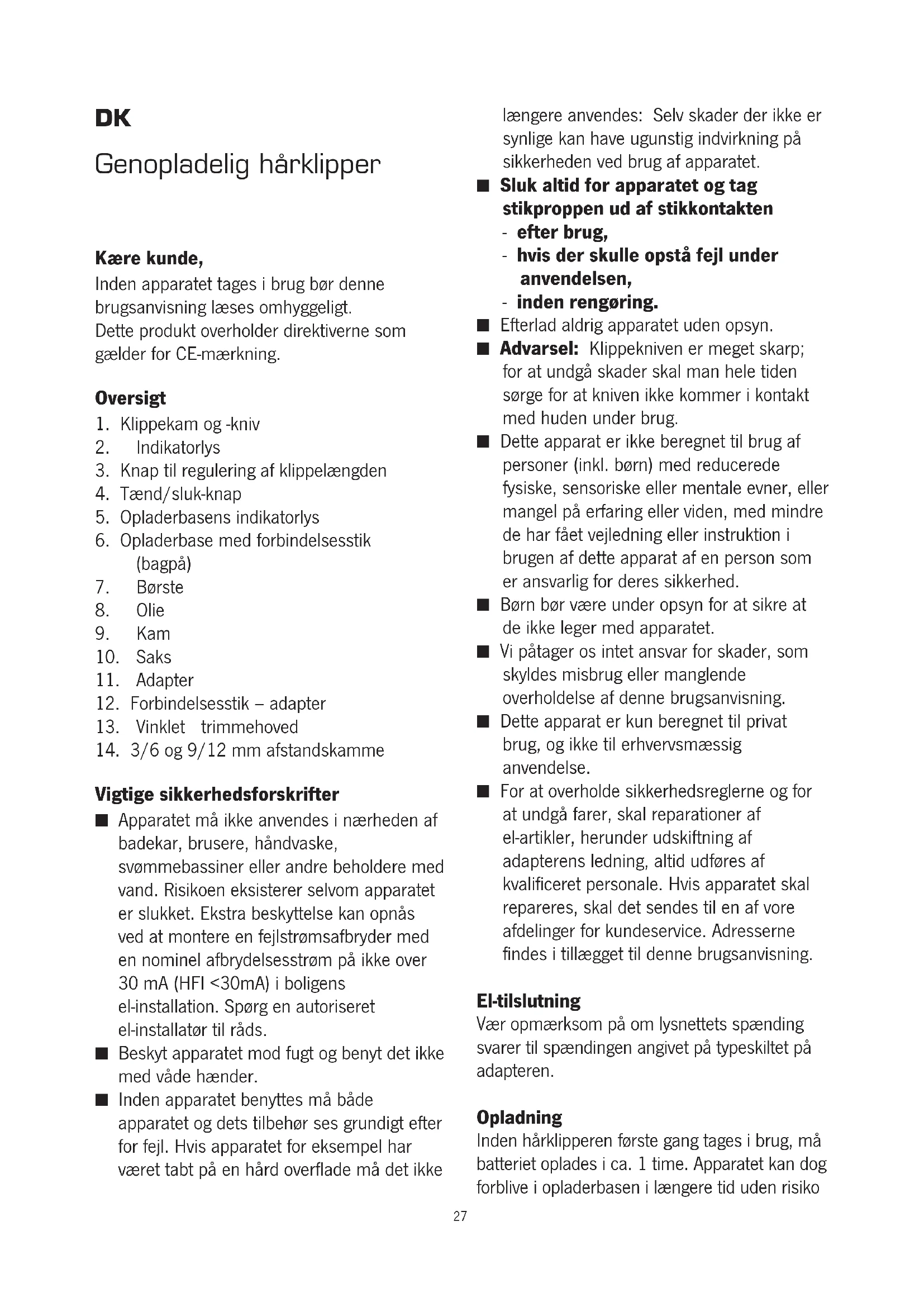 Vigtige sikkerhedsforskrifter ■ Apparatet må ikke anvendes i nærheden af badekar, brusere, håndvaske, svømmebassiner eller andre beholdere med vand. Risikoen eksisterer selvom apparatet er slukket. Ekstra beskyttelse kan opnås ved at montere en fejlstrømsafbryder med en nominel afbrydelsesstrøm på ikke over 30 mA (HFI <30mA) i boligens el-installation. Spørg en autoriseret el-installatør til råds. ■ Beskyt apparatet mod fugt og benyt det ikke med våde hænder. ■ Inden apparatet benyttes må både apparatet og dets tilbehør ses grundigt efter for fejl. Hvis apparatet for eksempel har været tabt på en hård overflade må det ikke længere anvendes: Selv skader der ikke er synlige kan have ugunstig indvirkning på sikkerheden ved brug af apparatet. ■ Sluk altid for apparatet og tag stikproppen ud af stikkontakten - efter brug, - hvis der skulle opstå fejl under anvendelsen, - inden rengøring. ■ Efterlad aldrig apparatet uden opsyn. ■ Advarsel: Klippekniven er meget skarp; for at undgå skader skal man hele tiden sørge for at kniven ikke kommer i kontakt med huden under brug. ■ Dette apparat er ikke beregnet til brug af personer (inkl. børn) med reducerede fysiske, sensoriske eller mentale evner, eller mangel på erfaring eller viden, med mindre de har fået vejledning eller instruktion i brugen af dette apparat af en person som er ansvarlig for deres sikkerhed. ■ Børn bør være under opsyn for at sikre at de ikke leger med apparatet. ■ Vi påtager os intet ansvar for skader, som skyldes misbrug eller manglende overholdelse af denne brugsanvisning. ■ Dette apparat er kun beregnet til privat brug, og ikke til erhvervsmæssig anvendelse. ■ For at overholde sikkerhedsreglerne og for at undgå farer, skal reparationer af el-artikler, herunder udskiftning af adapterens ledning, altid udføres af kvalificeret personale. Hvis apparatet skal repareres, skal det sendes til en af vore afdelinger for kundeservice. Adresserne findes i tillægget til denne brugsanvisning. El-tilslutning Vær opmærksom på om lysnettets spænding svarer til spændingen angivet på typeskiltet på adapteren. Opladning Inden hårklipperen første gang tages i brug, må batteriet oplades i ca. 1 time. Apparatet kan dog forblive i opladerbasen i længere tid uden risiko 27for beskadigelse. Hvis der under brug forekommer betydelig nedgang i hårklipperens ydeevne, eller hvis indikatoren begynder at lyse rødt, bør man slukke for apparatet og genoplade batteriet.