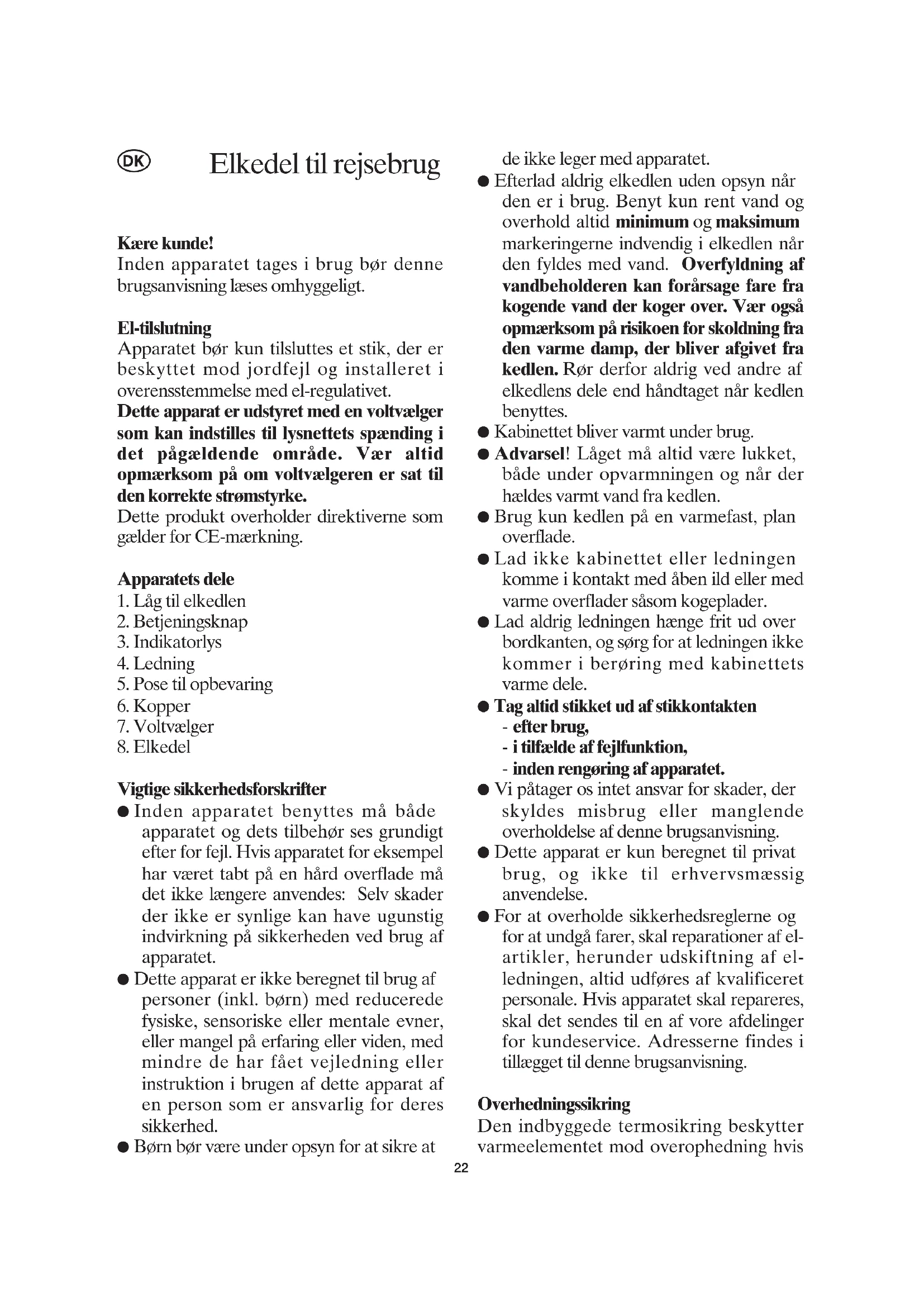 Vigtige sikkerhedsforskrifter ● Inden apparatet benyttes må både apparatet og dets tilbehør ses grundigt efter for fejl. Hvis apparatet for eksempel har været tabt på en hård overflade må det ikke længere anvendes: Selv skader der ikke er synlige kan have ugunstig indvirkning på sikkerheden ved brug af apparatet. ● Dette apparat er ikke beregnet til brug af personer (inkl. børn) med reducerede fysiske, sensoriske eller mentale evner, eller mangel på erfaring eller viden, med mindre de har fået vejledning eller instruktion i brugen af dette apparat af en person som er ansvarlig for deres sikkerhed. ● Børn bør være under opsyn for at sikre at de ikke leger med apparatet. ● Efterlad aldrig elkedlen uden opsyn når den er i brug. Benyt kun rent vand og overhold altid minimum og maksimum markeringerne indvendig i elkedlen når den fyldes med vand. Overfyldning af vandbeholderen kan forårsage fare fra kogende vand der koger over. Vær også opmærksom på risikoen for skoldning fra den varme damp, der bliver afgivet fra kedlen. Rør derfor aldrig ved andre af elkedlens dele end håndtaget når kedlen benyttes. ● Kabinettet bliver varmt under brug. ● Advarsel! Låget må altid være lukket, både under opvarmningen og når der hældes varmt vand fra kedlen. ● Brug kun kedlen på en varmefast, plan overflade. ● Lad ikke kabinettet eller ledningen komme i kontakt med åben ild eller med varme overflader såsom kogeplader. ● Lad aldrig ledningen hænge frit ud over bordkanten, og sørg for at ledningen ikke kommer i berøring med kabinettets varme dele. ● Tag altid stikket ud af stikkontakten - efter brug, - i tilfælde af fejlfunktion, - inden rengøring af apparatet. ● Vi påtager os intet ansvar for skader, der skyldes misbrug eller manglende overholdelse af denne brugsanvisning. ● Dette apparat er kun beregnet til privat brug, og ikke til erhvervsmæssig anvendelse. ● For at overholde sikkerhedsreglerne og for at undgå farer, skal reparationer af el- artikler, herunder udskiftning af el- ledningen, altid udføres af kvalificeret personale. Hvis apparatet skal repareres, skal det sendes til en af vore afdelinger for kundeservice. Adresserne findes i tillægget til denne brugsanvisning. Overhedningssikring Den indbyggede termosikring beskytter varmeelementet mod overophedning hvis
