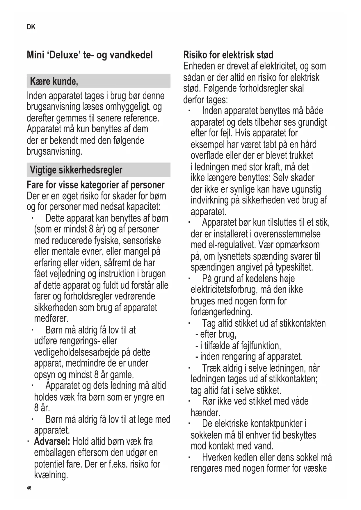 Voltaggio 220-240 V~, 50/60 Hz Potenza di energia 1850-2200 W Dimensioni di ingombro 16.5 x 21 x 22 cm Peso 1,3 kg Simboli speciali Non smaltire insieme ai riuti domestici Questo prodotto è conforme alle direttive vincolanti per l’etichettatura CE. UNLOCK “SBLOCCA”- Rilascia l’inserto del coperchio LOCK “BLOCCA” – Blocca l’inserto del coperchio46 142 x 208 mm Mini ‘Deluxe’ te- og vandkedel Kære kunde, Inden apparatet tages i brug bør denne brugsanvisning læses omhyggeligt, og derefter gemmes til senere reference. Apparatet må kun benyttes af dem der er bekendt med den følgende brugsanvisning. Vigtige sikkerhedsregler Fare for visse kategorier af personer Der er en øget risiko for skader for børn og for personer med nedsat kapacitet: ∙ Dette apparat kan benyttes af børn (som er mindst 8 år) og af personer med reducerede fysiske, sensoriske eller mentale evner, eller mangel på erfaring eller viden, såfremt de har fået vejledning og instruktion i brugen af dette apparat og fuldt ud forstår alle farer og forholdsregler vedrørende sikkerheden som brug af apparatet medfører. ∙ Børn må aldrig få lov til at udføre rengørings- eller vedligeholdelsesarbejde på dette apparat, medmindre de er under opsyn og mindst 8 år gamle. ∙ Apparatet og dets ledning må altid holdes væk fra børn som er yngre en 8 år. ∙ Børn må aldrig få lov til at lege med apparatet. ∙ Advarsel: Hold altid børn væk fra emballagen eftersom den udgør en potentiel fare. Der er f.eks. risiko for kvælning. Risiko for elektrisk stød Enheden er drevet af elektricitet, og som sådan er der altid en risiko for elektrisk stød. Følgende forholdsregler skal derfor tages: ∙ Inden apparatet benyttes må både apparatet og dets tilbehør ses grundigt efter for fejl. Hvis apparatet for eksempel har været tabt på en hård overade eller der er blevet trukket i ledningen med stor kraft, må det ikke længere benyttes: Selv skader der ikke er synlige kan have ugunstig indvirkning på sikkerheden ved brug af apparatet. ∙ Apparatet bør kun tilsluttes til et stik, der er installeret i overensstemmelse med el-regulativet. Vær opmærksom på, om lysnettets spænding svarer til spændingen angivet på typeskiltet. ∙ På grund af kedelens høje elektricitetsforbrug, må den ikke bruges med nogen form for forlængerledning. ∙ Tag altid stikket ud af stikkontakten - efter brug, - i tilfælde af fejlfunktion, - inden rengøring af apparatet. ∙ Træk aldrig i selve ledningen, når ledningen tages ud af stikkontakten; tag altid fat i selve stikket. ∙ Rør ikke ved stikket med våde hænder. ∙ De elektriske kontaktpunkter i sokkelen må til enhver tid beskyttes mod kontakt med vand. ∙ Hverken kedlen eller dens sokkel må rengøres med nogen former for væske DK47 142 x 208 mm eller nedsænkes i væske; bør heller aldrig rengøres under rindende vand. ∙ Kedlen må kun anvendes med den medfølgende sokkel. ∙ Fjern aldrig vandkedlen fra sokkelen (eller påsæt den igen) mens apparatet er tændt. Fare for forbrændinger og skoldning ∙ Kabinettets ydre ader bliver varme under brug og forbliver varme et godt stykke tid bagefter. ∙ Efterlad ikke vandkedlen uden opsyn når den er tændt. Brug kun rent vand og sørg for altid at overholde minimum (0,5 l) og maksimum (0,75 l til te eller 1,0 l til kun vand) markeringerne for vandstand, når der fyldes vand på kedlen. Overfyldning af vandbeholderen kan forårsage fare fra kogende vand der koger over. ∙ Når du kun koger vand, fjern altid telteret. ∙ Overskrid ikke 70 °C, når du genopvarmer te. Forsigtig: Lad ikke komme i kog, da væsken kan skumme over. ∙ Vær også opmærksom på risikoen for skoldning fra den varme damp, der bliver afgivet fra kedlen. Rør derfor aldrig ved andre af vandkedlens dele end håndtaget når kedlen benyttes. ∙ Låget må altid være lukket, både under opvarmningen og når der hældes varmt vand fra kedelen. ∙ Advarsel: For at undgå at glasset revner, fyld ikke den varme beholder med koldt vand. Manglende hygiejne Manglende hygiejne kan medføre bakteriedannelser inden i apparatet