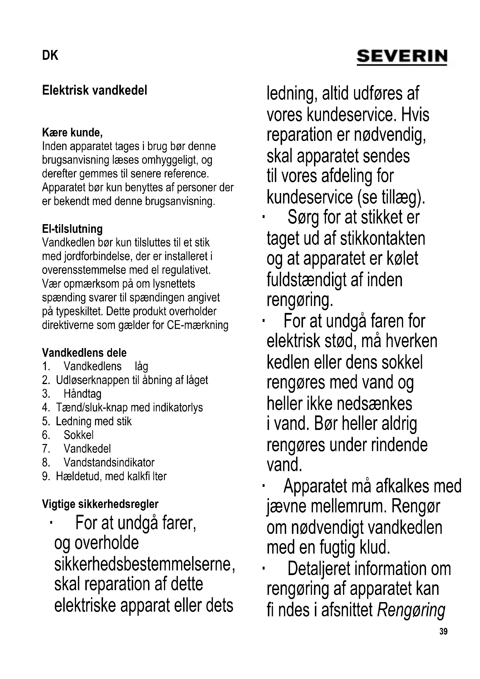 skal reparation af dette elektriske apparat eller dets ledning, altid udføres af vores kundeservice. Hvis reparation er nødvendig, skal apparatet sendes til vores afdeling for kundeservice (se tillæg). ∙ Sørg for at stikket er taget ud af stikkontakten og at apparatet er kølet fuldstændigt af inden rengøring. ∙ For at undgå faren for elektrisk stød, må hverken kedlen eller dens sokkel rengøres med vand og heller ikke nedsænkes i vand. Bør heller aldrig rengøres under rindende vand. ∙ Apparatet må afkalkes med jævne mellemrum. Rengør om nødvendigt vandkedlen med en fugtig klud. ∙ Detaljeret information om rengøring af apparatet kan fi ndes i afsnittet Rengøring DK40 og vedligehold. ∙ Dette apparat kan benyttes af børn (som er mindst 8 år) og af personer med reducerede fysiske, sensoriske eller mentale evner, eller mangel på erfaring eller viden, såfremt de har fået vejledning og instruktion i brugen af dette apparat og fuldt ud forstår alle farer og forholdsregler vedrørende sikkerheden som brug af apparatet medfører. ∙ Børn må aldrig få lov til at lege med apparatet. ∙ Børn må aldrig få lov til at udføre rengørings- eller vedligeholdelsesarbejde på dette apparat, medmindre de er under opsyn og mindst 8 år gamle. ∙ Apparatet og dets ledning må altid holdes væk fra børn som er yngre en 8 år. ∙ Dette apparat er beregnet til privat brug eller i tilsvarende omgivelser, såsom - i tekøkkener, kontorer eller andre mindre virksomheder, - landbrugsvirksomheder, - af kunder på hoteller, moteller m.m. og tilsvarende foretagender, - B&B pensionater. ∙ Kabinettets ydre fl ader bliver varme under brug og forbliver varme et godt stykke tid bagefter. ∙ Efterlad ikke vandkedlen uden opsyn når den er tændt. Brug kun rent vand når vandkedlen fyldes til det ønskede niveau, overhold minimum (0,5 l) og maksimum (1,0 l) markeringerne på vandstandsindikator. Overfyldning af41 vandbeholderen kan forårsage fare fra kogende vand der koger over. ∙ Vær også opmærksom på risikoen for skoldning fra den varme damp, der bliver afgivet fra kedlen. Rør derfor aldrig ved andre af vandkedlens dele end håndtaget når kedlen benyttes. ∙ Advarsel: Låget skal altid være lukket, både under opvarmningen og når der hældes varmt vand fra kedlen. ∙ Kedlen må kun anvendes med den medfølgende sokkel. ∙ Fjern aldrig vandkedlen fra sokkelen (eller påsæt den igen) mens apparatet er tændt. ∙ Hvis vandkedlen ikke står på sin sokkel, sørg for at den ikke kan glide på en glat overfl ade. ∙ De elektriske kontaktpunkter i sokkelen må til enhver tid beskyttes mod kontakt med vand. ∙ Advarsel: Misbrug kan forårsage alvorlig personskade. ∙ Advarsel: Hold børn væk fra emballeringen, da denne udgør en mulig risiko for tilskadekomst, ved f.eks. kvælning. ∙ Inden apparatet benyttes må både apparatet og dets tilbehør ses grundigt efter for fejl. Hvis apparatet for eksempel har været tabt på en hård overfl ade eller der er blevet trukket i ledningen med stor kraft, må det ikke længere benyttes: Selv skader der ikke er synlige kan have ugunstig indvirkning på sikkerheden ved brug af apparatet. ∙ Brug kun kedlen på en varmefast plan overfl ade. ∙ Benyt aldrig apparatet under et overskab eller en tilsvarende genstand; der er risiko for at dampudslip kan samle sig under sådanne. ∙ Lad ikke kabinettet eller ledningen komme i kontakt med åben ild eller med varme overfl ader såsom kogeplader. ∙ Lad aldrig ledningen hænge frit ud over bordkanten, og sørg for at ledningen ikke kommer i berøring med apparatets varme dele. ∙ Vær særlig forsigtig, når du bærer42 kedlen med varmt vand. ∙ Tag altid stikket ud af stikkontakten - efter brug, - i tilfælde af fejlfunktion, - inden rengøring af apparatet. Korrekt anvendelse ∙ Dette apparat er udelukkende beregnet til opvarmning af rent, friskt vand. Enhver anden anvendelse må anses for ukorrekt og kan medføre personskader eller materielle skader. ∙ Det er ikke egnet til opvarmning af mælk, te eller andre føde- eller drikkevarer. Overophedningssikring Den forindstillede termosikring beskytter varmeelementet mod overophedning, hvis apparatet fejlagtigt skulle blive tændt uden vand i, eller hvis varmeelementet er kalket til. Såfremt sikringen har afbrudt kedlen, må den have tid til at køle tilstrækkeligt af, eller afkalkes inden der tændes for den igen. Før brug For at sikre at kedlen er fuldstændig ren, bør det første hold vand koges og kasseres. Kogning af vand ∙ Tag vandkedlen af sokkelen. ∙ Tryk på udløserknappen på håndtaget for at åbne låget, og fyld kedlen med vand op til det ønskede niveau, under hensyntagen til Min (0,5 l) og Max (1,0 l) markeringerne. ∙ Luk låget og sæt kedlen tilbage på sokkelen. ∙ Indsæt stikket i en passende stikkontakt og tryk ned på tænd/sluk-knappen. Indikatorlyset tænder. ∙ Kogeprocessen starter. Apparatet vil automatisk slukke når kogepunktet er nået på grund af den indbyggede dampføler. Indikatorlyset slukker. ∙ Hvis man ønsker at afbryde kogeprocessen må tænd/sluk-knappen sættes hen på positionen “Off”. ∙ Når det kogende vand skal hældes fra, tages vandkedlen af sokkelen. ∙ Sørg for at låget forbliver lukket mens vandet hældes fra kedlen, derved undgår man at kedlen afgiver kogende damp. ∙ Tag stikket ud af stikkontakten efter brug. ∙ Lad aldrig noget vand stå tilovers i vandkedlen. Oprulningsrummet til ledningen Oprulningsrummet til ledningen i bunden af vandkedlen forenkler tilpasning af ledningslængden når apparatet er i brug og gør det enkelt at pakke kedlen væk. Afkalkning ∙ Afhængigt af vandkvaliteten i området, kan der sætte sig kalkafl ejringer på varmeelementet. Det anbefales at fjerne sådanne afl ejringer med jævne mellemrum. ∙ Garantien dækker ikke hvis apparatet ikke fungerer som følge af utilstrækkelig afkalkning. ∙ En blanding af 0,5 lit