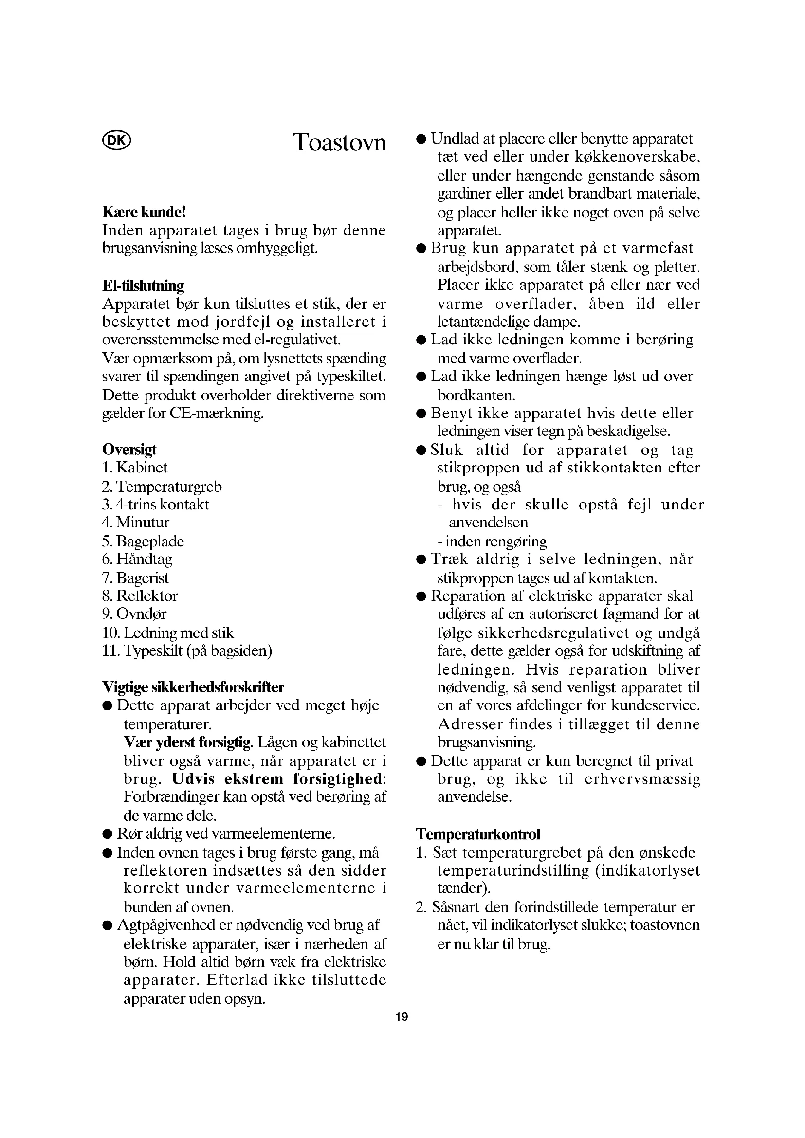 Vigtige sikkerhedsforskrifter ● Dette apparat arbejder ved meget høje temperaturer. Vær yderst forsigtig. Lågen og kabinettet bliver også varme, når apparatet er i brug. Udvis ekstrem forsigtighed: Forbrændinger kan opstå ved berøring af de varme dele. ● Rør aldrig ved varmeelementerne. ● Inden ovnen tages i brug første gang, må reflektoren indsættes så den sidder korrekt under varmeelementerne i bunden af ovnen. ● Agtpågivenhed er nødvendig ved brug af elektriske apparater, især i nærheden af børn. Hold altid børn væk fra elektriske apparater. Efterlad ikke tilsluttede apparater uden opsyn. ● Undlad at placere eller benytte apparatet tæt ved eller under køkkenoverskabe, eller under hængende genstande såsom gardiner eller andet brandbart materiale, og placer heller ikke noget oven på selve apparatet. ● Brug kun apparatet på et varmefast arbejdsbord, som tåler stænk og pletter. Placer ikke apparatet på eller nær ved varme overflader, åben ild eller letantændelige dampe. ● Lad ikke ledningen komme i berøring med varme overflader. ● Lad ikke ledningen hænge løst ud over bordkanten. ● Benyt ikke apparatet hvis dette eller ledningen viser tegn på beskadigelse. ● Sluk altid for apparatet og tag stikproppen ud af stikkontakten efter brug, og også - hvis der skulle opstå fejl under anvendelsen - inden rengøring ● Træk aldrig i selve ledningen, når stikproppen tages ud af kontakten. ● Reparation af elektriske apparater skal udføres af en autoriseret fagmand for at følge sikkerhedsregulativet og undgå fare, dette gælder også for udskiftning af ledningen. Hvis reparation bliver nødvendig, så send venligst apparatet til en af vores afdelinger for kundeservice. Adresser findes i tillægget til denne brugsanvisning. ● Dette apparat er kun beregnet til privat brug, og ikke til erhvervsmæssig anvendelse. Temperaturkontrol