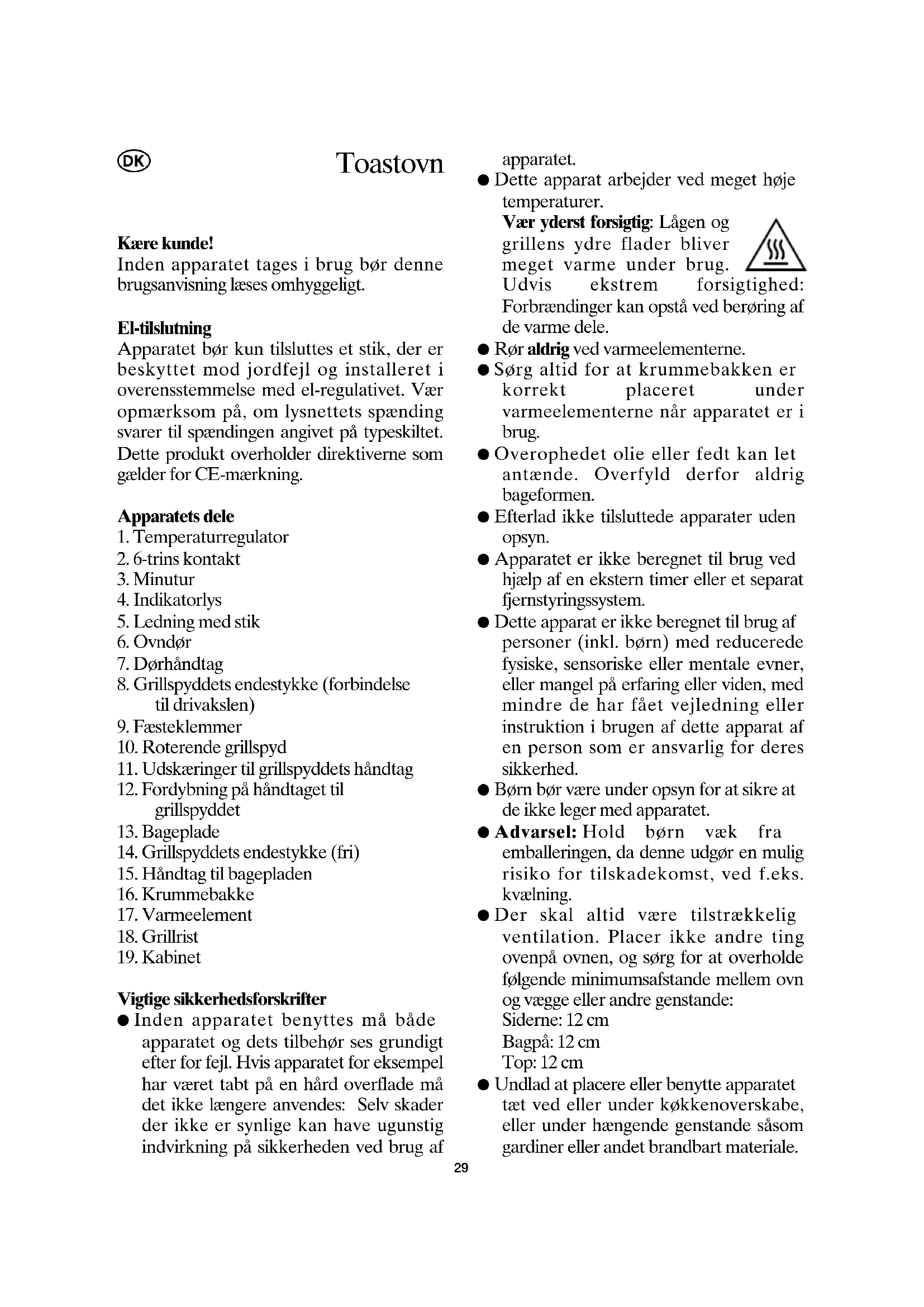 Vigtige sikkerhedsforskrifter ● Inden apparatet benyttes må både apparatet og dets tilbehør ses grundigt efter for fejl. Hvis apparatet for eksempel har været tabt på en hård overflade må det ikke længere anvendes: Selv skader der ikke er synlige kan have ugunstig indvirkning på sikkerheden ved brug af apparatet. ● Dette apparat arbejder ved meget høje temperaturer. Vær yderst forsigtig: Lågen og grillens ydre flader bliver meget varme under brug. Udvis ekstrem forsigtighed: Forbrændinger kan opstå ved berøring af de varme dele. ● Rør aldrig ved varmeelementerne. ● Sørg altid for at krummebakken er korrekt placeret under varmeelementerne når apparatet er i brug. ● Overophedet olie eller fedt kan let antænde. Overfyld derfor aldrig bageformen. ● Efterlad ikke tilsluttede apparater uden opsyn. ● Apparatet er ikke beregnet til brug ved hjælp af en ekstern timer eller et separat fjernstyringssystem. ● Dette apparat er ikke beregnet til brug af personer (inkl. børn) med reducerede fysiske, sensoriske eller mentale evner, eller mangel på erfaring eller viden, med mindre de har fået vejledning eller instruktion i brugen af dette apparat af en person som er ansvarlig for deres sikkerhed. ● Børn bør være under opsyn for at sikre at de ikke leger med apparatet. ● Advarsel: Hold børn væk fra emballeringen, da denne udgør en mulig risiko for tilskadekomst, ved f.eks. kvælning. ● Der skal altid være tilstrækkelig ventilation. Placer ikke andre ting ovenpå ovnen, og sørg for at overholde følgende minimumsafstande mellem ovn og vægge eller andre genstande: Siderne: 12 cm Bagpå: 12 cm Top: 12 cm ● Undlad at placere eller benytte apparatet tæt ved eller under køkkenoverskabe, eller under hængende genstande såsom gardiner eller andet brandbart materiale.