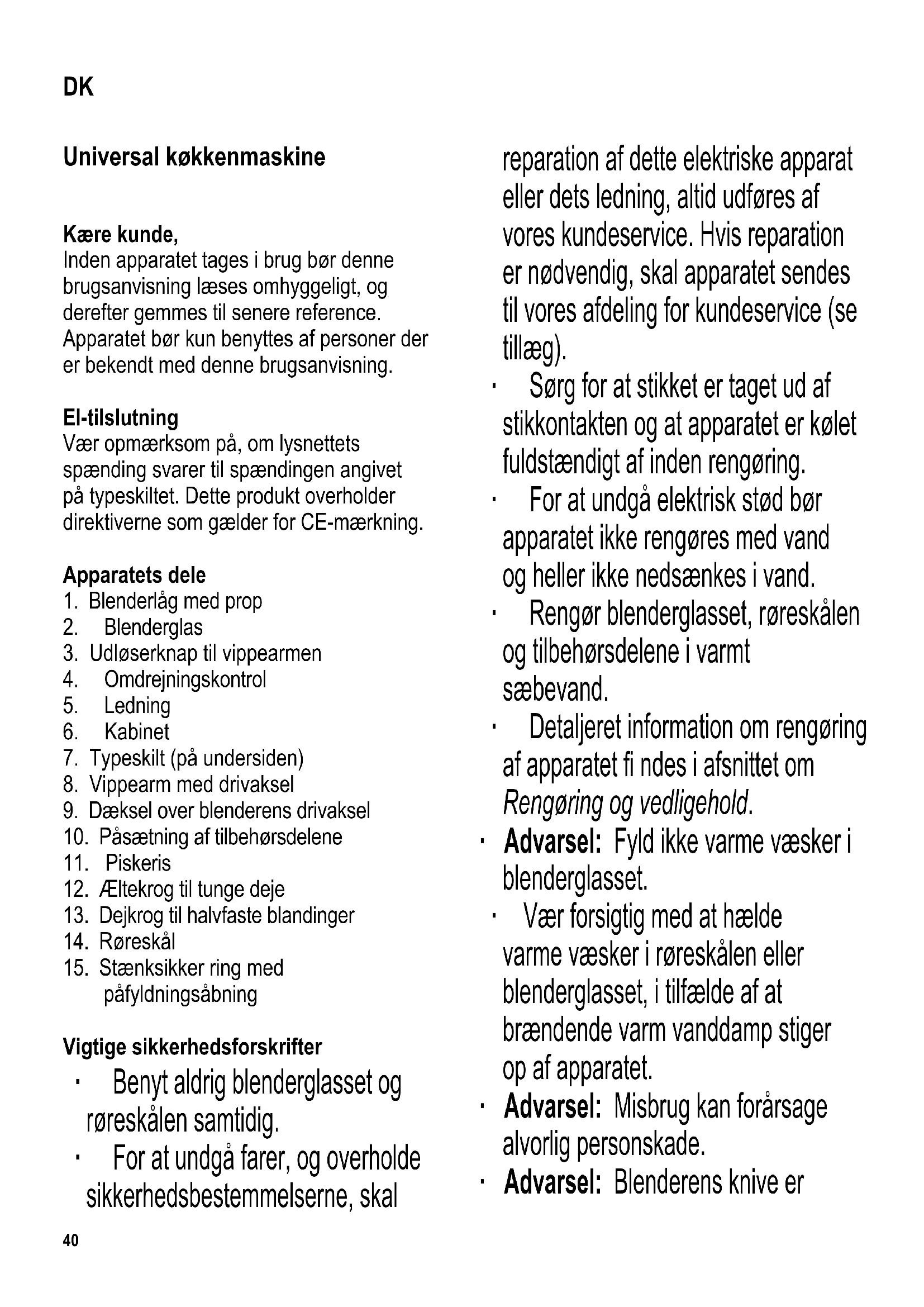 påfyldningsåbning Vigtige sikkerhedsforskrifter ∙ Benyt aldrig blenderglasset og røreskålen samtidig. ∙ For at undgå farer, og overholde sikkerhedsbestemmelserne, skal reparation af dette elektriske apparat eller dets ledning, altid udføres af vores kundeservice. Hvis reparation er nødvendig, skal apparatet sendes til vores afdeling for kundeservice (se tillæg). ∙ Sørg for at stikket er taget ud af stikkontakten og at apparatet er kølet fuldstændigt af inden rengøring. ∙ For at undgå elektrisk stød bør apparatet ikke rengøres med vand og heller ikke nedsænkes i vand. ∙ Rengør blenderglasset, røreskålen og tilbehørsdelene i varmt sæbevand. ∙ Detaljeret information om rengøring af apparatet fi ndes i afsnittet om Rengøring og vedligehold. ∙ Advarsel: Fyld ikke varme væsker i blenderglasset. ∙ Vær forsigtig med at hælde varme væsker i røreskålen eller blenderglasset, i tilfælde af at brændende varm vanddamp stiger op af apparatet. ∙ Advarsel: Misbrug kan forårsage alvorlig personskade. ∙ Advarsel: Blenderens knive er DK41 ekstremt skarpe. For at undgå tilskadekomst skal man være meget påpasselig ved rengøringen og når blenderglasset tømmes. ∙ Tag altid stikket ud af stikkontakten - når apparatet ikke er under opsyn, - efter brug, - i tilfælde af fejlfunktion, - inden rengøring, påsætning eller aftagning af apparatets dele, - inden udskiftning af tilbehørsdelene. ∙ Træk aldrig i selve ledningen, når ledningen tages ud af stikkontakten; tag altid fat i selve stikket. ∙ Dette apparat er beregnet til privat brug eller i tilsvarende omgivelser, såsom - butikspersonale, kontorer eller andre mindre virksomheder, - landbrugsvirksomheder, - af kunder på hoteller, moteller m.m. og tilsvarende foretagender, - B&B pensionater. ∙ Apparatet må ikke benyttes af personer med reducerede fysiske, sensoriske eller mentale evner, eller mangel på erfaring eller viden, medmindre de har fået vejledning og instruktion i brugen af dette apparat og fuldt ud forstår alle farer og forholdsregler vedrørende sikkerheden som brug af apparatet medfører. ∙ Børn må aldrig få lov til at benytte dette apparat. Apparatet og dets ledning må altid holdes langt væk fra børn. ∙ Børn må aldrig få lov til at lege med apparatet. ∙ Advarsel: Hold altid børn væk fra emballagen eftersom den udgør en potentiel fare. Der er f.eks. risiko for kvælning. ∙ Inden apparatet benyttes må både apparatet og dets tilbehør ses grundigt efter for fejl. Hvis apparatet for eksempel har været tabt på en hård overfl ade eller der er blevet trukket i ledningen med stor kraft, må det ikke længere benyttes: Selv skader der ikke er synlige kan have ugunstig indvirkning på sikkerheden ved brug af apparatet. ∙ Lad aldrig apparatet eller dets ledning berøre eller komme i kontakt med varme overfl ader eller andre varmekilder. ∙ Lad aldrig ledningen hænge løst ud over bordkanten. ∙ Berør aldrig de bevægelige dele med hænderne når apparatet er i brug, og stik aldrig nogen genstande (som f.eks. dejskrabere eller grydeskeer) ned i blenderglasset medmindre motoren er stoppet fuldstændigt.42 ∙ Vi påtager os intet ansvar for skader, der skyldes misbrug eller manglende overholdelse af denne brugsanvisning. Kort tids betjening Det apparat er kun beregnet til kort tids betjening, det bør f.eks. ikke benyttes kontinuerligt i mere end 3 minutter ad gangen. Sluk herefter apparatet og lad motoren køle af inden der tændes for apparatet igen. Før brug Inden apparatet første gang tages i brug må alle dele og tilbehøret rengøres som anvist under Rengøring og vedligehold. Omdrejningskontrol Denne køkkenmaskine er udstyret med en trinløs justerbar omdrejningskontrol. Der kan vælges mellem følgende hastigheder: P kortvarig høj hastighed (puls) 0 slukket 1 meget lav hastighed 2-3 lav hastighed 4-5 middel hastighed 6 høj hastighed Brug af røreskålen Advarsel: Når røreskålen er i brug, må blenderglasset ikke sættes på, og dækslet over blenderens drivaksel må være påsat, da varmeudvikling ellers vil forårsage beskadigelse af apparatet. Omrøring i kredsbane: Tilbehøret (piskeriset, dejkrogen osv.) monteres forskudt for skålens midtpunkt, hvilket bevirker at det vil rotere dels rundt om sin egen akse dels rundt om drivakslen. Denne bevægelse sikrer grundig blanding af ingredienserne fra røreskålens side mod midten. Passende valg af omdrejningshastighed ∙ Start altid med en lav omdrejningshastighed især når der blandes fl ydende eller cremede ingredienser, eller blandinger med mel. ∙ Indstillingerne 1 til 3 er egnede til langsom piskning, blanding, tilsætning af ingredienser eller bearbejdning af fl ydende fødevarer, samt til at røre dej. ∙ Indstilling 4 er egnet til at røre kage- eller wienerbrødsdej. ∙ Indstillingerne 5 og 6 er velegnede ved brug af piskeriset. Piskeriset Piskeriset er egnet til lette blandinger af fl ydende ting såsom saucer, æggehvider eller fl øde. Piskeriset kan bruges på indstillingerne 1-6. Dejkroge Til halvfaste blandinger Denne dejkrog er velegnet til halvfaste blandinger såsom pandekagedej eller kartoffelmos på hastighedsindstillingerne 1-4. Til tunge deje Denne dejkrog er egnet til at bearbejde tunge deje på hastighedsindstillingerne 1-3. Betjening ∙ Inden påsætning, aftagning eller rengøring af tilbehøret, skal man sikre sig at apparatet er slukket og stikket er taget ud af stikkontakten.43 ∙ Advarsel: Vent altid indtil motoren er stoppet fuldstændigt efter der er slukket for apparatet. Rør aldrig ved de bevægelige dele. ∙ Tryk på udløserknappen (PUSH) for at løsne vippearmen. Vip overdelen op indtil man hører at den klikker sikkert på plads. ∙ Sæt røreskålen på og lås den fast ved at dreje den med uret. ∙ Placer den stænksikre ring på skålen med påfyldningsåbningen mod venstre. ∙ Når tilbehøret skal monteres, skal man sikre sig at tappen på