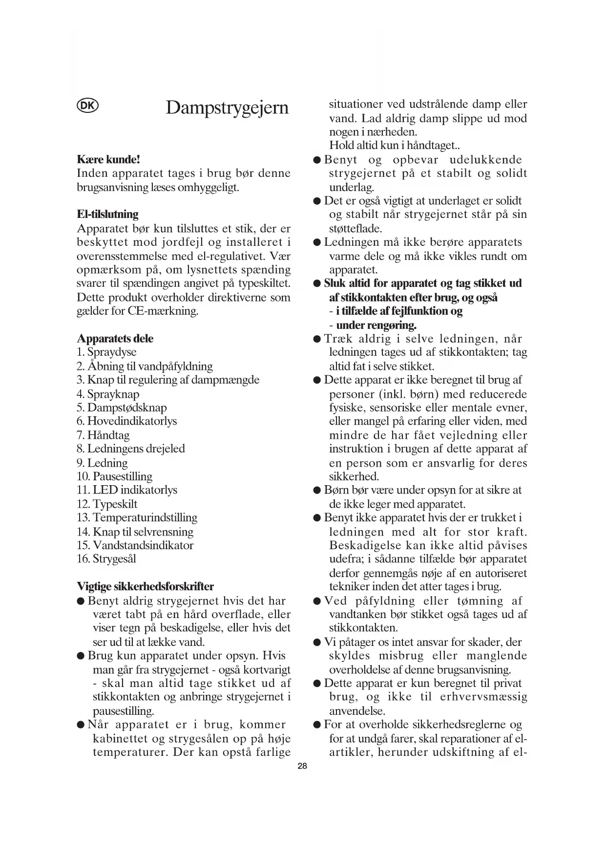 Vigtige sikkerhedsforskrifter ● Benyt aldrig strygejernet hvis det har været tabt på en hård overflade, eller viser tegn på beskadigelse, eller hvis det ser ud til at lække vand. ● Brug kun apparatet under opsyn. Hvis man går fra strygejernet - også kortvarigt - skal man altid tage stikket ud af stikkontakten og anbringe strygejernet i pausestilling. ● Når apparatet er i brug, kommer kabinettet og strygesålen op på høje temperaturer. Der kan opstå farlige situationer ved udstrålende damp eller vand. Lad aldrig damp slippe ud mod nogen i nærheden. Hold altid kun i håndtaget.. ● Benyt og opbevar udelukkende strygejernet på et stabilt og solidt underlag. ● Det er også vigtigt at underlaget er solidt og stabilt når strygejernet står på sin støtteflade. ● Ledningen må ikke berøre apparatets varme dele og må ikke vikles rundt om apparatet. ● Sluk altid for apparatet og tag stikket ud af stikkontakten efter brug, og også - i tilfælde af fejlfunktion og - under rengøring. ● Træk aldrig i selve ledningen, når ledningen tages ud af stikkontakten; tag altid fat i selve stikket. ● Dette apparat er ikke beregnet til brug af personer (inkl. børn) med reducerede fysiske, sensoriske eller mentale evner, eller mangel på erfaring eller viden, med mindre de har fået vejledning eller instruktion i brugen af dette apparat af en person som er ansvarlig for deres sikkerhed. ● Børn bør være under opsyn for at sikre at de ikke leger med apparatet. ● Benyt ikke apparatet hvis der er trukket i ledningen med alt for stor kraft. Beskadigelse kan ikke altid påvises udefra; i sådanne tilfælde bør apparatet derfor gennemgås nøje af en autoriseret tekniker inden det atter tages i brug. ● Ved påfyldning eller tømning af vandtanken bør stikket også tages ud af stikkontakten. ● Vi påtager os intet ansvar for skader, der skyldes misbrug eller manglende overholdelse af denne brugsanvisning. ● Dette apparat er kun beregnet til privat brug, og ikke til erhvervsmæssig anvendelse. ● For at overholde sikkerhedsreglerne og for at undgå farer, skal reparationer af el- artikler, herunder udskiftning af el-