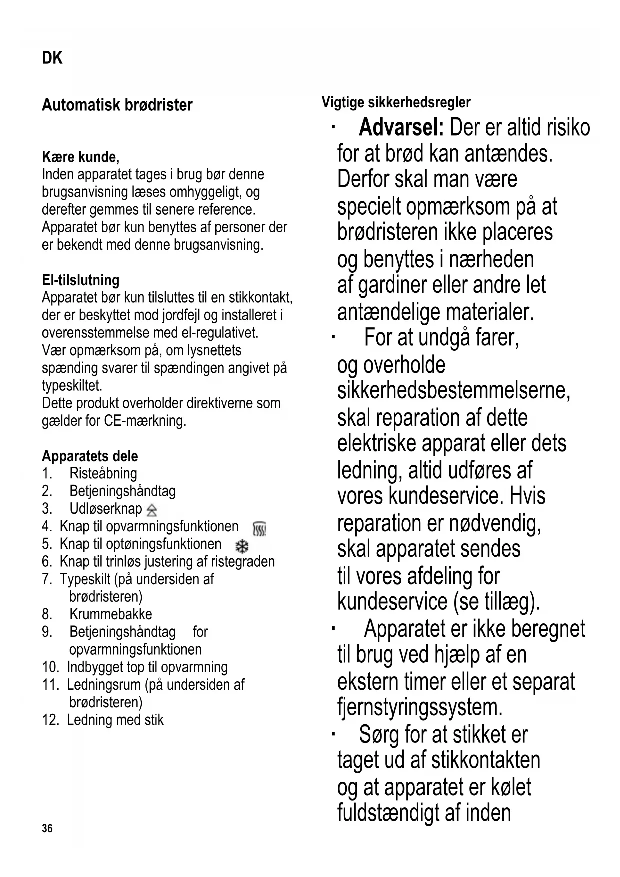 Vigtige sikkerhedsregler ∙ Advarsel: Der er altid risiko for at brød kan antændes. Derfor skal man være specielt opmærksom på at brødristeren ikke placeres og benyttes i nærheden af gardiner eller andre let antændelige materialer. ∙ For at undgå farer, og overholde sikkerhedsbestemmelserne, skal reparation af dette elektriske apparat eller dets ledning, altid udføres af vores kundeservice. Hvis reparation er nødvendig, skal apparatet sendes til vores afdeling for kundeservice (se tillæg). ∙ Apparatet er ikke beregnet til brug ved hjælp af en ekstern timer eller et separat fjernstyringssystem. ∙ Sørg for at stikket er taget ud af stikkontakten og at apparatet er kølet fuldstændigt af inden DK37 rengøring. ∙ For at undgå risiko for elektrisk stød må apparatet ikke rengøres med nogen former for væske eller nedsænkes i væske. ∙ For at rengøre kabinettet er det kun nødvendigt at aftørre ydersiden med en letfugtig klud. ∙ For at fjerne krummerne trækkes krummebakken sidelæns ud og tømmes. Sørg altid for at sætte krummebakken tilbage på plads, inden brødristeren igen benyttes. ∙ Dette apparat er beregnet til privat brug eller i tilsvarende omgivelser, såsom - butikspersonale, kontorer eller andre mindre virksomheder, - landbrugsvirksomheder, - af kunder på hoteller, moteller m.m. og tilsvarende foretagender, - B&B pensionater. ∙ Dette apparat kan benyttes af børn (som er mindst 8 år) og af personer med reducerede fysiske, sensoriske eller mentale evner, eller mangel på erfaring eller viden, såfremt de har fået vejledning og instruktion i brugen af dette apparat og fuldt ud forstår alle farer og forholdsregler vedrørende sikkerheden som brug af apparatet medfører. ∙ Børn må aldrig få lov til at lege med apparatet. ∙ Børn må aldrig få lov til at udføre rengørings- eller vedligeholdelsesarbejde på dette apparat, medmindre de er under opsyn og mindst 8 år gamle. ∙ Apparatet og dets ledning må altid holdes væk fra børn som er yngre en 8 år. ∙ Advarsel: Hold børn væk fra emballeringen, da denne udgør en38 mulig risiko for tilskadekomst, ved f.eks. kvælning. ∙ Placer altid brødristen på en jævn og varmefast overfl ade. ∙ For at undgå at beskadige kabinettet må brødristeren ikke placeres på eller nær varme overfl ader og åben ild, såsom kogeplader eller gasblus. ∙ Advarsel: Kabinettets ydre bliver meget varmt under brug. Udvis ekstrem forsigtighed: Forbrændinger kan opstå ved berøring af de varme dele. ∙ Inden apparatet benyttes må både apparatet og dets tilbehør ses grundigt efter for fejl. Hvis apparatet for eksempel har været tabt på en hård overfl ade eller der er blevet trukket i ledningen med stor kraft, må det ikke længere benyttes: Selv skader der ikke er synlige kan have ugunstig indvirkning på sikkerheden ved brug af apparatet. ∙ Sørg for at ledningen ikke berører de varme dele. ∙ Lad aldrig ledningen hænge løst ud over bordkanten. ∙ Efterlad ikke tilsluttede apparater uden opsyn. ∙ Overdæk ikke risteåbningen under brug. ∙ Forsøg ikke at fjerne brød fra brødristeren med fi ngrene eller ved at stikke andre ting (såsom knive, gafl er) ind i risteåbningen. Varmeelementerne er strømførende. ∙ Tag altid stikket ud af stikkontakten - efter brug, - i tilfælde af fejlfunktion, - inden rengøring af apparatet. ∙ Træk aldrig i selve ledningen, når ledningen tages ud af stikkontakten; tag altid fat i selve stikket. ∙ Vi påtager os intet ansvar for skader, der skyldes misbrug eller manglende overholdelse af denne brugsanvisning. Betjening Generel information ∙ Advarsel: Betjeningshåndtaget kan kun forblive nede når stikket er sat i stikkontakten. ∙ Brug ikke brødskiver der er for store eller for tykke. De kan sætte sig fast i brødristeren. Brødskiver, der skal ristes bør ikke være tykkere end 14 mm. ∙ Tag altid stikket ud af stikkontakten, hvis der opstår problemer, i tilfælde af fejlfunktion og før rengøring. ∙ Sidder en brødskive fast i risteåbningen bruges en stump træpind (såsom skaftet på en grydeske) til at få brødskiven ud. Før brug ∙ Rengør brødristeren omhyggeligt (se Rengøring og vedligehold). ∙ Tænd for brødristeren uden at komme brød i og lad den virke i mindst 5 perioder ved højeste ristegrad. ∙ Lad brødristeren køle af mellem hver risteperiode. ∙ Når brødristeren tændes første gang, kan den afgive en smule lugt (og måske lidt røg), dette vil forsvinde efter kort tid. Af den grund bør man sørge for tilstrækkelig udluftning ved at åbne vinduer eller yderdøre. Automatisk slukkefunktion Dette apparat har en automatisk slukkefunktion. Hvis et stykke brød sidder fast og ikke kan skubbes op når risteperioden er færdig, vil brødristeren automatisk slukke. Hvis dette sker, tages stikket ud af stikkontakten hvorefter brødet39 kan fjernes som beskrevet i afsnittet Generel information. Indstilling af ristegraden Den ønskede grad af ristning kan trinløst justeres ved hjælp af riste indstillingsknappen. Lyst: Drej knappen mod uret. Mørkt: Drej knappen med uret. Til toastbrød anbefaler vi at ristegraden sættes til 4. Betjening ∙ Sæt stikket i stikkontakten. ∙ Efter at have justeret ristegraden indsættes brødet i risteåbningen og betjeningshåndtaget trykkes ned. ∙ Indikatorlyset på udløserknappen (
