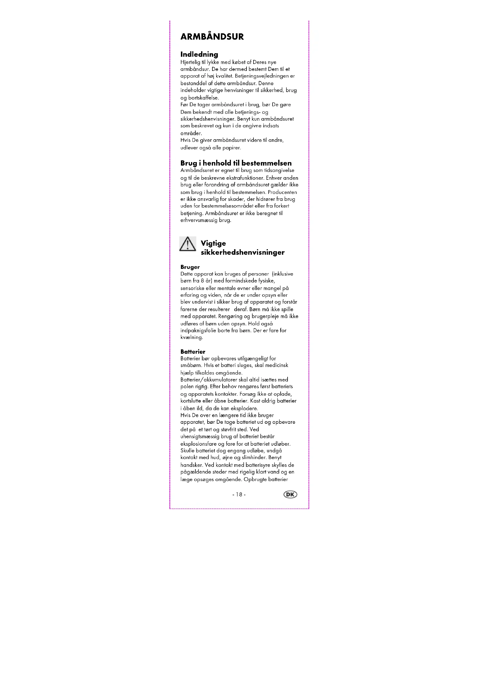 ARMBÅNDSUR Betjenings- og sikkerhedshenvisninger