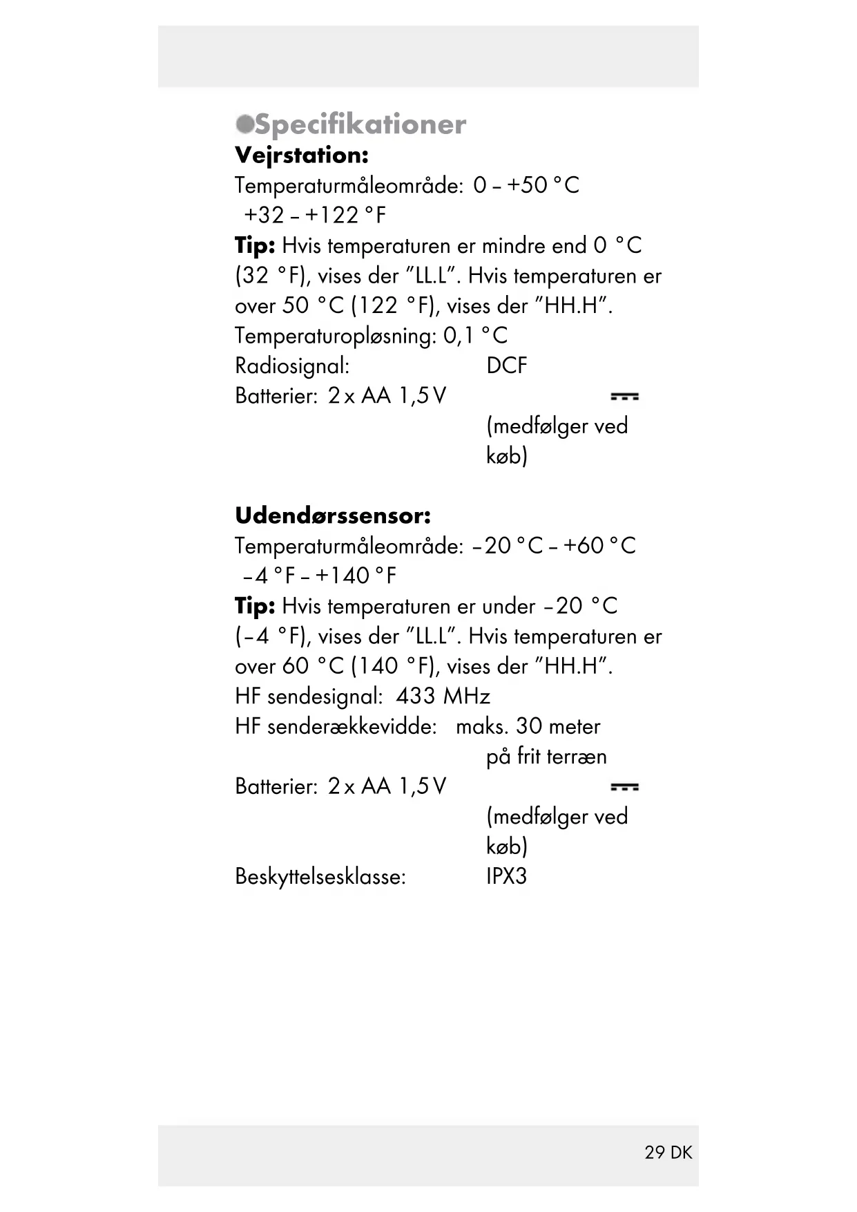 Rawlplug (ø 7,7 mm)29 DK Specifikationer Vejrstation: Temperaturmåleområde: 0 – +50 °C +32 – +122 °F Tip: Hvis temperaturen er mindre end 0 °C (32 °F), vises der ”LL.L”. Hvis temperaturen er over 50 °C (122 °F), vises der ”HH.H”. Temperaturopløsning: 0,1 °C Radiosignal: DCF Batterier: 2 x AA 1,5 V (medfølger ved køb) Udendørssensor: Temperaturmåleområde: –20 °C – +60 °C –4 °F – +140 °F Tip: Hvis temperaturen er under –20 °C (–4 °F), vises der ”LL.L”. Hvis temperaturen er over 60 °C (140 °F), vises der ”HH.H”. HF sendesignal: 433 MHz HF senderækkevidde: maks. 30 meter på frit terræn Batterier: 2 x AA 1,5 V (medfølger ved køb) Beskyttelsesklasse: IPX330 DK Sikkerhed