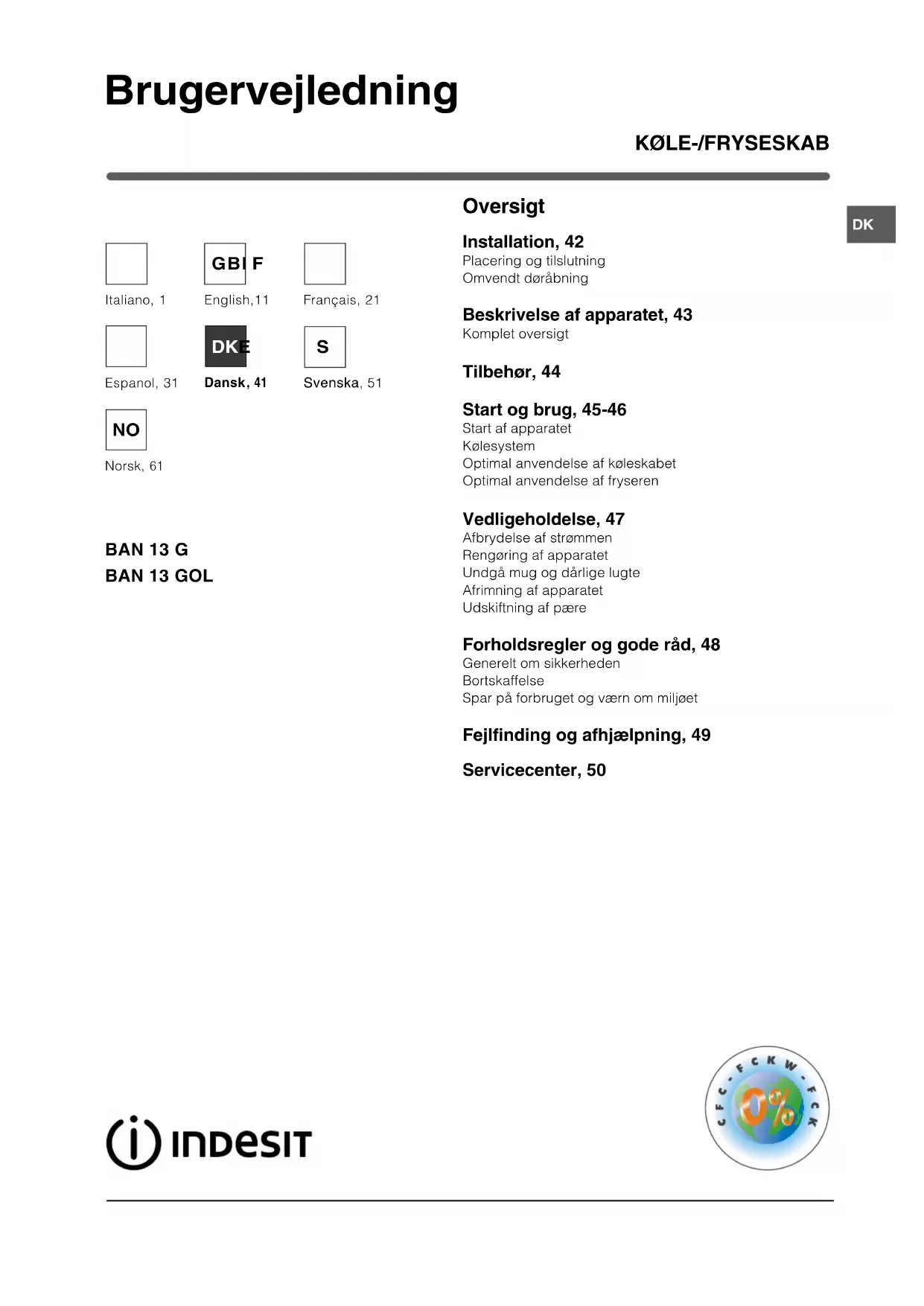 Oversigt Installation, 42 Placering og tilslutning Omvendt døråbning Beskrivelse af apparatet, 43 Komplet oversigt Tilbehør, 44 Start og brug, 45-46 Start af apparatet Kølesystem Optimal anvendelse af køleskabet Optimal anvendelse af fryseren Vedligeholdelse, 47 Afbrydelse af strømmen Rengøring af apparatet Undgå mug og dårlige lugte Afrimning af apparatet Udskiftning af pære Forholdsregler og gode råd, 48 Generelt om sikkerheden Bortskaffelse Spar på forbruget og værn om miljøet Fejlfinding og afhjælpning, 49 Servicecenter, 50 BAN 13 G BAN 13 GOL Italiano, 1Français, 21English,11 GBI F Dansk , 41 Espanol, 31 DKE Svenska, 51