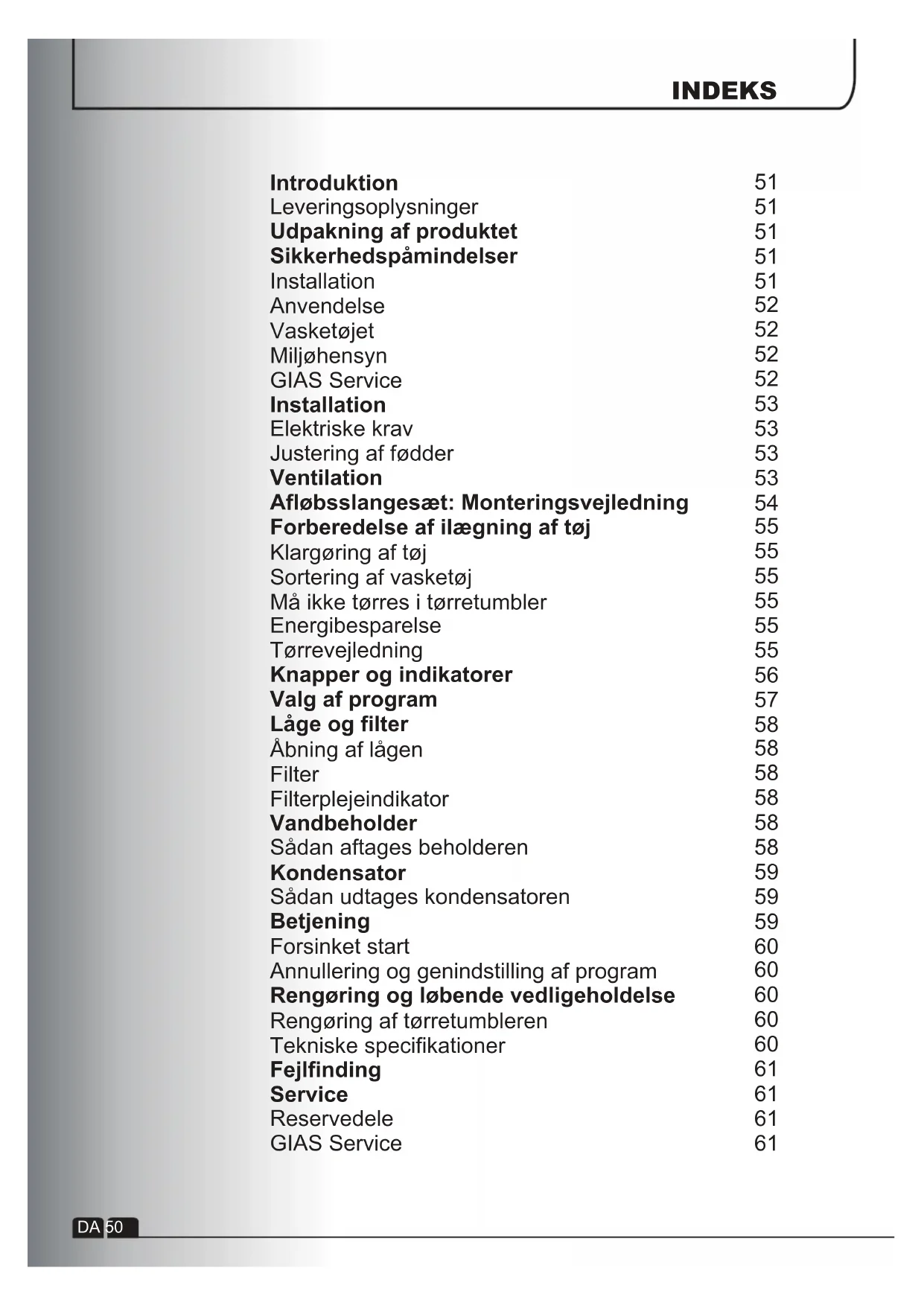 49Introduktion Leveringsoplysninger Udpakning af produktet Sikkerhedspåmindelser Installation Anvendelse Vasketøjet Miljøhensyn GIAS Service Installation Elektriske krav Justering af fødder Ventilation Afløbsslangesæt: Monteringsvejledning Forberedelse af ilægning af tøj Klargøring af tøj Sortering af vasketøj Må ikke tørres i tørretumbler Energibesparelse Tørrevejledning Knapper og indikatorer Valg af program Låge og filter Åbning af lågen Filter Filterplejeindikator Vandbeholder Sådan aftages beholderen Kondensator Sådan udtages kondensatoren Betjening Forsinket start Annullering og genindstilling af program Rengøring og løbende vedligeholdelse Rengøring af tørretumbleren Tekniske specifikationer Fejlfinding Service Reservedele GIAS Service INDEKS DA 50