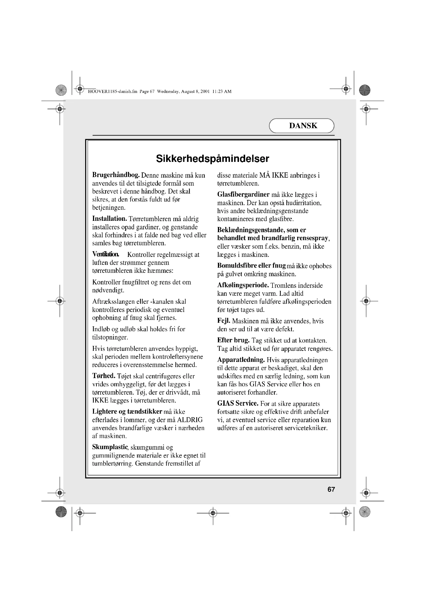 eller væsker som f.eks. benzin, må ikke lægges i maskinen. Bomuldsfibre eller fnug må ikke ophobes på gulvet omkring maskinen. Afkølingsperiode. Tromlens inderside kan være meget varm. Lad altid tørretumbleren fuldføre afkølingsperioden før tøjet tages ud. Fejl. Maskinen må ikke anvendes, hvis den ser ud til at være defekt. Efter brug. Tag stikket ud at kontakten. Tag altid stikket ud før apparatet rengøres. Apparatledning. Hvis apparatledningen til dette apparat er beskadiget, skal den udskiftes med en særlig ledning, som kun kan fås hos GIAS Service eller hos en autoriseret forhandler. GIAS Service. For at sikre apparatets fortsatte sikre og effektive drift anbefaler vi, at eventuel service eller reparation kun udføres af en autoriseret servicetekniker. HOOVER1185-danish.fm Page 67 Wednesday, August 8, 2001 11:23 AMDANSK
