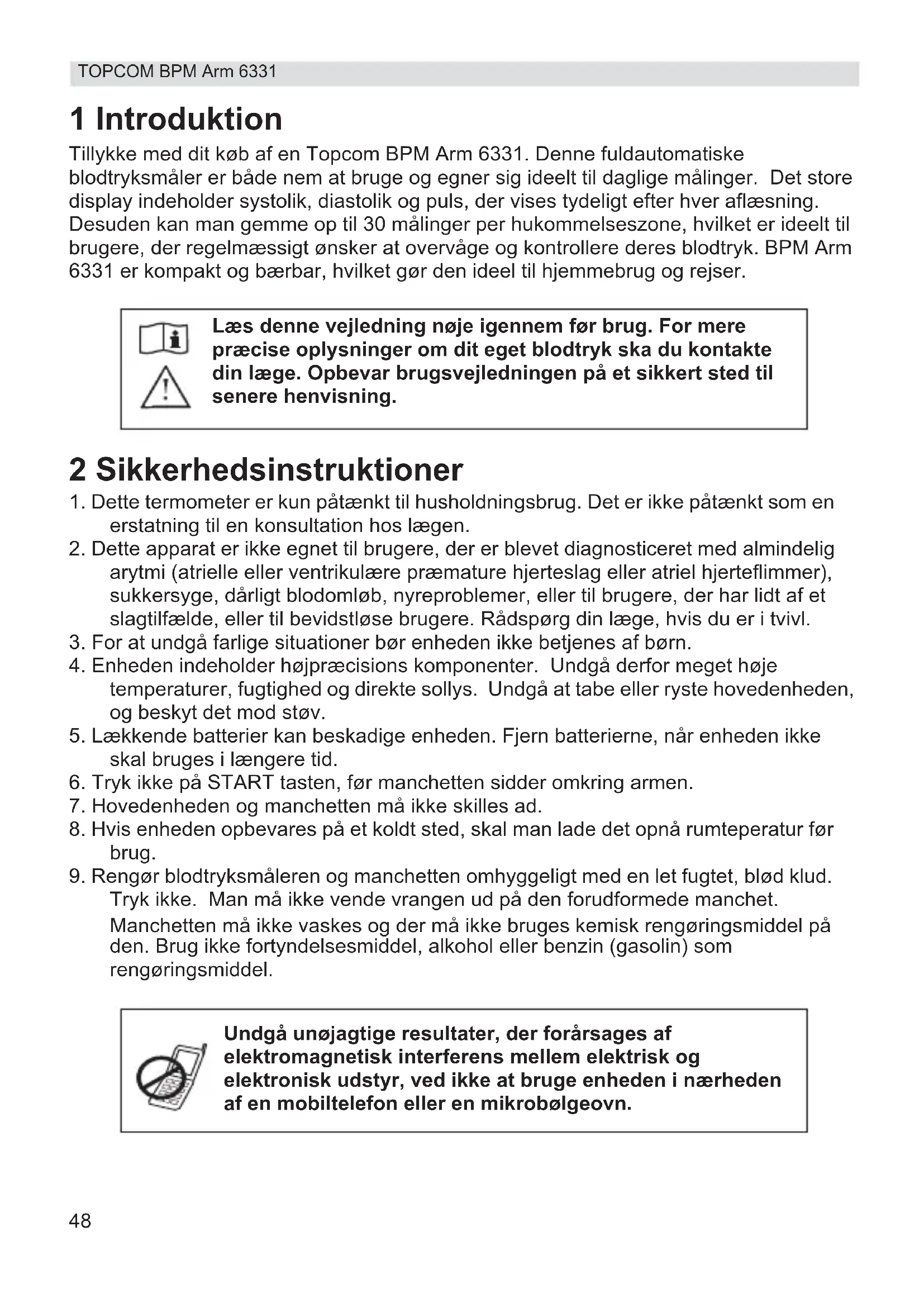 TOPCOM BPM Arm 6331 1 Introduktion Tillykke med dit køb af en Topcom BPM Arm 6331. Denne fuldautomatiske blodtryksmåler er både nem at bruge og egner sig ideelt til daglige målinger. Det store display indeholder systolik, diastolik og puls, der vises tydeligt efter hver aflæsning. Desuden kan man gemme op til 30 målinger per hukommelseszone, hvilket er ideelt til brugere, der regelmæssigt ønsker at overvåge og kontrollere deres blodtryk. BPM Arm 6331 er kompakt og bærbar, hvilket gør den ideel til hjemmebrug og rejser. 2 Sikkerhedsinstruktioner