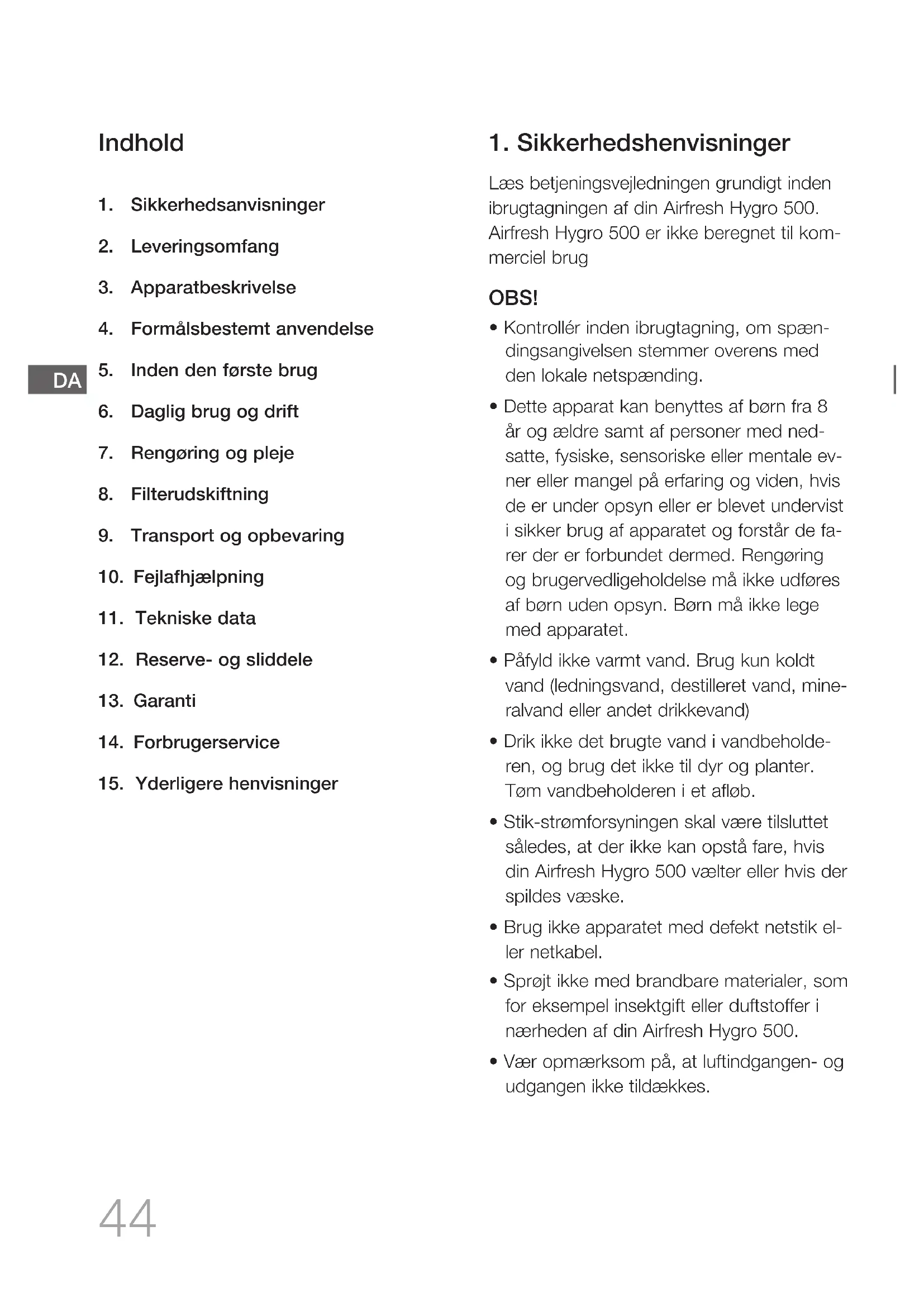 Læs betjeningsvejledningen grundigt inden ibrugtagningen af din Airfresh Hygro 500. Airfresh Hygro 500 er ikke beregnet til kom- merciel brug OBS!